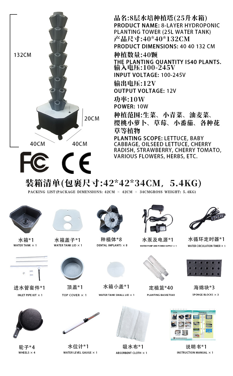 • 회색 8단 수경 재배 타워 (40구) - 25리터
