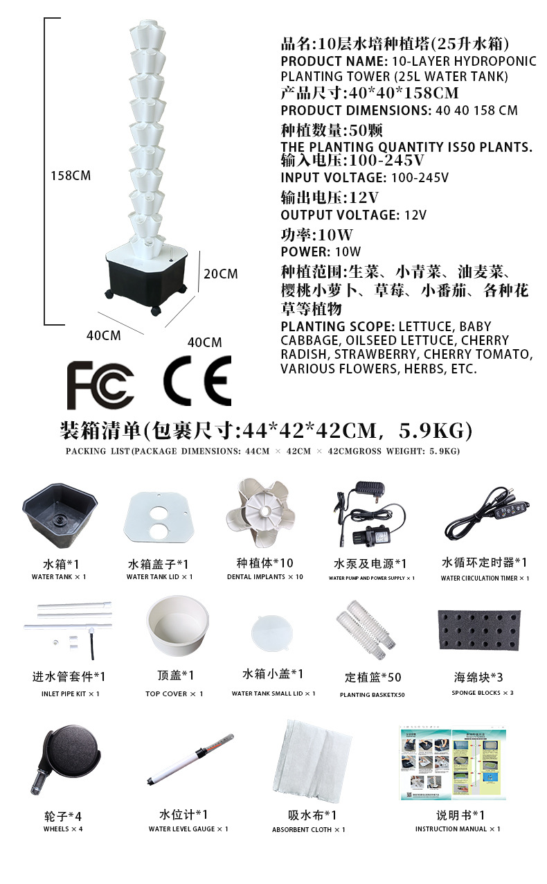 • 화이트 - 10단 수경 재배 타워 (50구) - 25리터