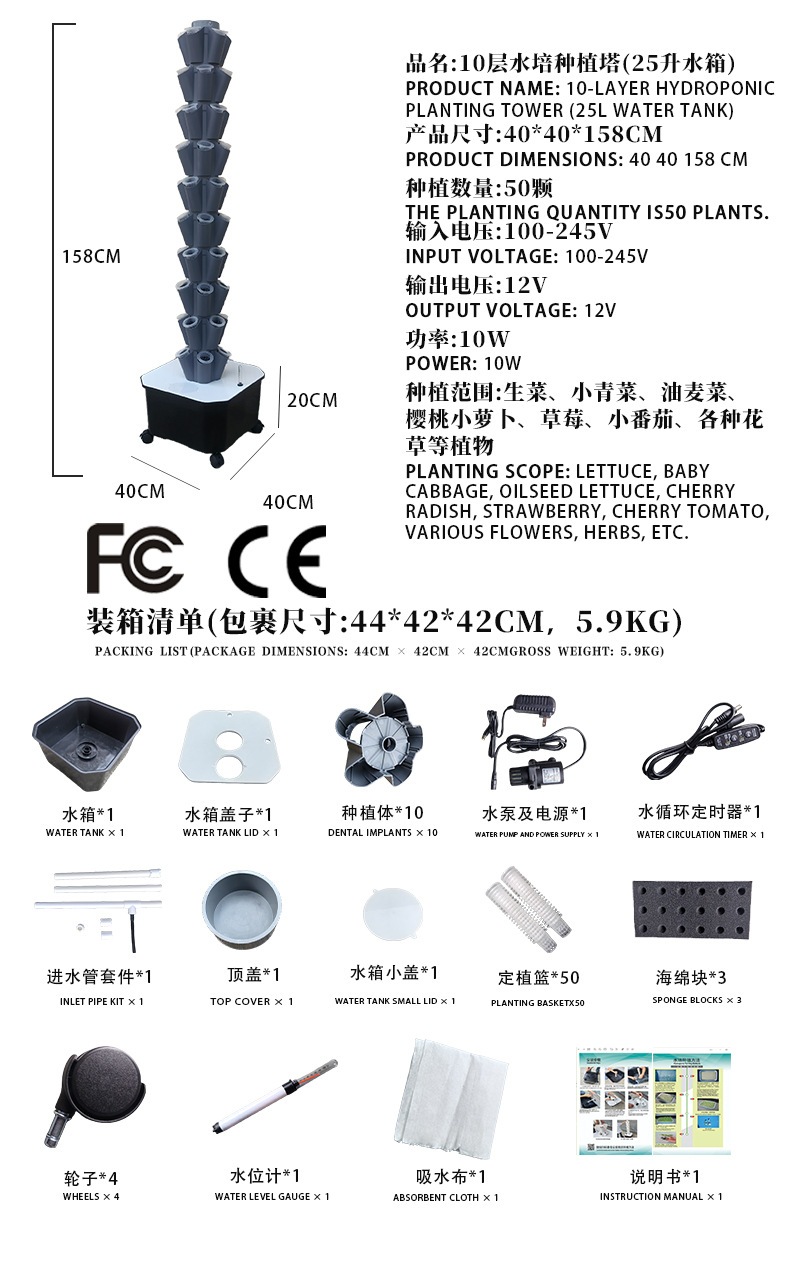 • 회색 - 10단 수경 재배 타워 (50구) - 25리터