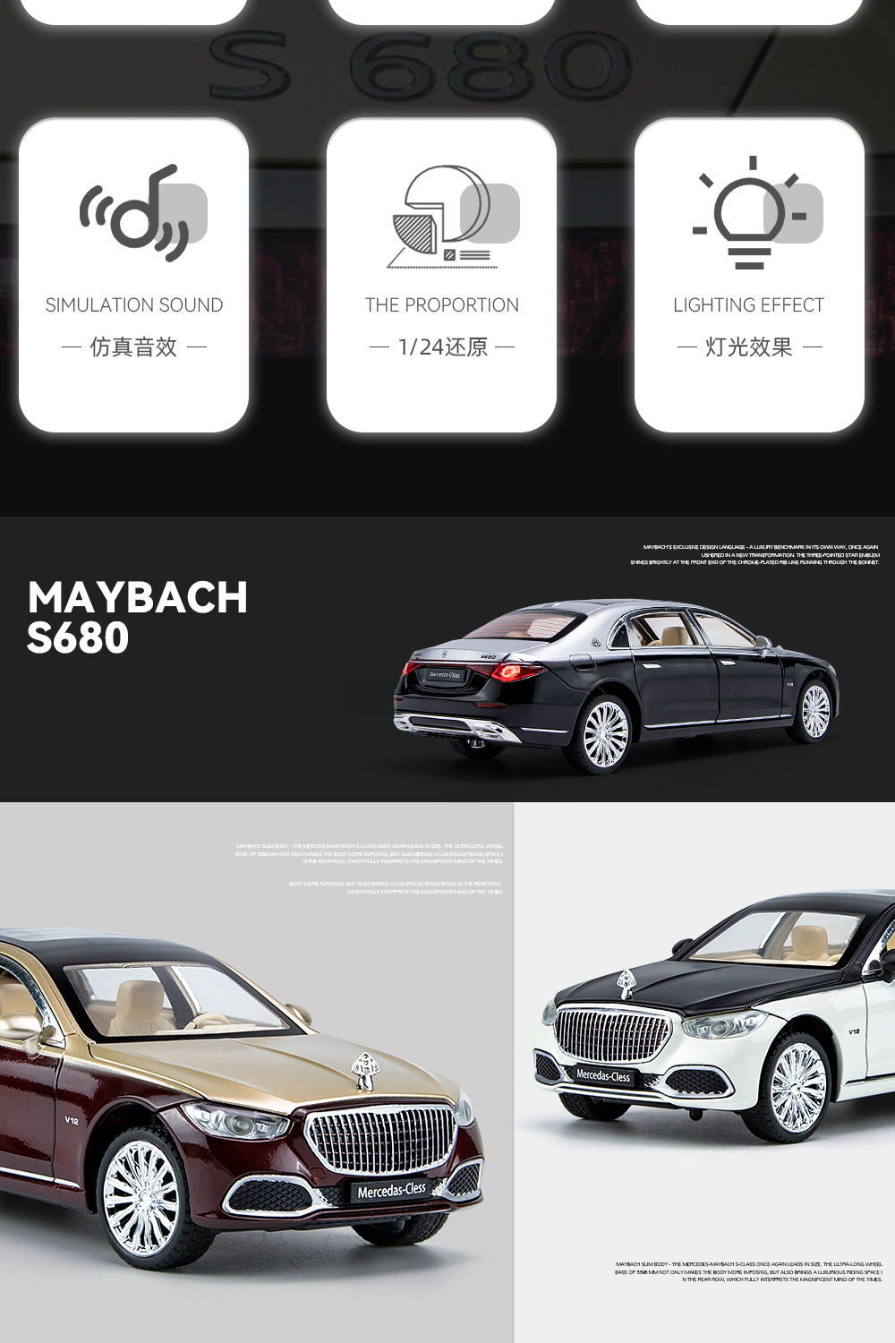 새로운 Haodi C2409 창 상자 Maybach 680 시뮬레이션 1/24 어린이 소리와 빛 풀백 합금 자동차 모델 장난감