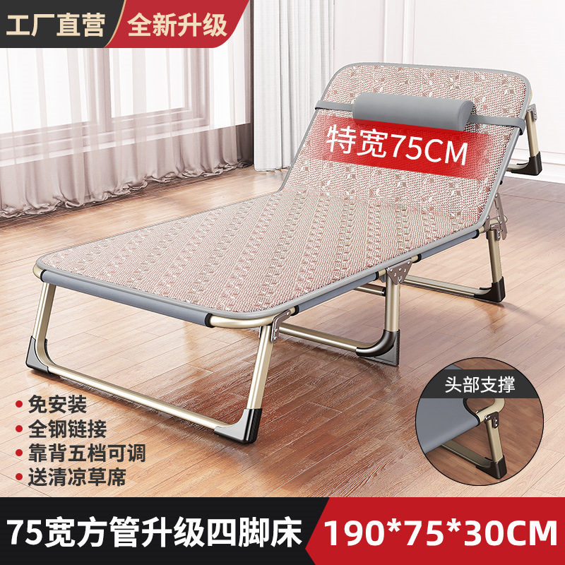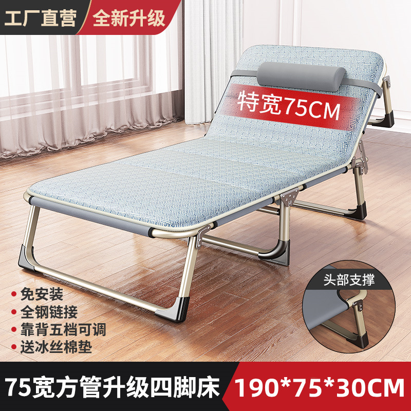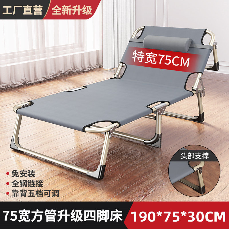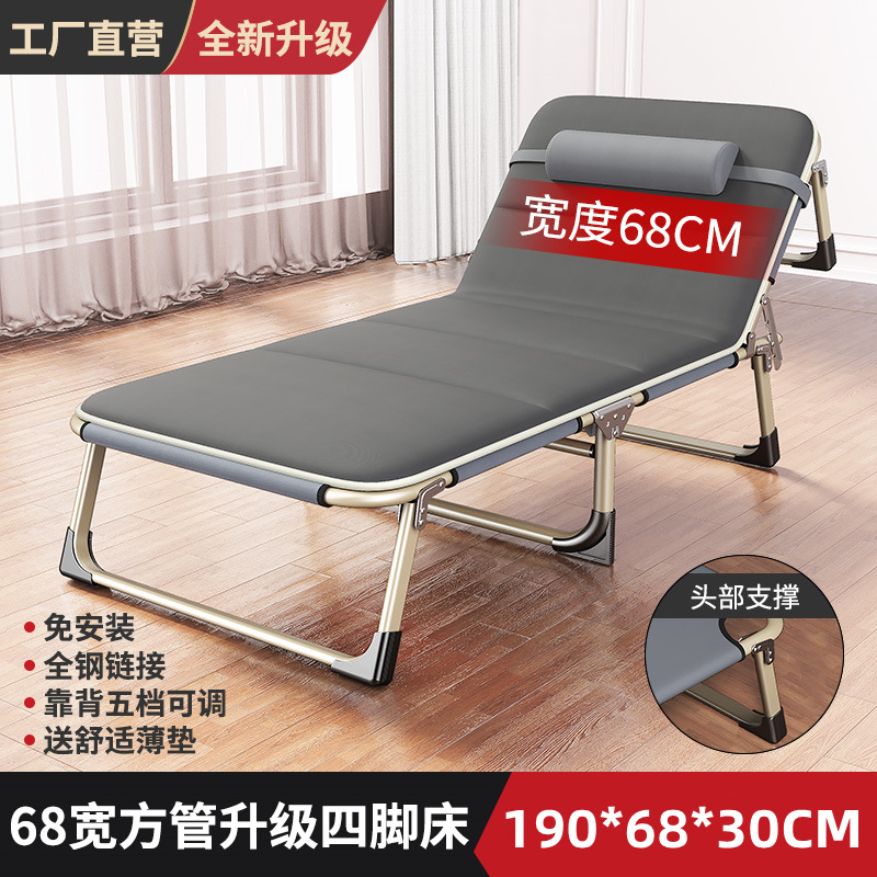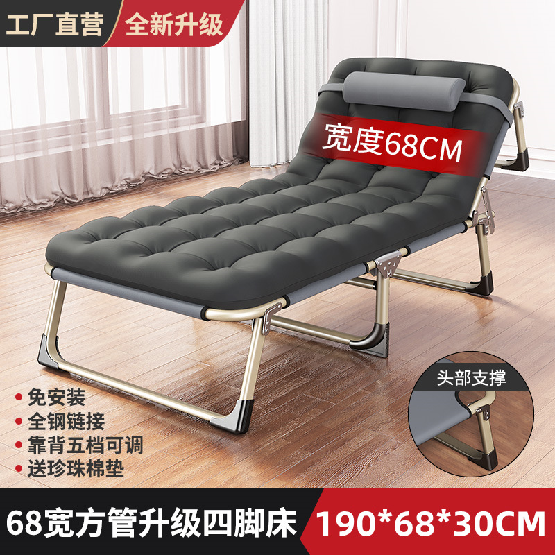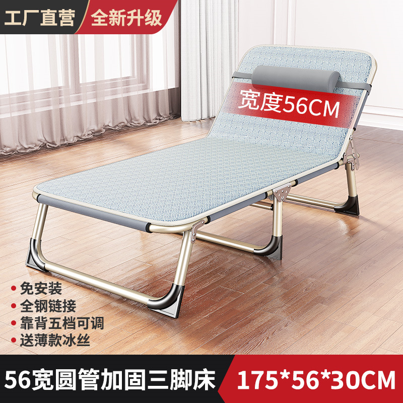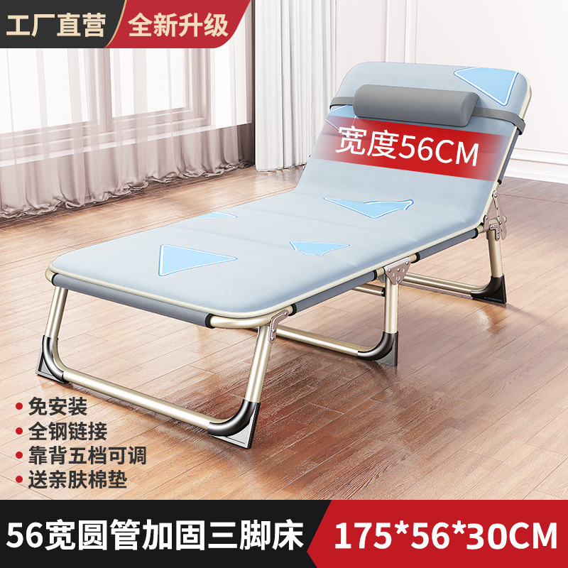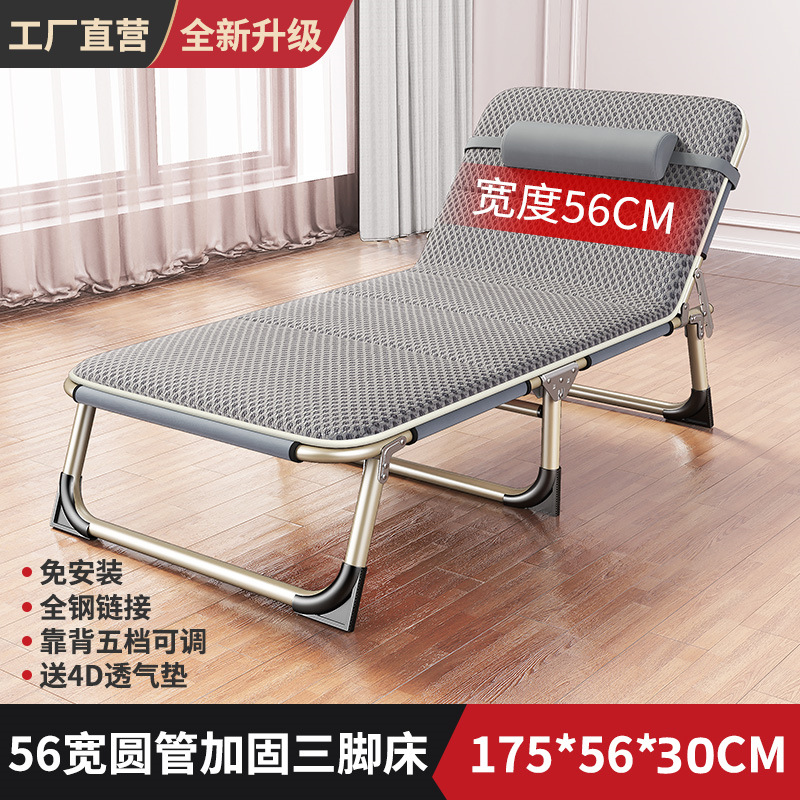 56圆管灰三脚款:175*56*30,68宽扁方管四脚款:190*68*30cm,75宽全扁方管四脚款:190*75*30cm。常规款床面为牛津布床面,四脚款的为头部多一只承重支撑脚,共4条支撑脚。三脚的头部无支撑脚,共3条支撑脚。圆管口径22mm,厚度0.7mm,方管25mm,厚度0.7mm。