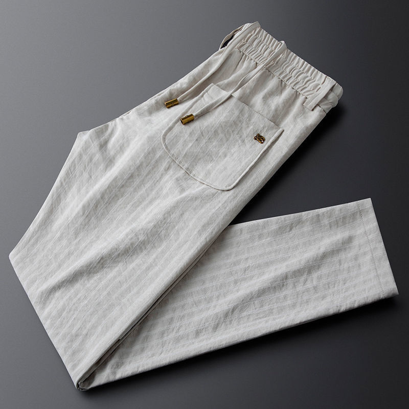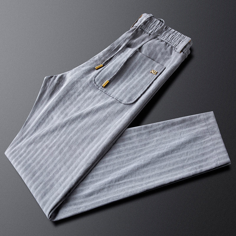 가벼운 럭셔리 여름 얇은 아이스 실크 바지 남성용 모든 매치 루즈한 스트라이프 트렌디 브랜드 스포츠 스트레이트 남성 세트 캐주얼 바지
