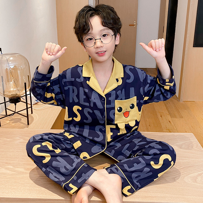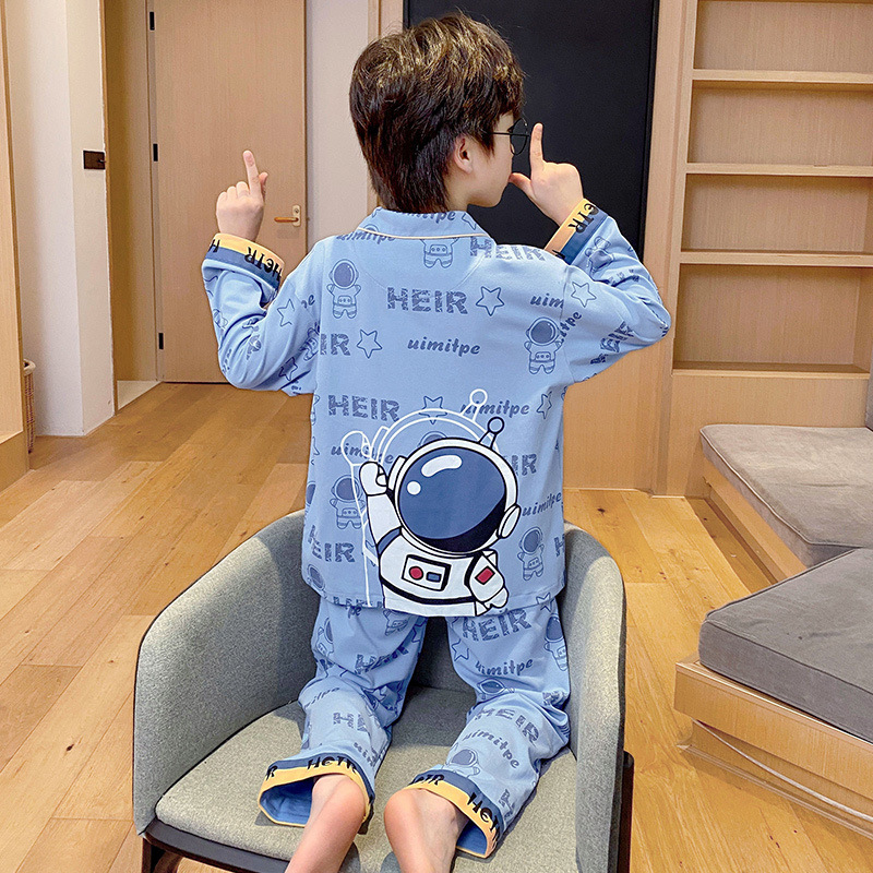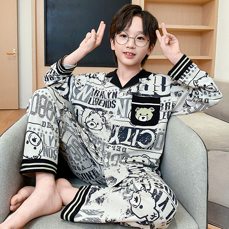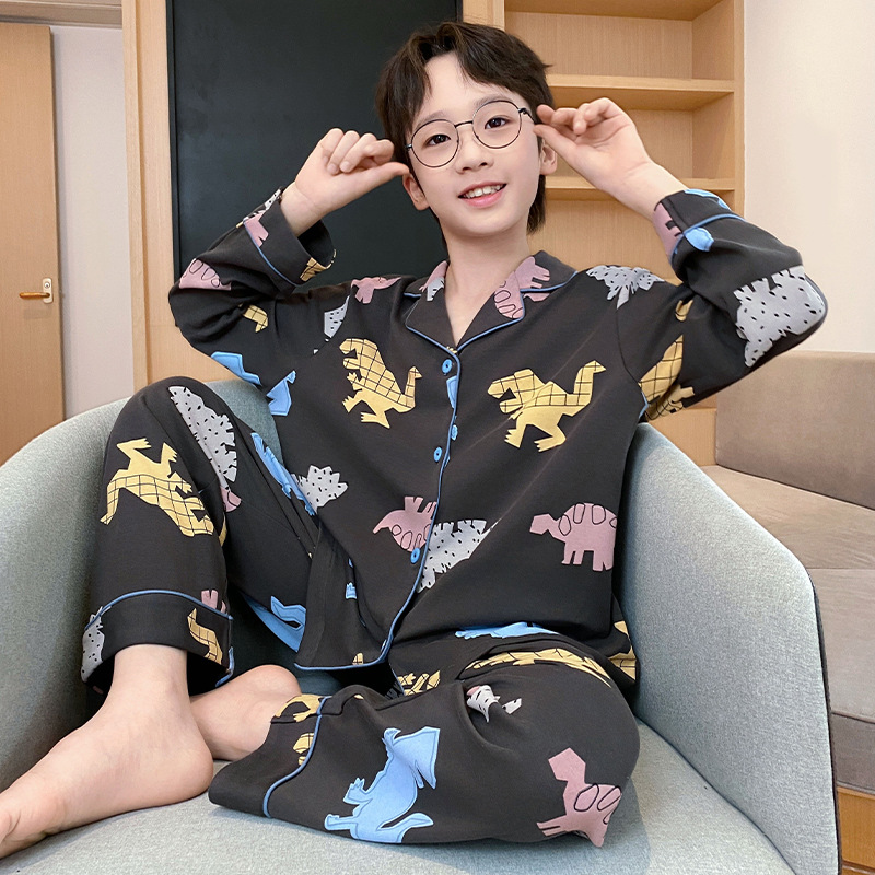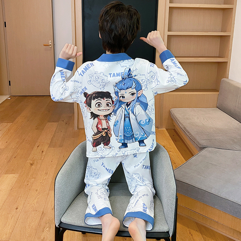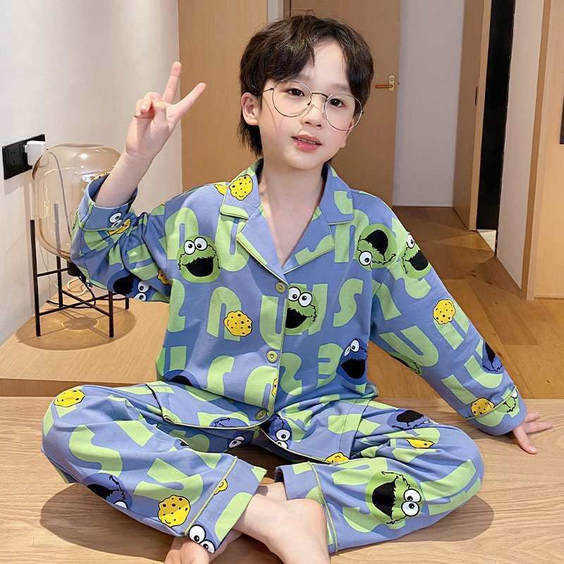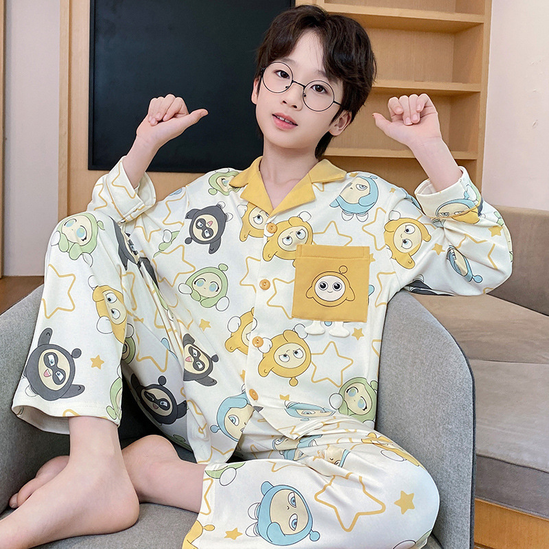 어린이 잠옷 면 긴팔 봄과 가을 얇은 슈퍼 귀여운 어린 소년과 더 오래된 어린이를위한 복장 가정 옷을 입고 세트 면스토어 가기