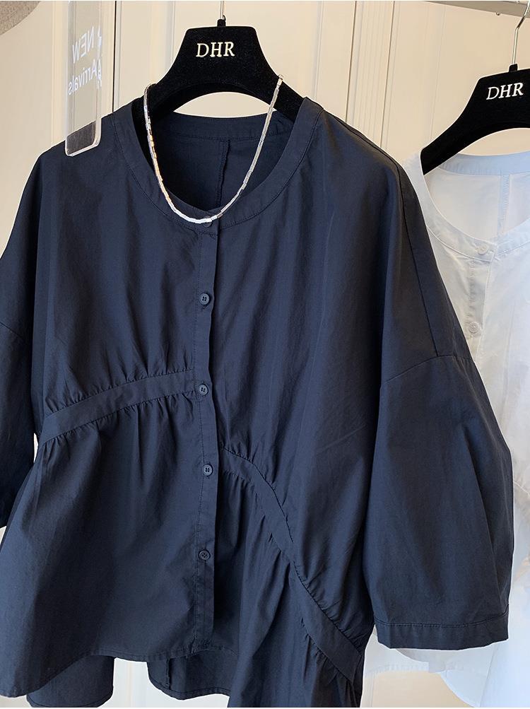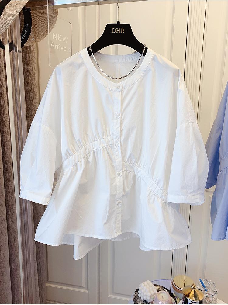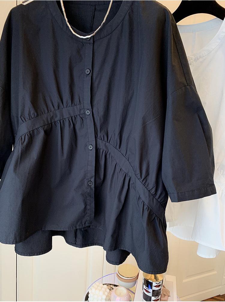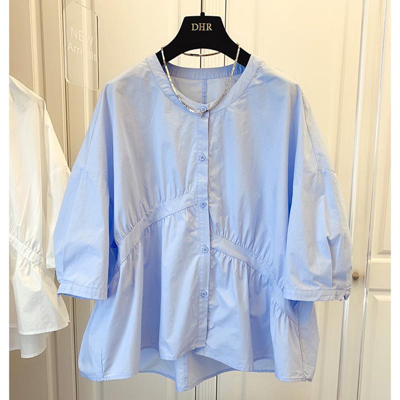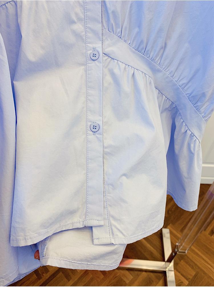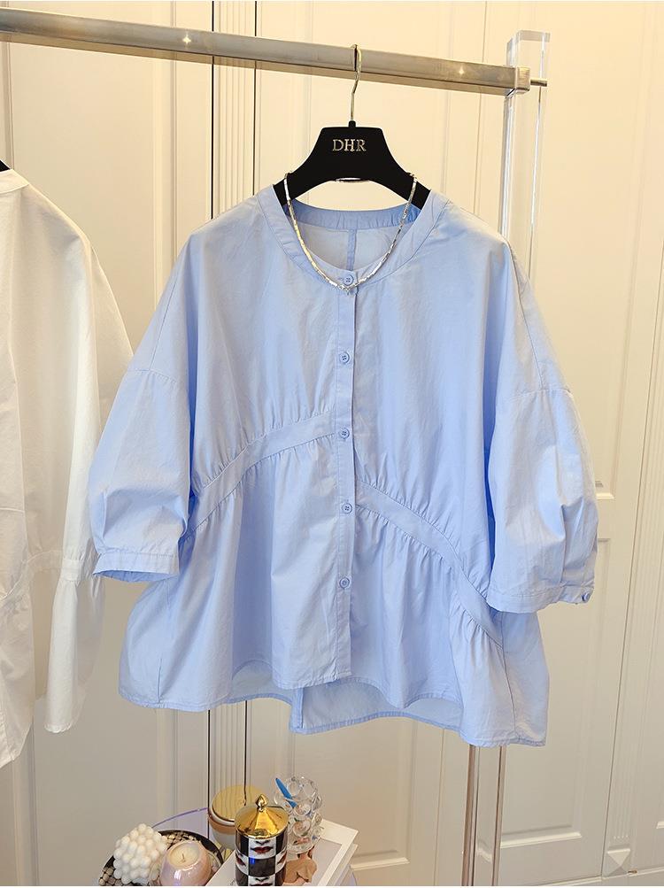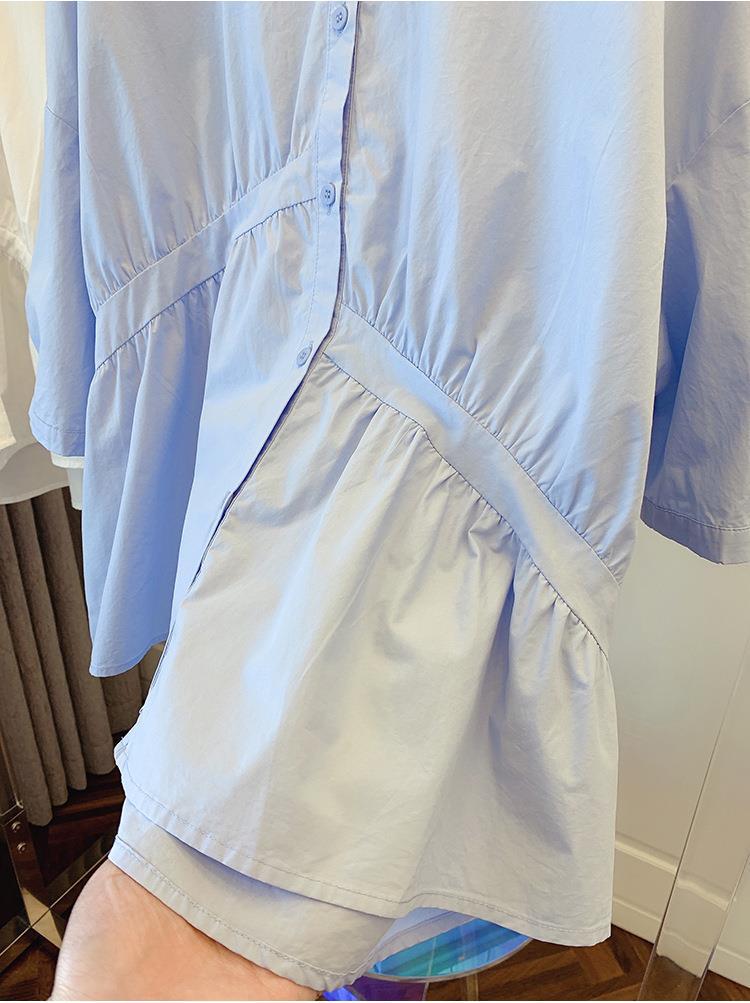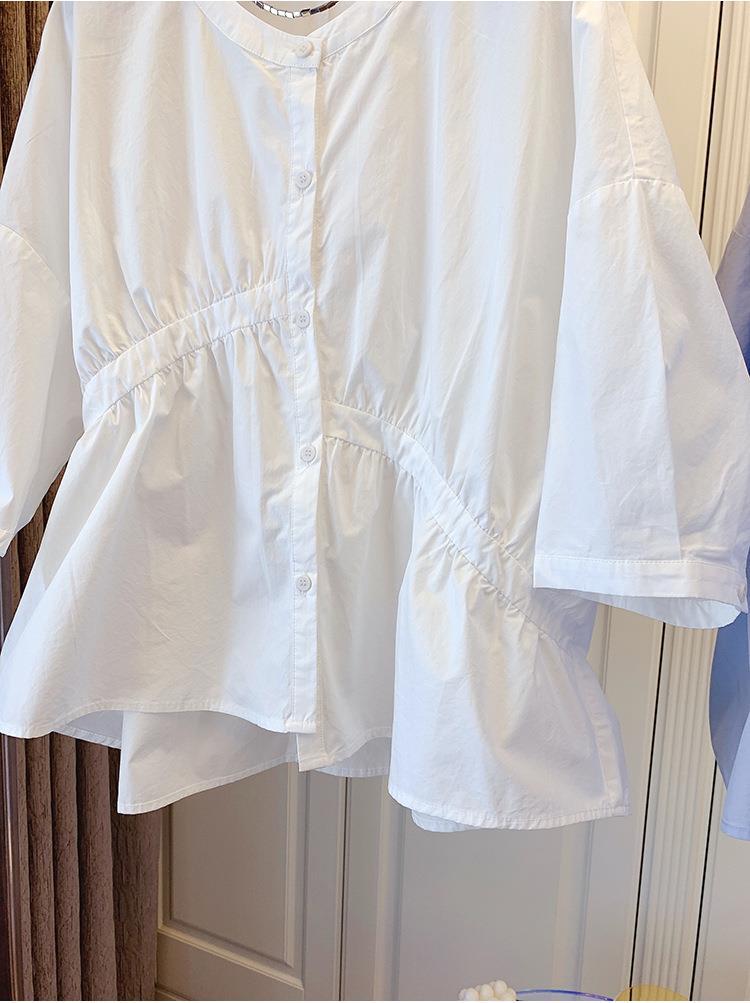 1688 여름 한국 스타일 작은 사이즈 루즈핏 비대칭 주름 스플라이싱 베이비돌 셔츠 여성 트렌디 디자인 반팔
