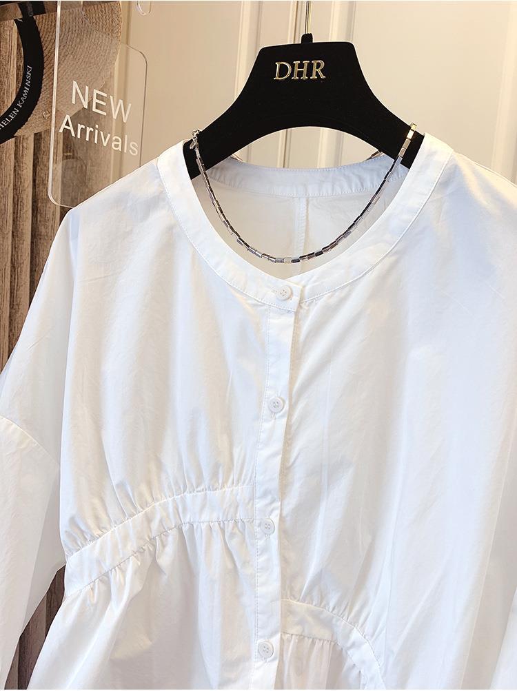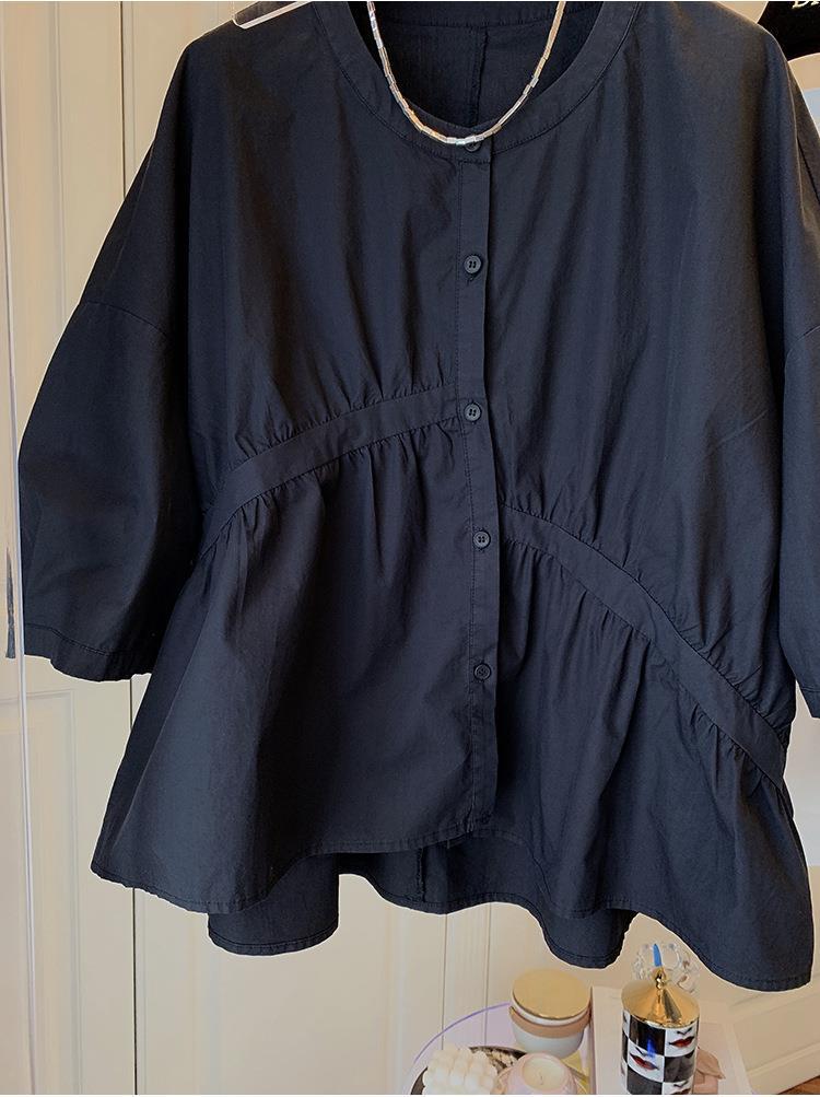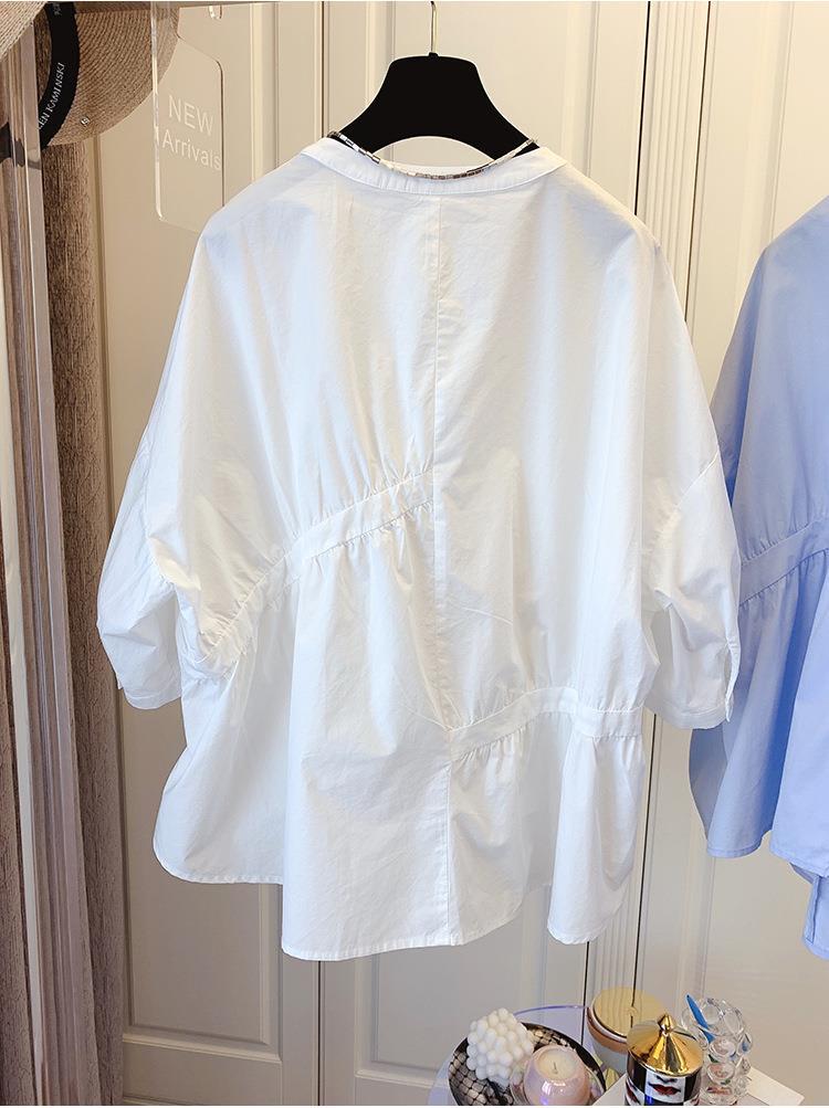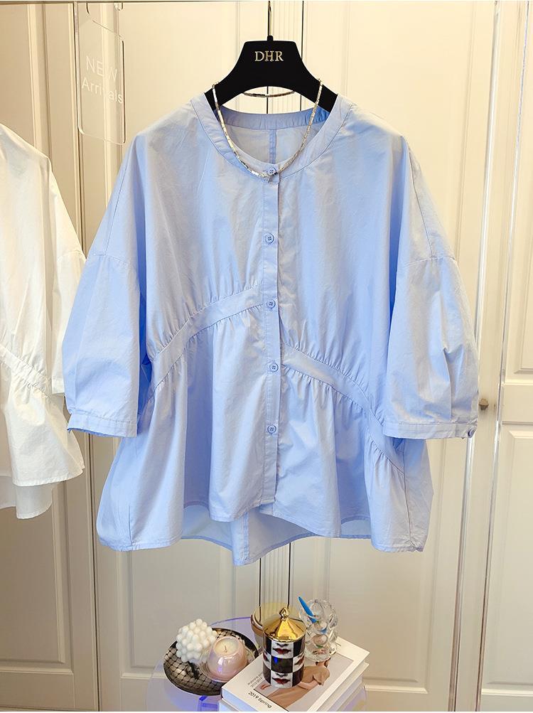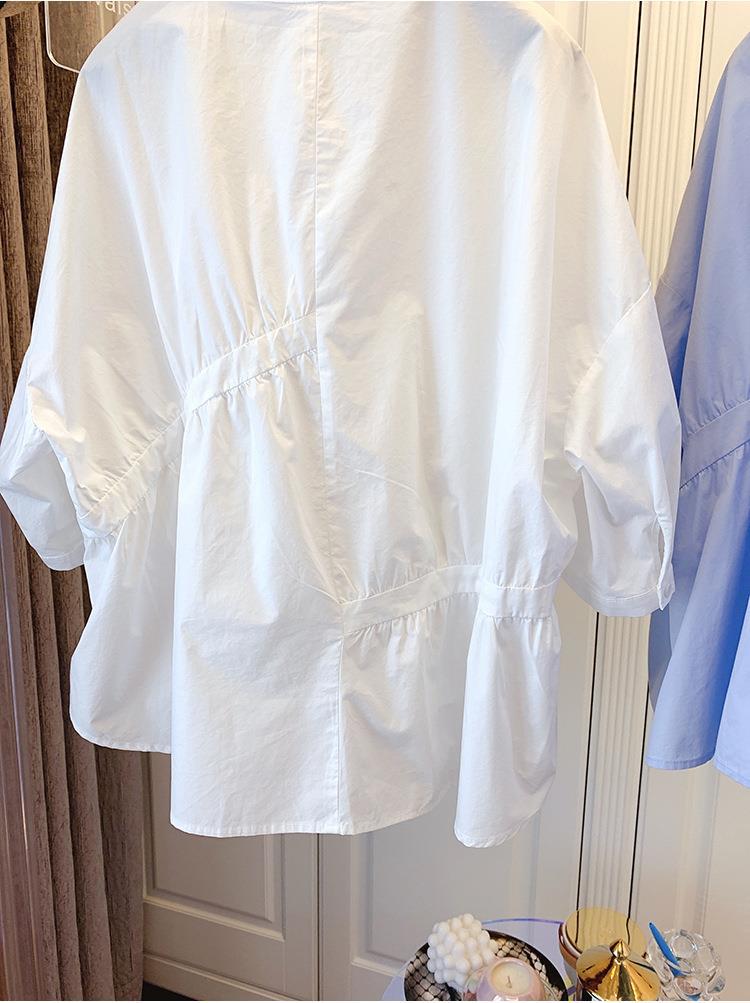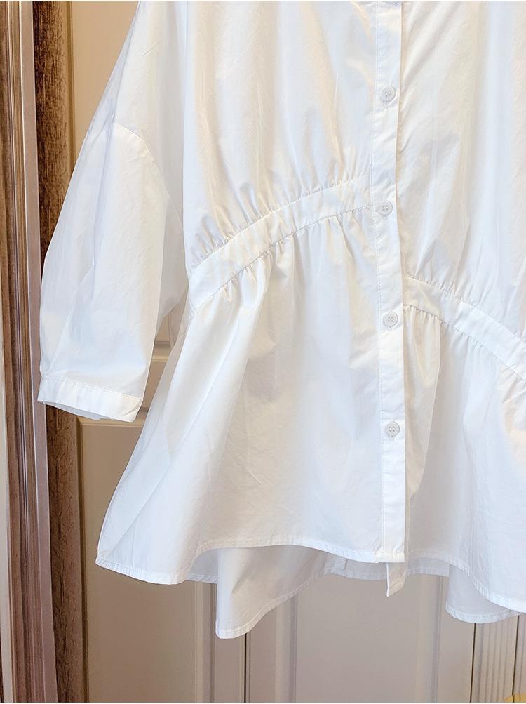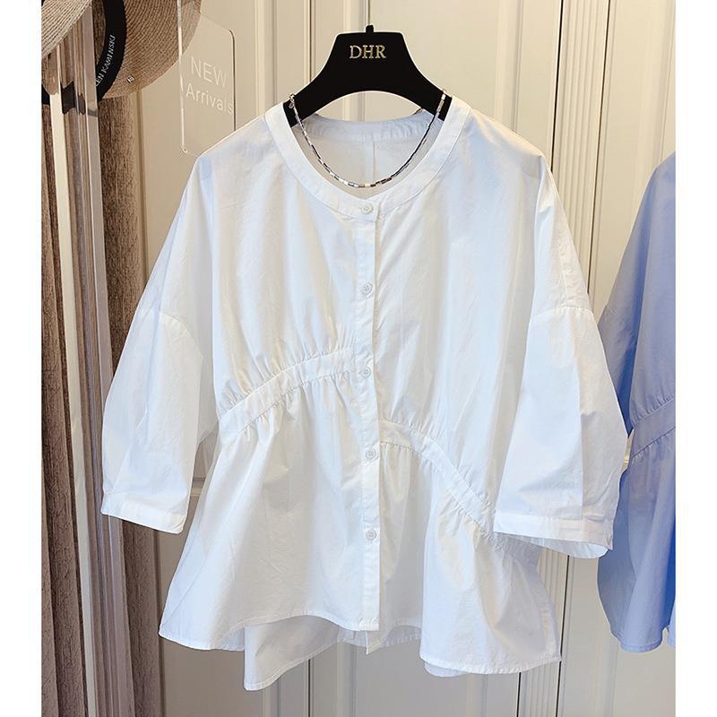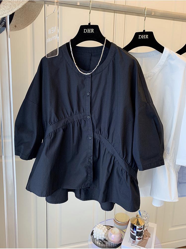 1688 여름 한국 스타일 작은 사이즈 루즈핏 비대칭 주름 스플라이싱 베이비돌 셔츠 여성 트렌디 디자인 반팔