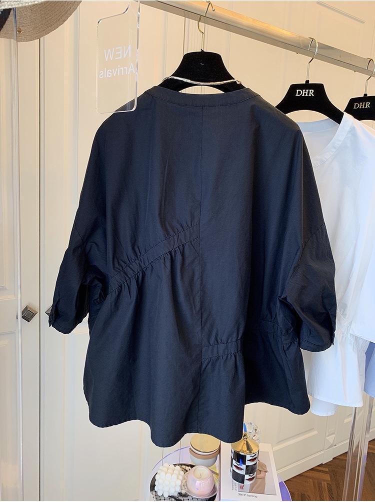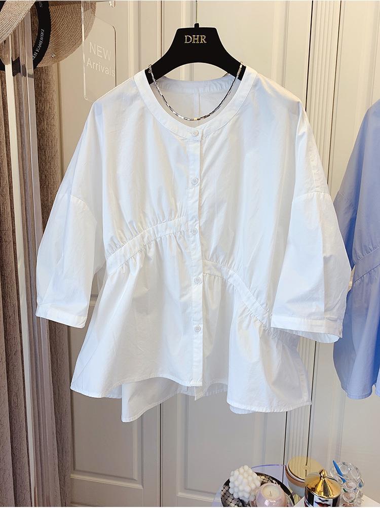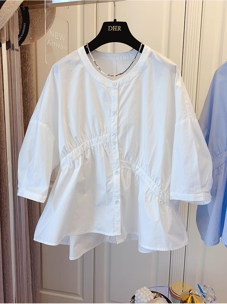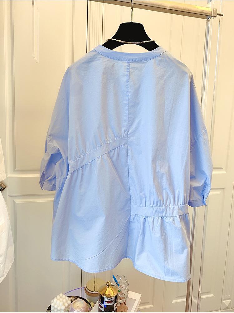 1688 여름 한국 스타일 작은 사이즈 루즈핏 비대칭 주름 스플라이싱 베이비돌 셔츠 여성 트렌디 디자인 반팔스토어 가기