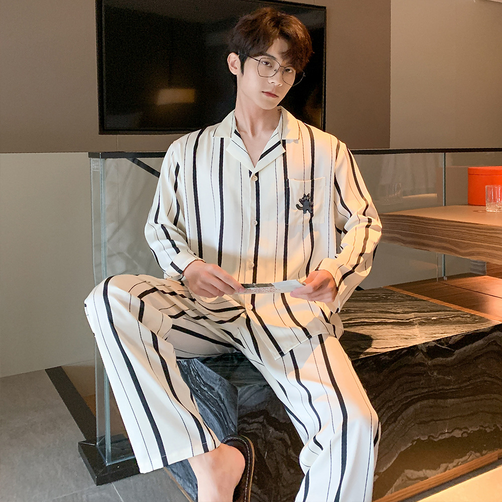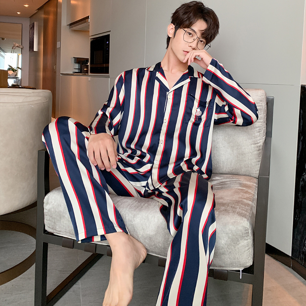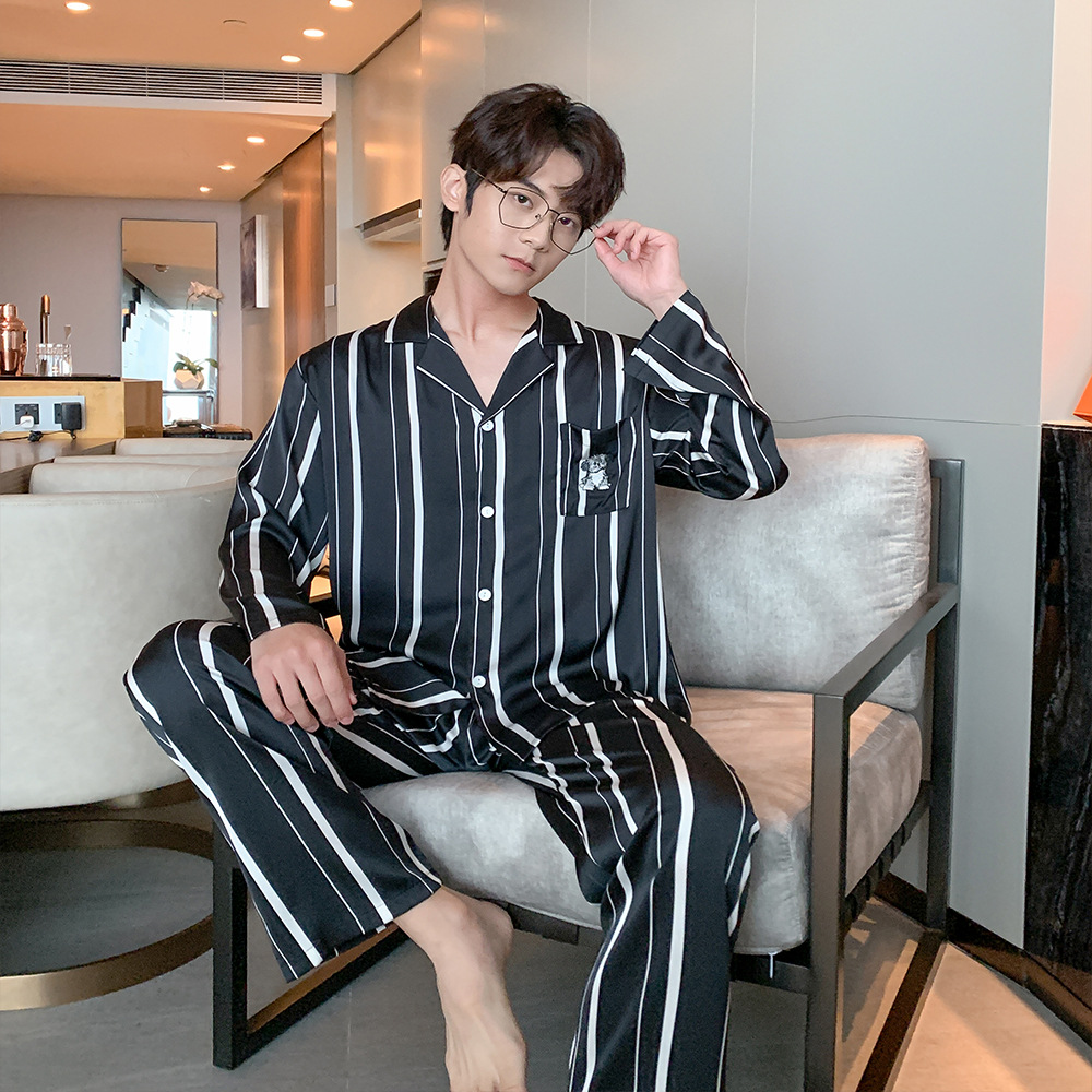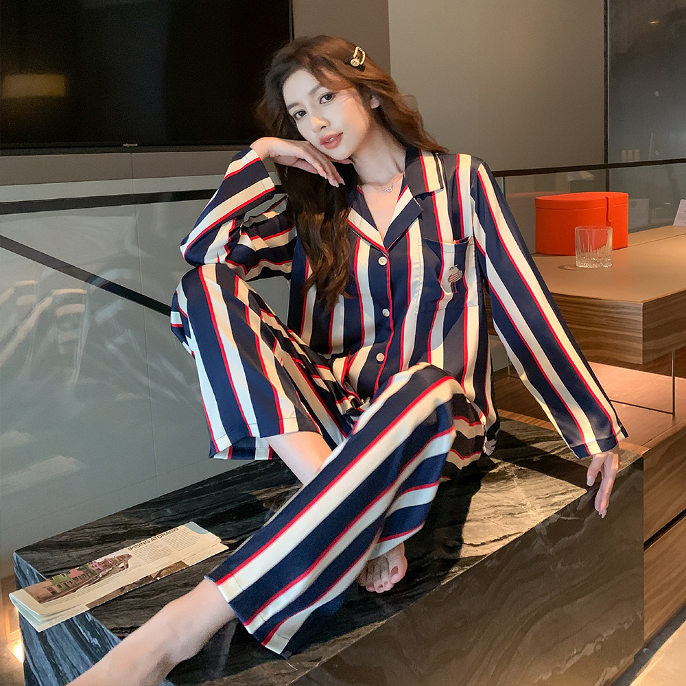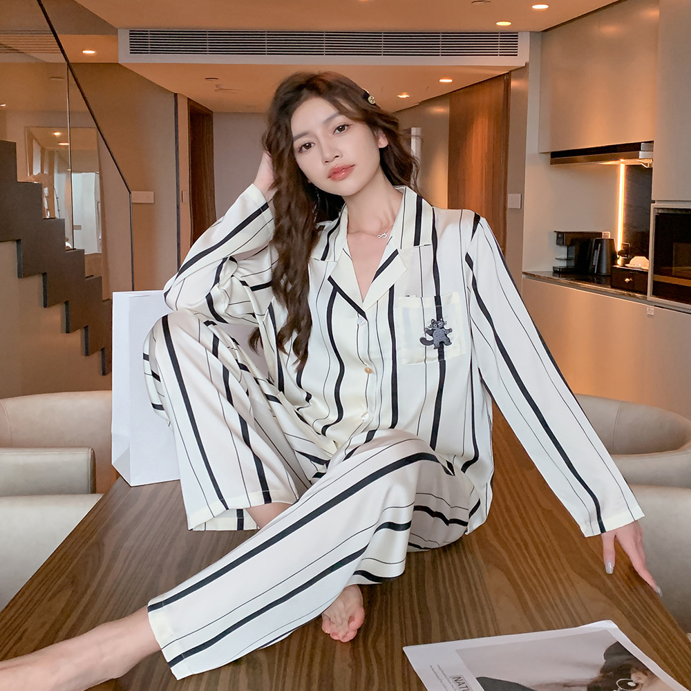 소스 공장 용품 커플 잠옷 여성 가을과 겨울 새로운 패션 스트라이프 아이스 실크 투피스 라이브 홈 의류 제조 업체