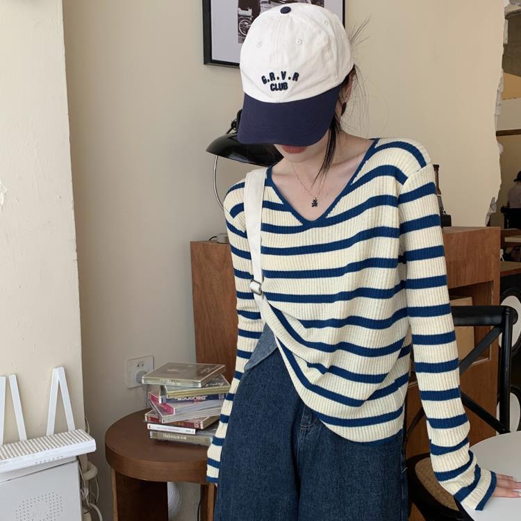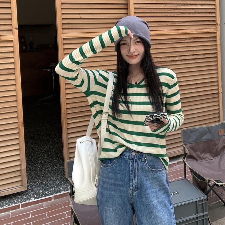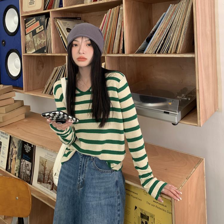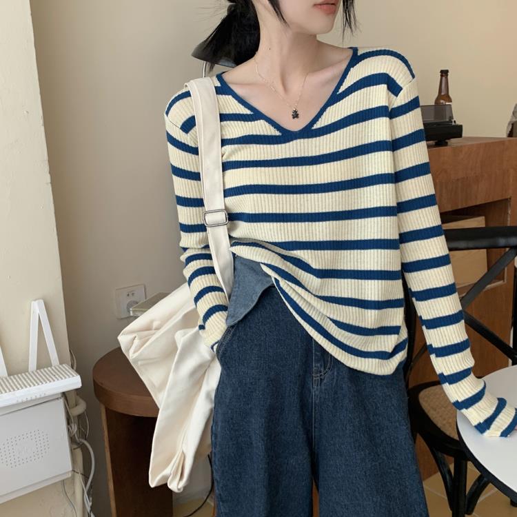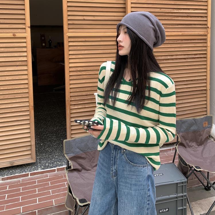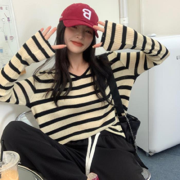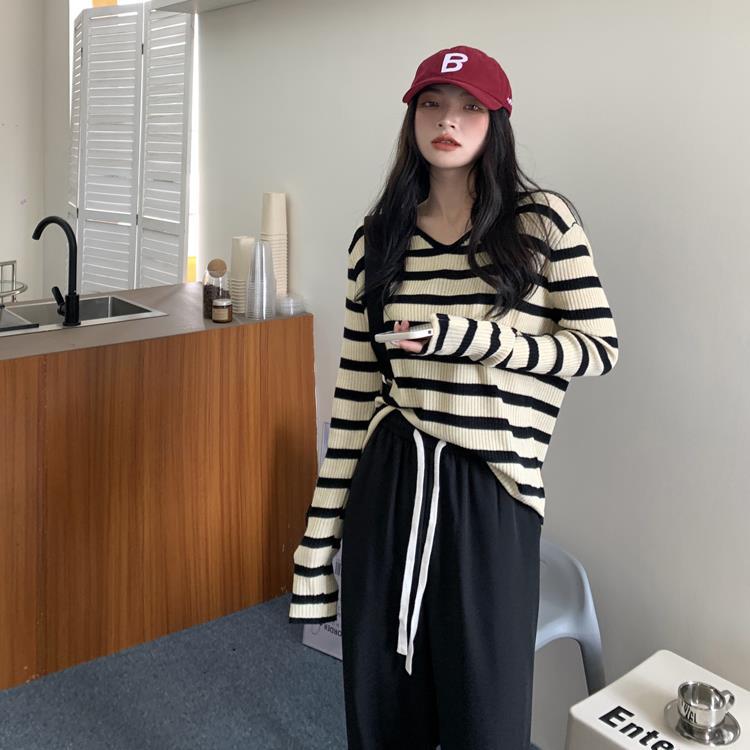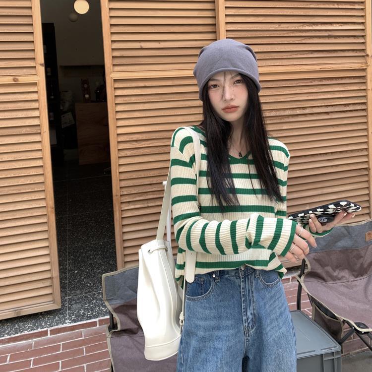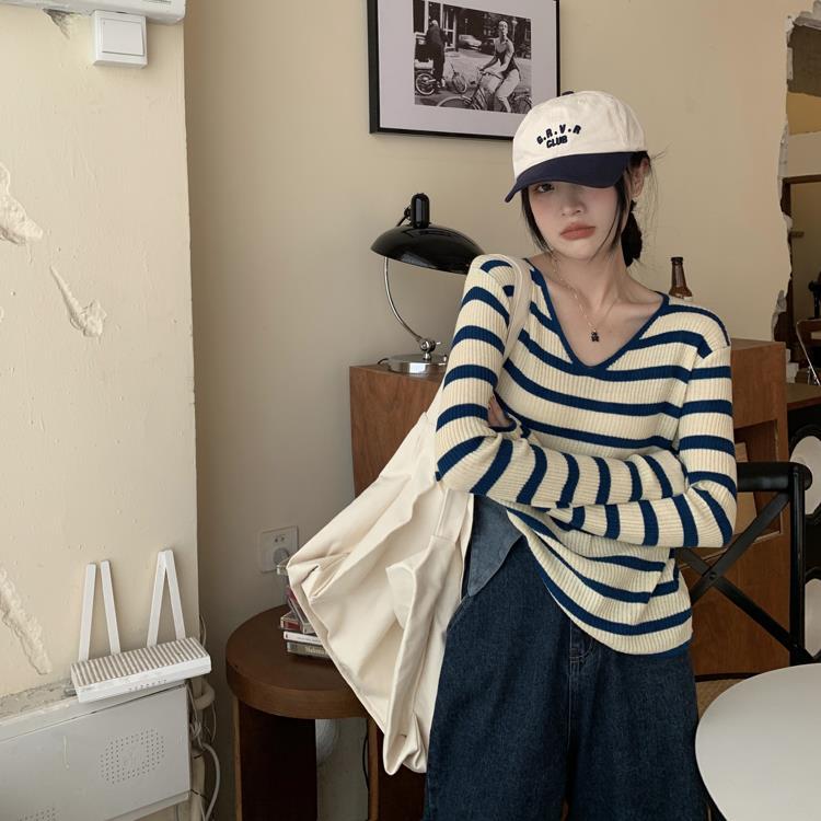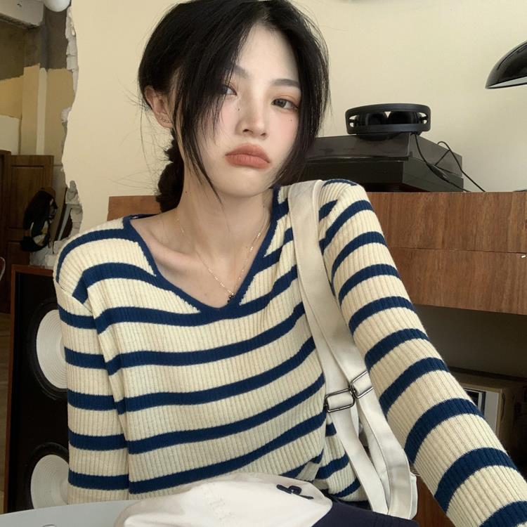 여성용 V넥 스트라이프 니트 스웨터, 스타일리시한 이너웨어, 2025년 여름 초가을 신상, 디자인감 있는 긴팔 상의스토어 가기