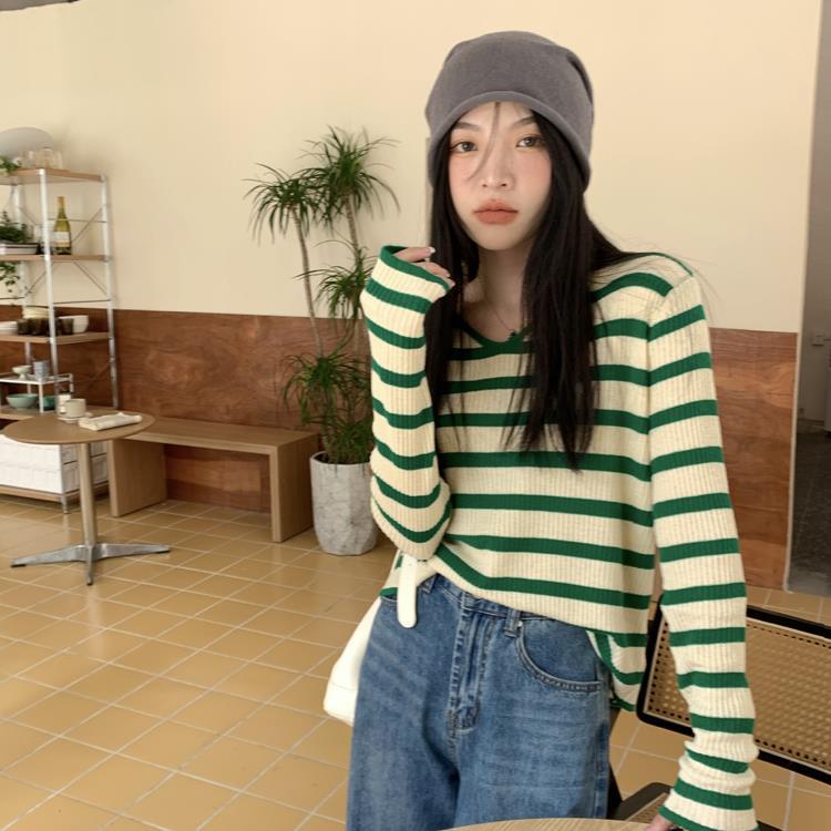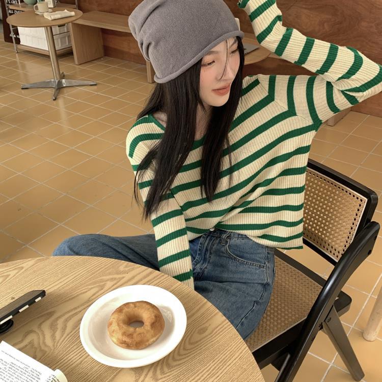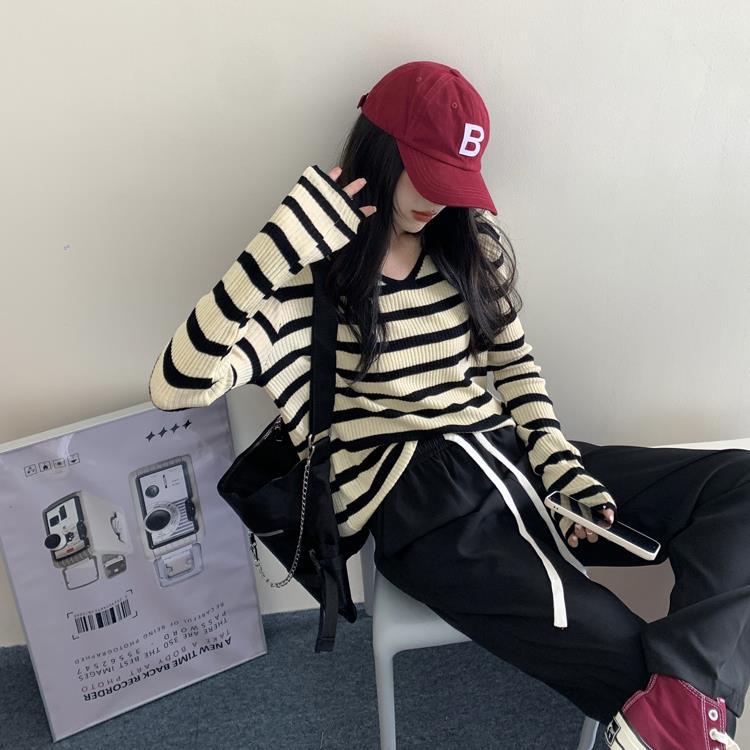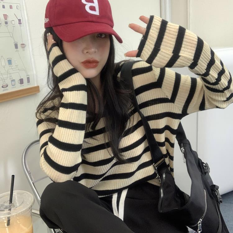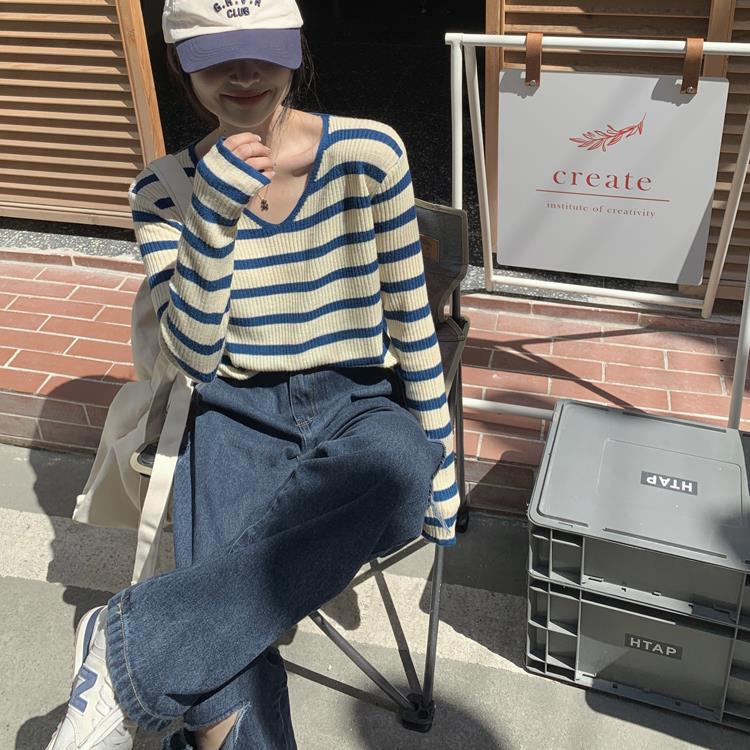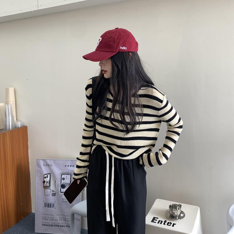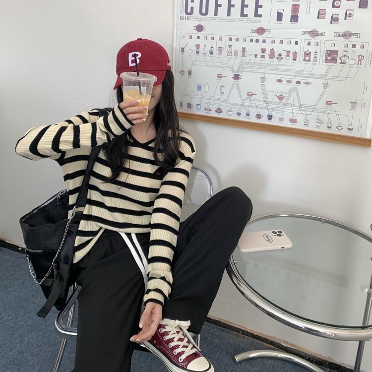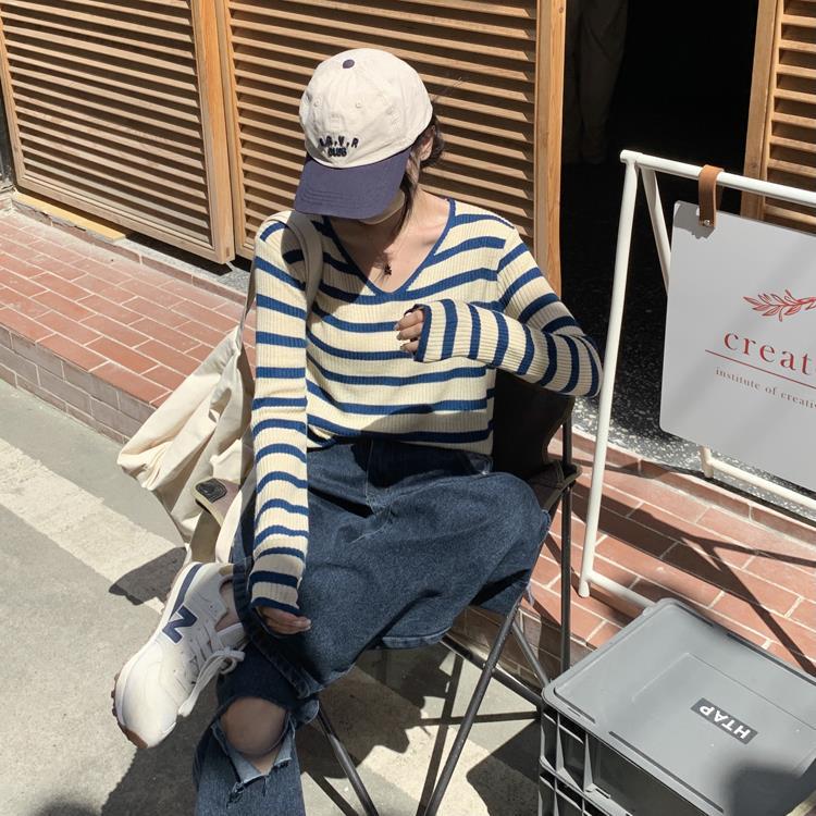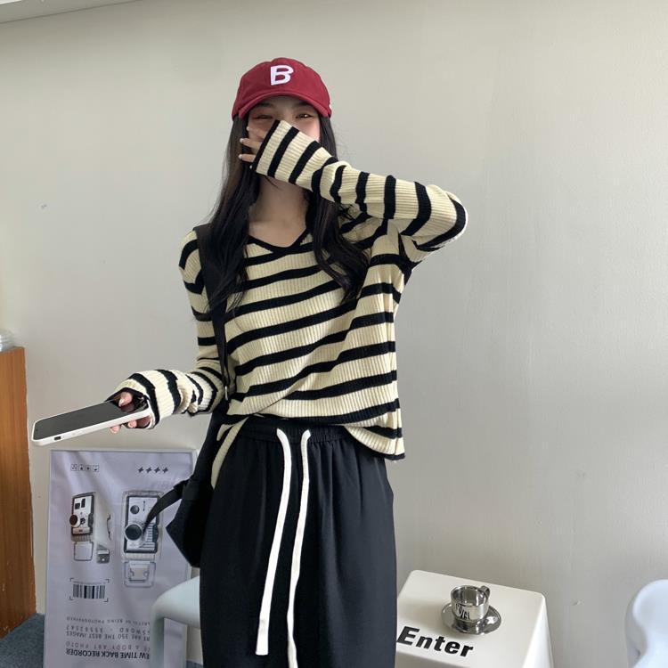 여성용 V넥 스트라이프 니트 스웨터, 스타일리시한 이너웨어, 2025년 여름 초가을 신상, 디자인감 있는 긴팔 상의스토어 가기