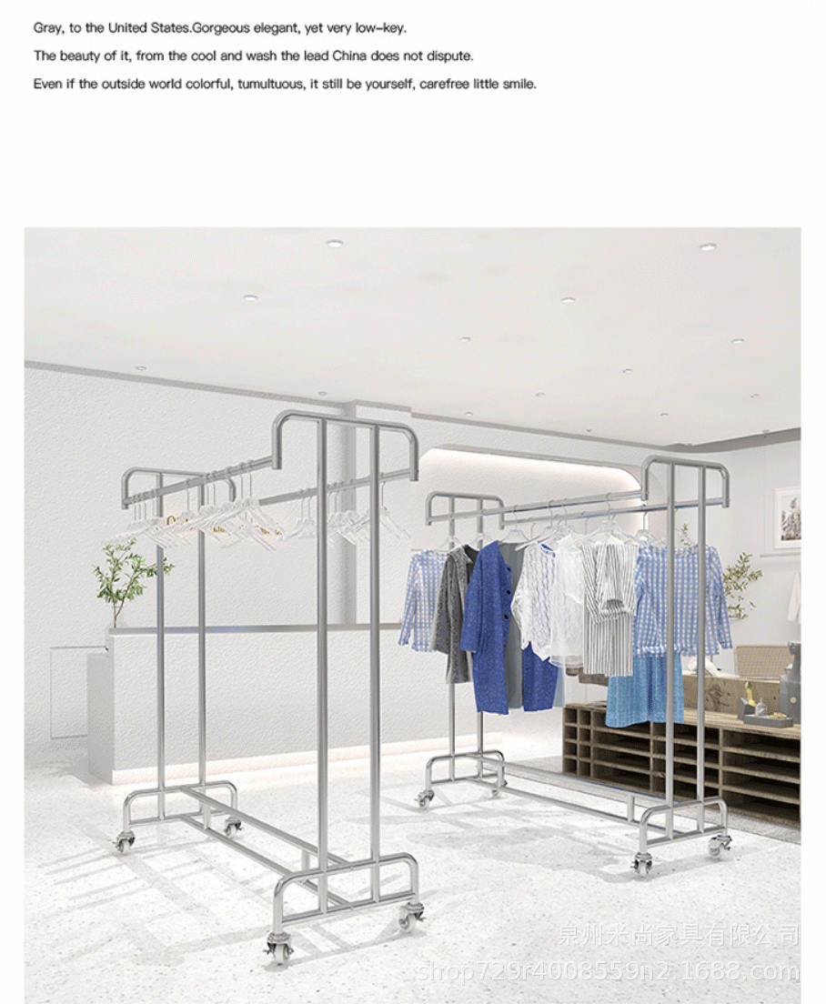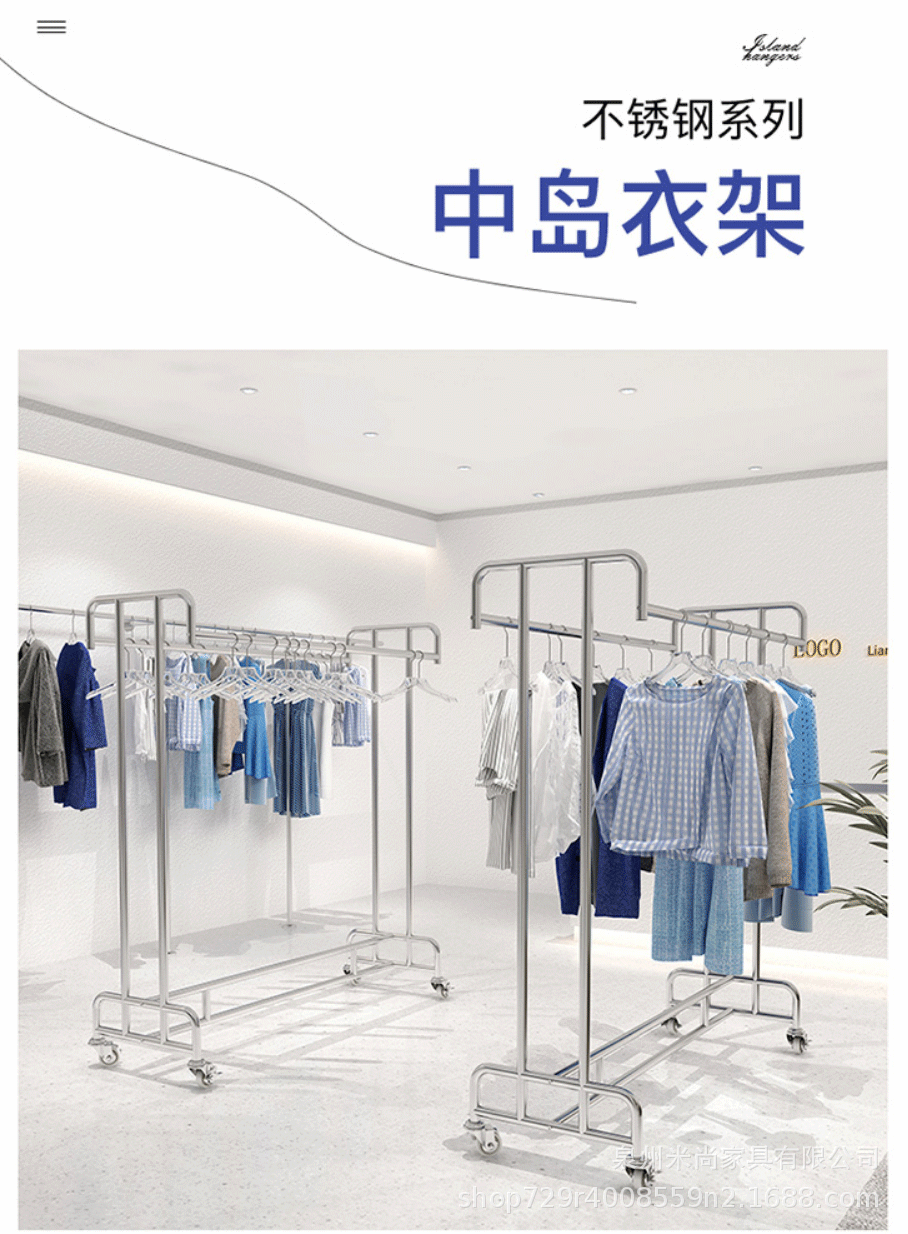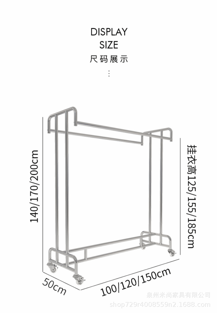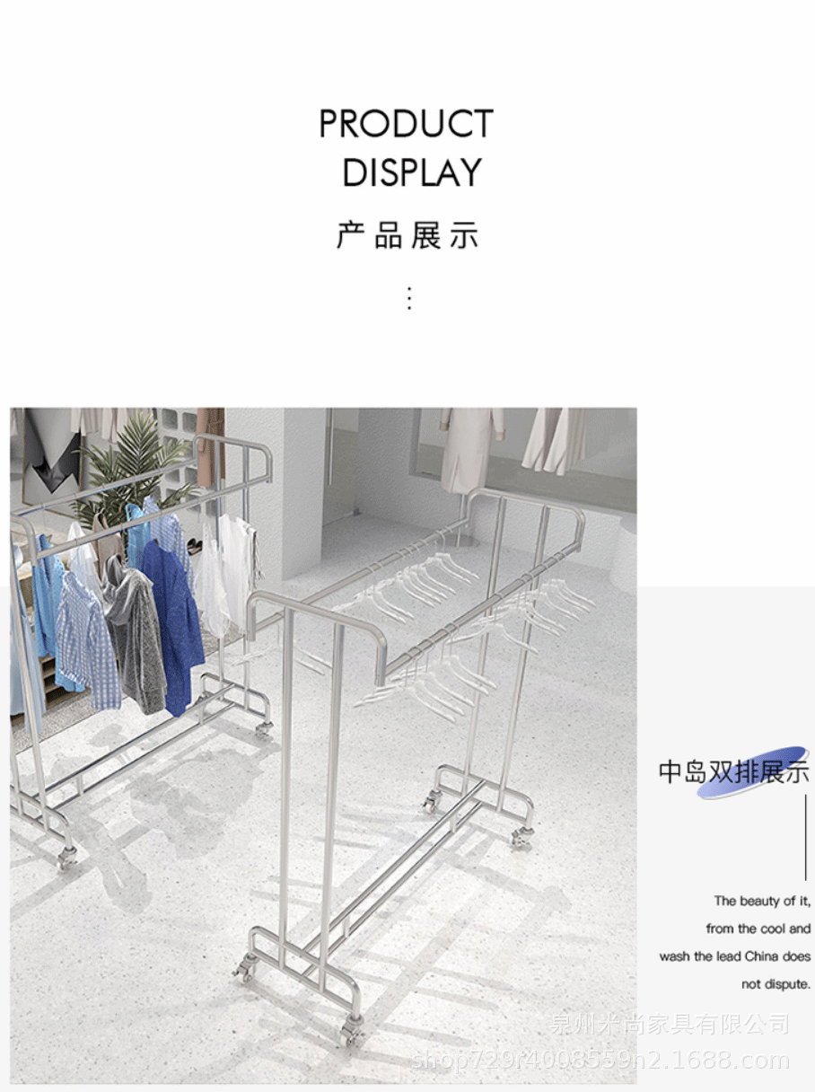 스테인리스 센터 아일랜드 디스플레이 랙, 바닥 걸이형 옷걸이, 이중 선반 진열대, 이중 바 센터 아일랜드 랙, 이동식 선반스토어 가기