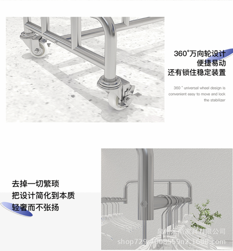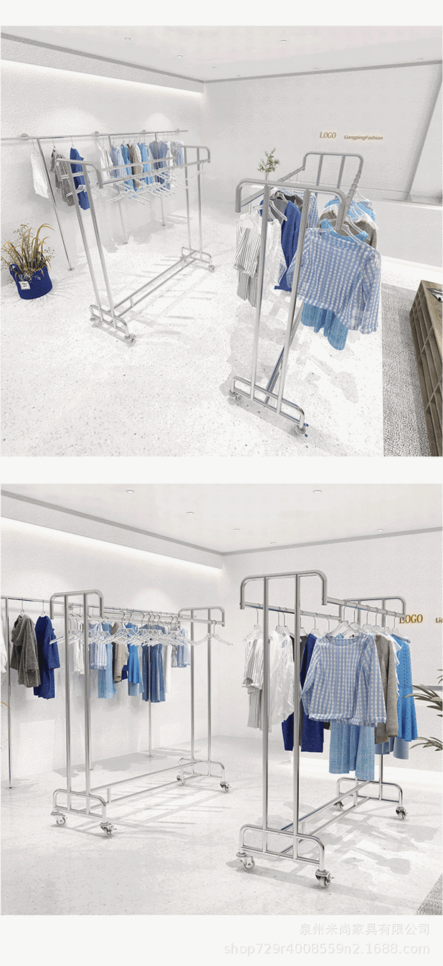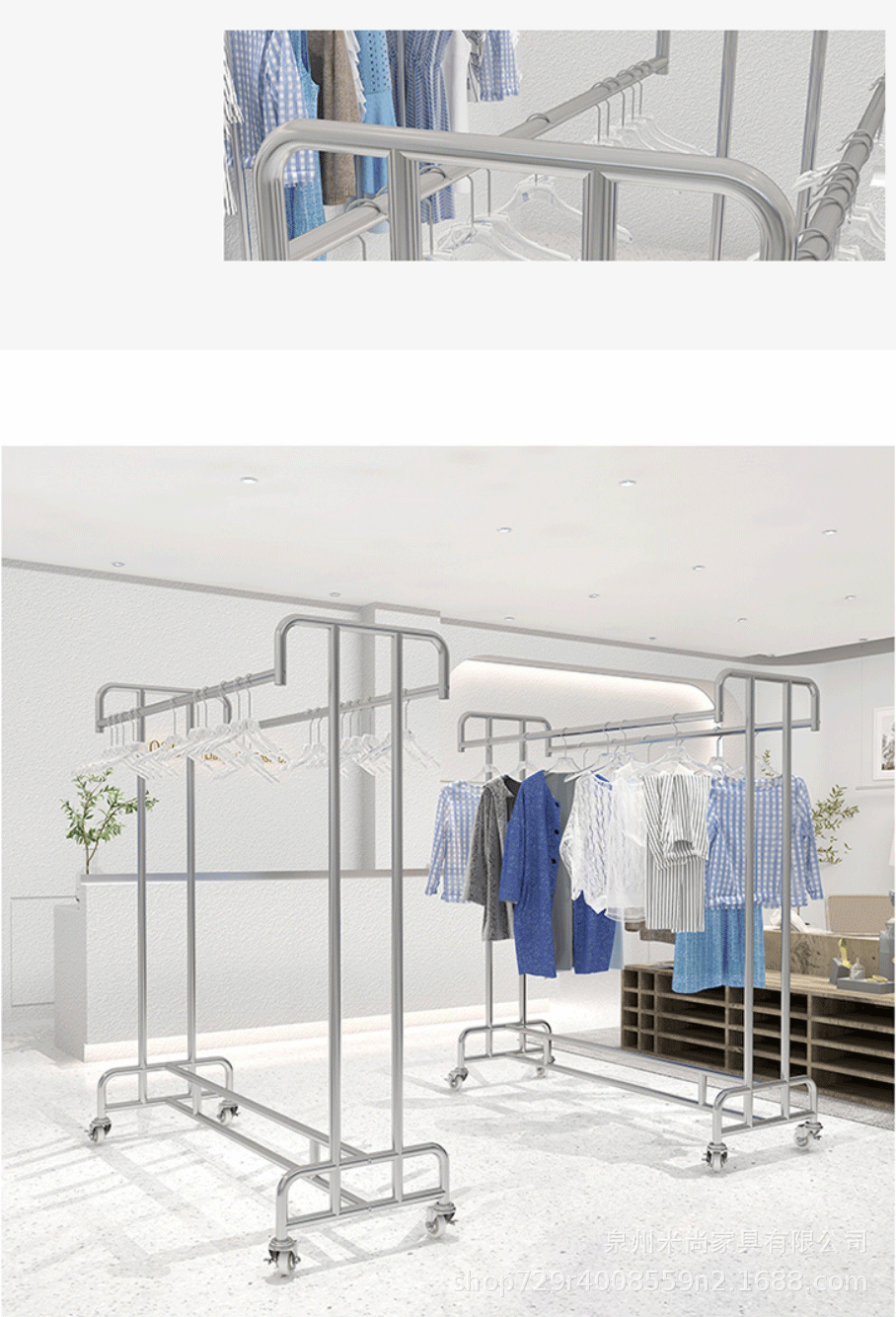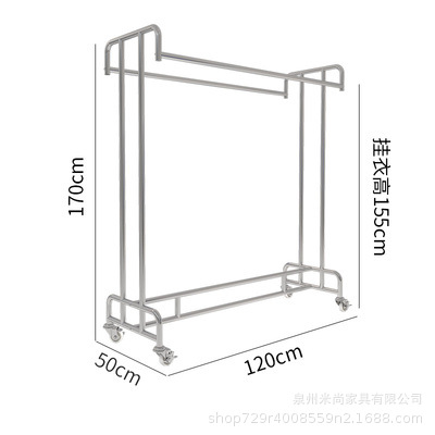스테인리스 센터 아일랜드 디스플레이 랙, 바닥 걸이형 옷걸이, 이중 선반 진열대, 이중 바 센터 아일랜드 랙, 이동식 선반스토어 가기