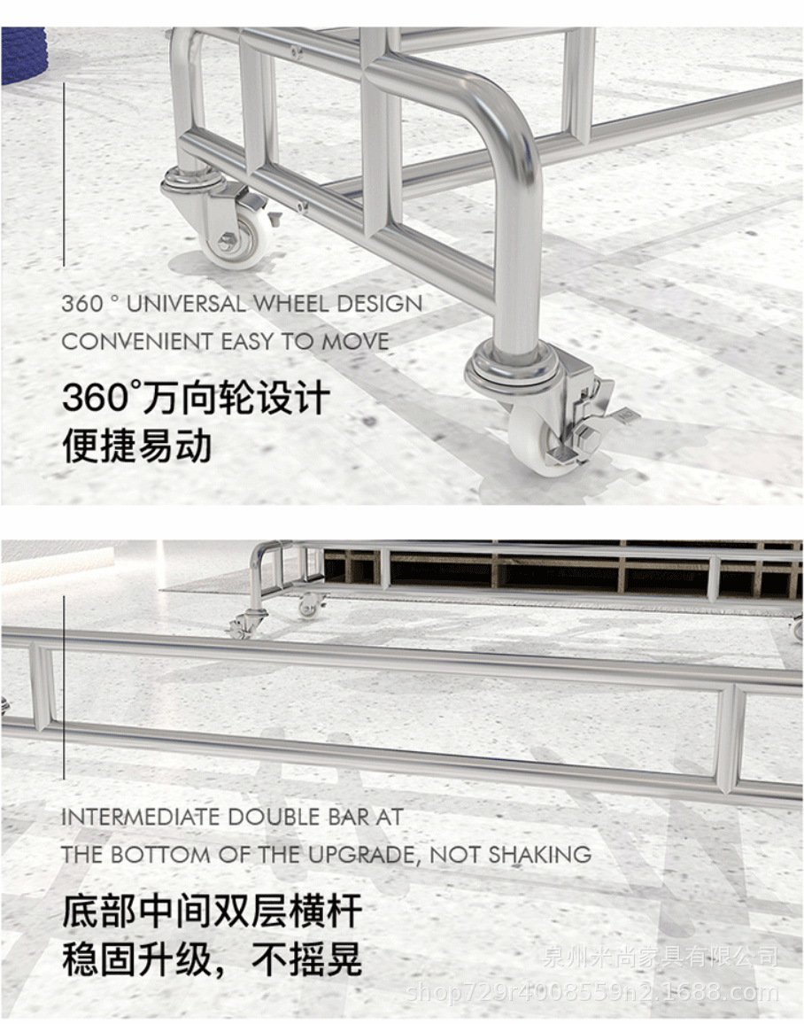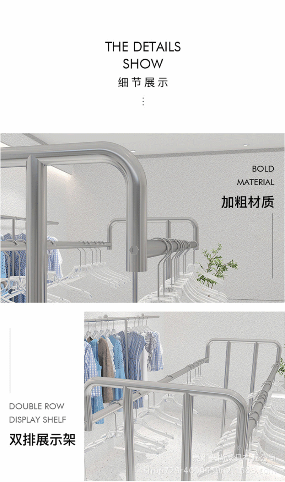 스테인리스 센터 아일랜드 디스플레이 랙, 바닥 걸이형 옷걸이, 이중 선반 진열대, 이중 바 센터 아일랜드 랙, 이동식 선반