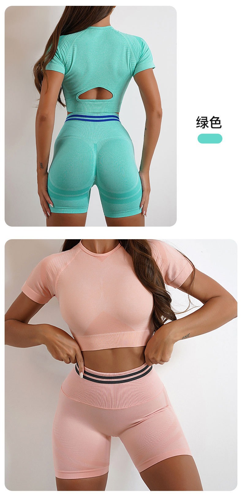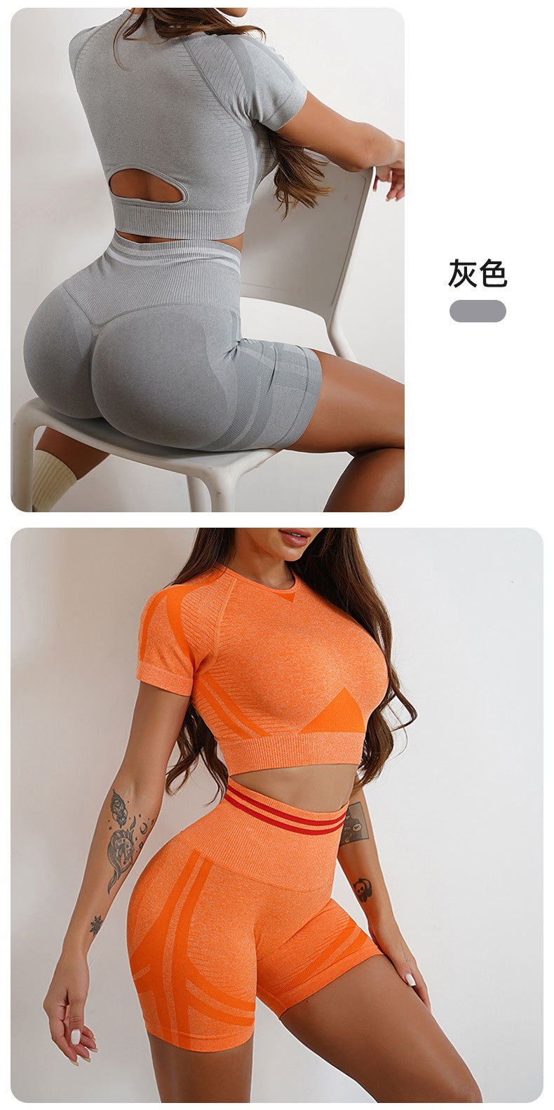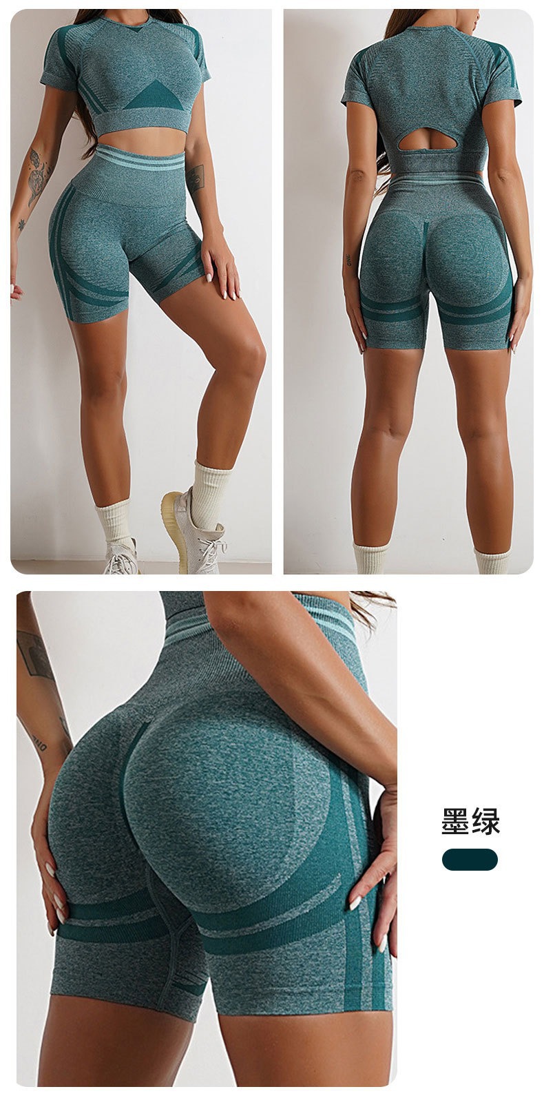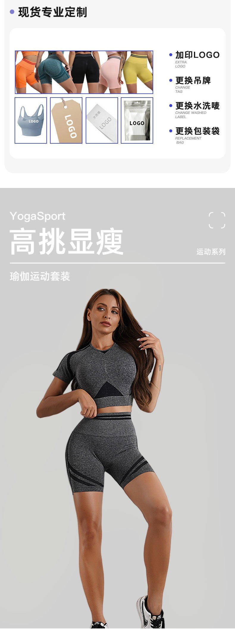 크로스보더 요가 양말 세트 복숭아색 하이웨이스트 피트니스 반바지 힙업 타이트 스포츠 팬츠 아름다운 등라인 반팔 투피스 여성용스토어 가기
