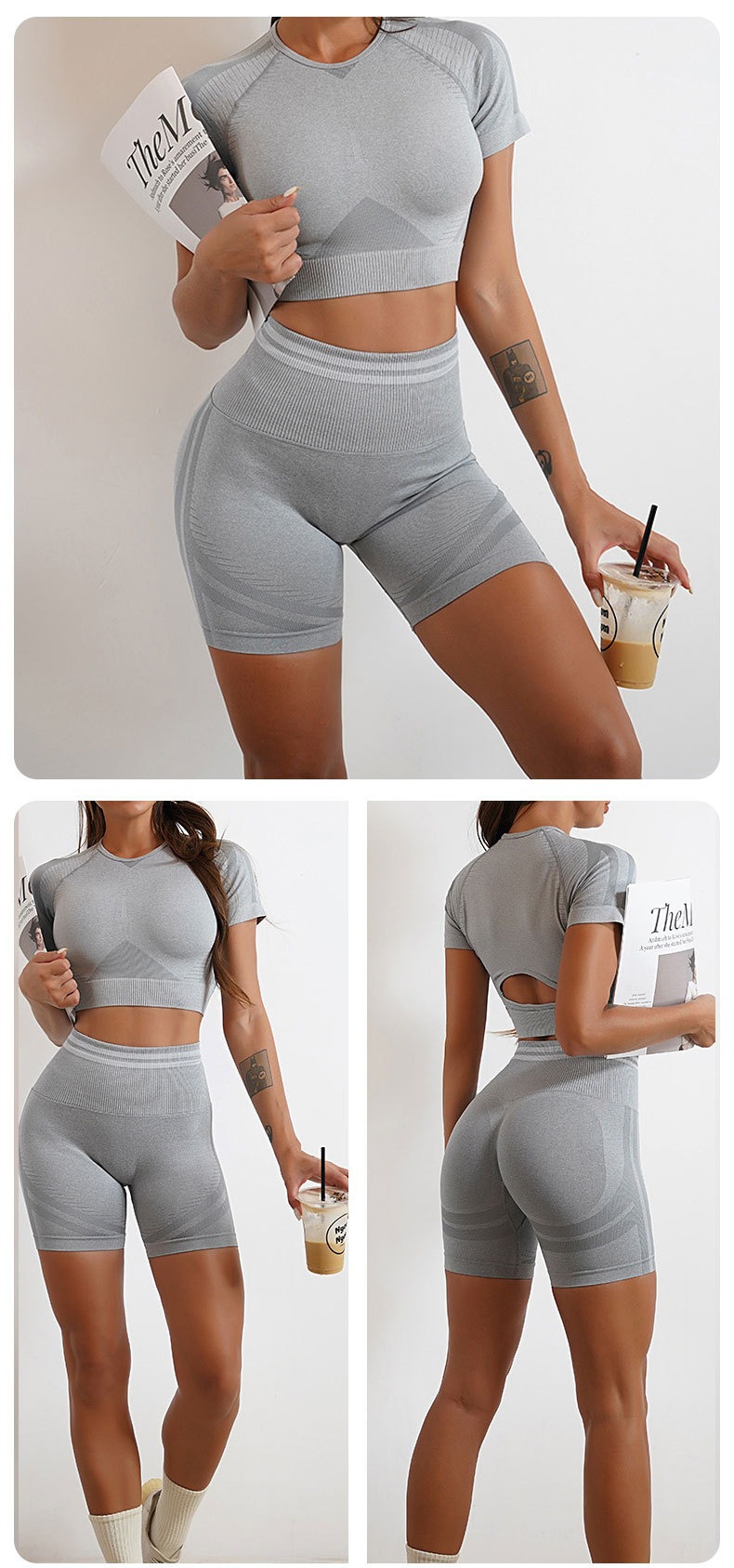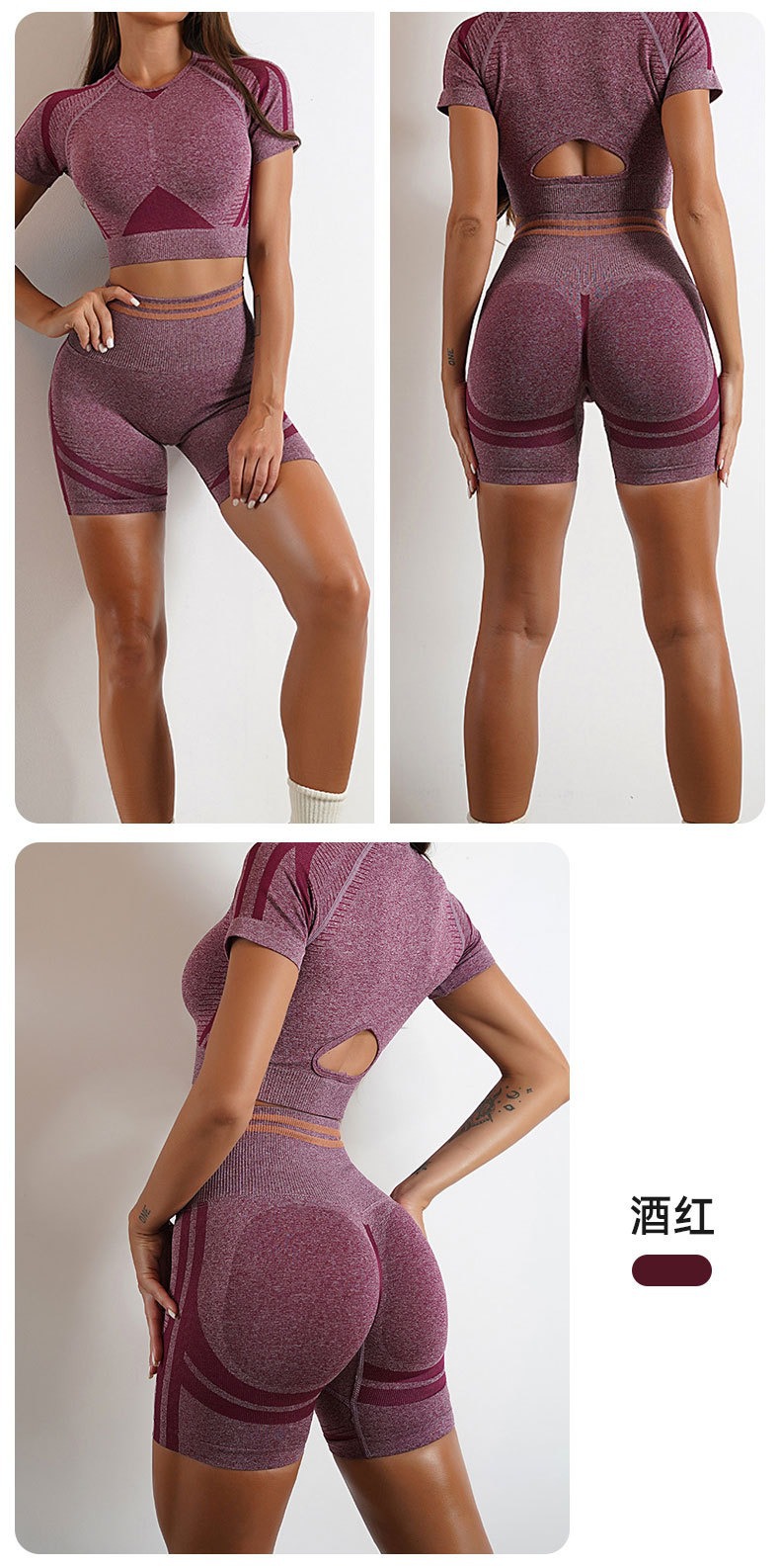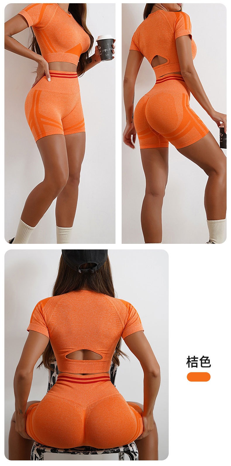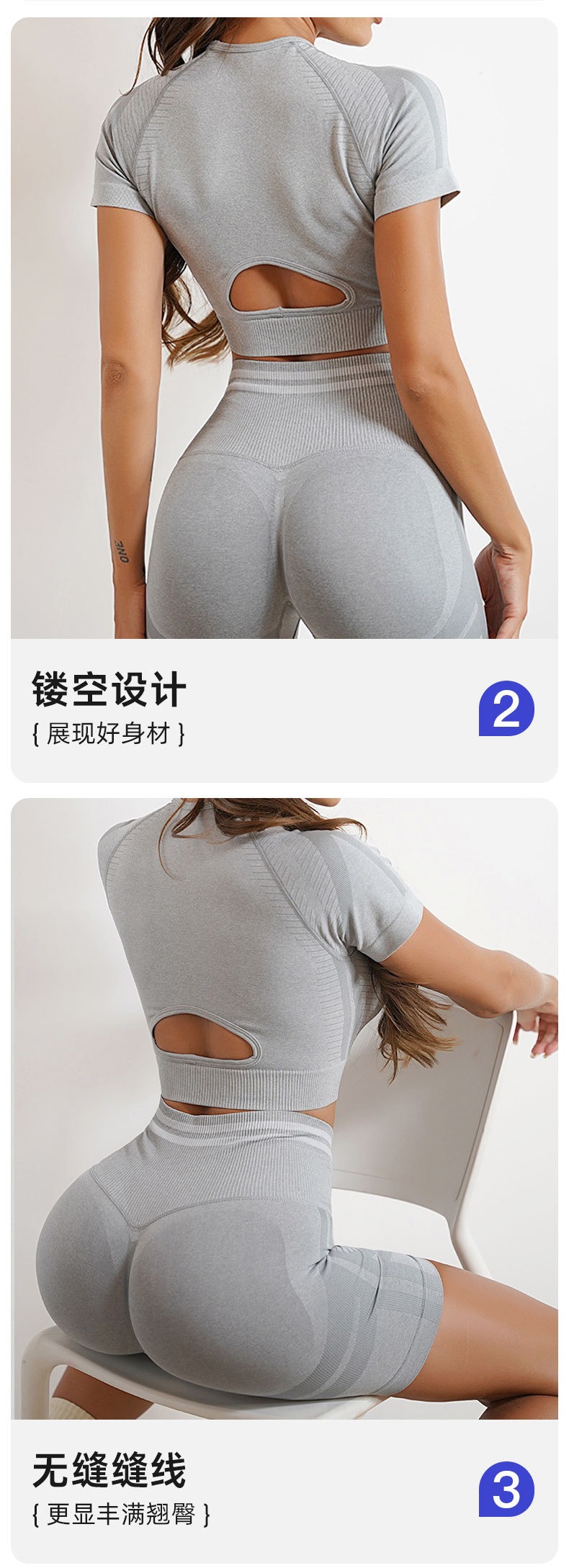 크로스보더 요가 양말 세트 복숭아색 하이웨이스트 피트니스 반바지 힙업 타이트 스포츠 팬츠 아름다운 등라인 반팔 투피스 여성용스토어 가기