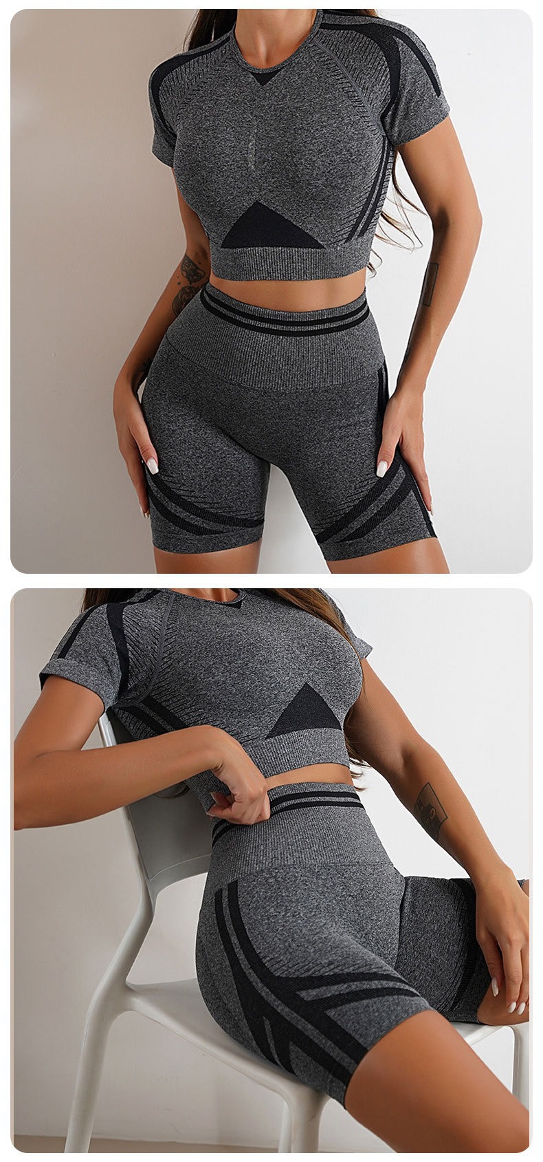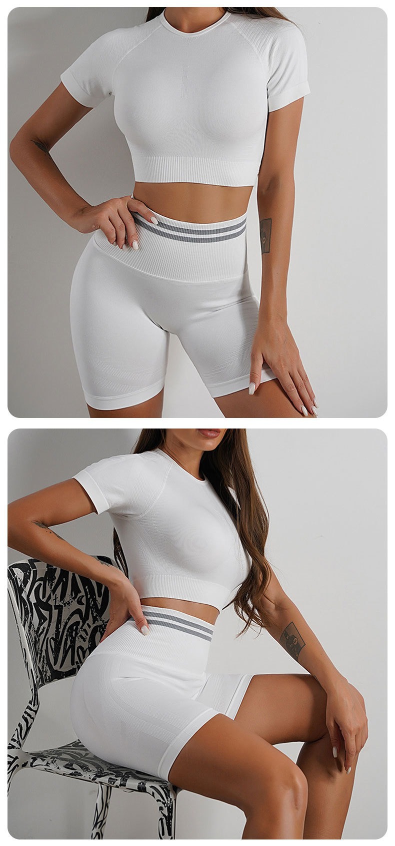 크로스보더 요가 양말 세트 복숭아색 하이웨이스트 피트니스 반바지 힙업 타이트 스포츠 팬츠 아름다운 등라인 반팔 투피스 여성용