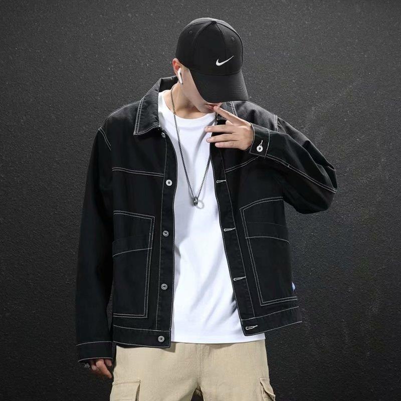 2024 가을, 겨울 블랙 데님 재킷 남성 트렌디 브랜드 오픈 스티치 루즈한 한국 스타일 작업복 탑 캐주얼 재킷스토어 가기