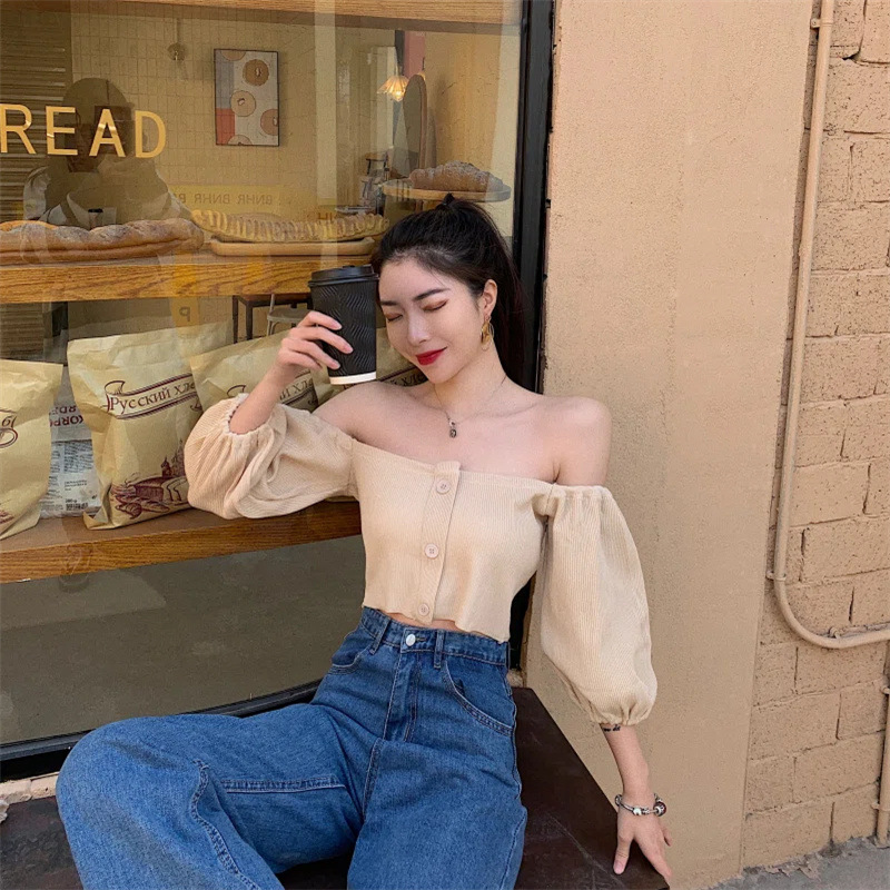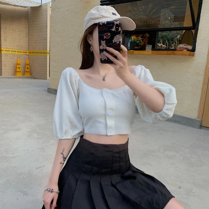 프랑스 스타일 여아 버블 반팔 하이 웨이스트 짧은 티셔츠 여성용 한국 스타일 섹시한 칼라 탑스토어 가기
