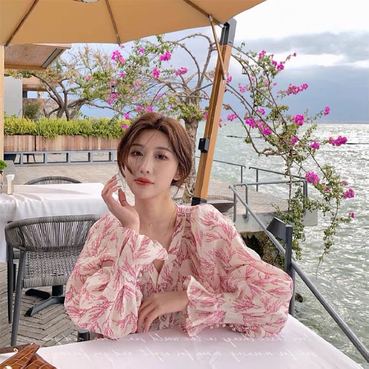 3126 프랑스 달콤한 핑크 꽃 무늬 셔츠 여성의 초가을 퍼프 소매 세련된 쉬폰 디자인 감각 틈새 탑스토어 가기