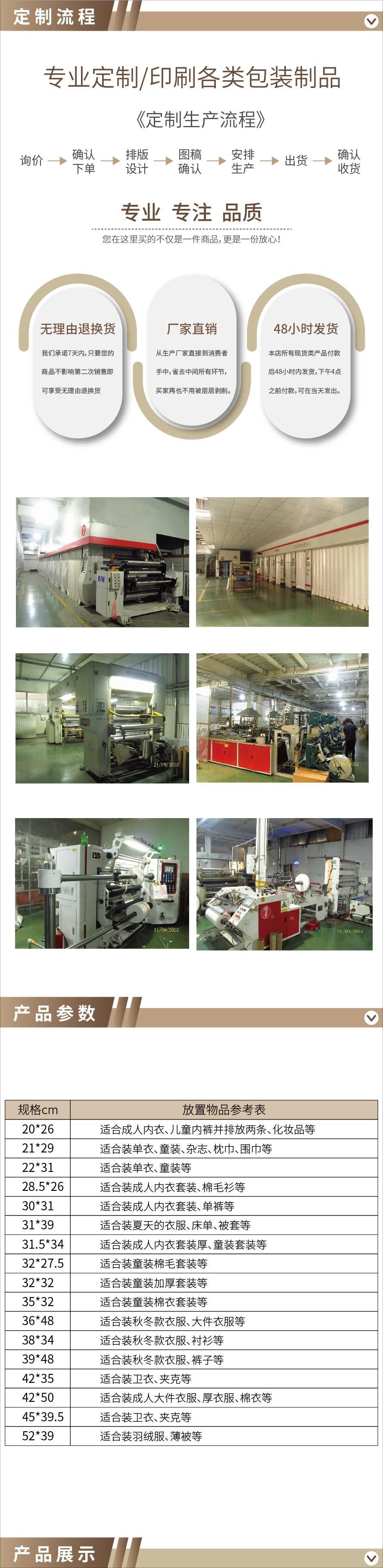 售前咨询:请将袋子款式、数量、规格(宽+侧宽*全长)、材料种类、材料厚度、材料底色、印刷内容提供给我们,便于我们准确报价。
