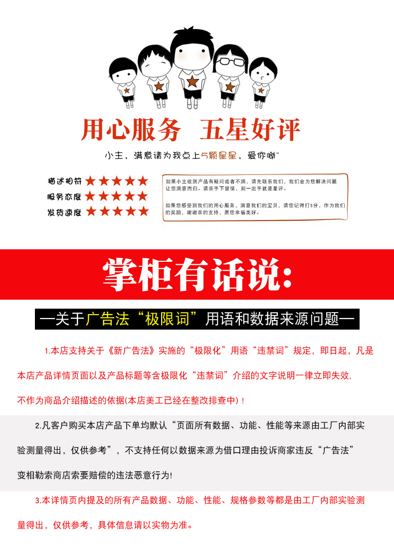 5、尺寸,长,侧宽,高,存在1CM左右的差异均为正常。以上几点均无法控制,不属于质量问题,不予以退款,一点瑕疵都不能接受的客户谨慎购买。