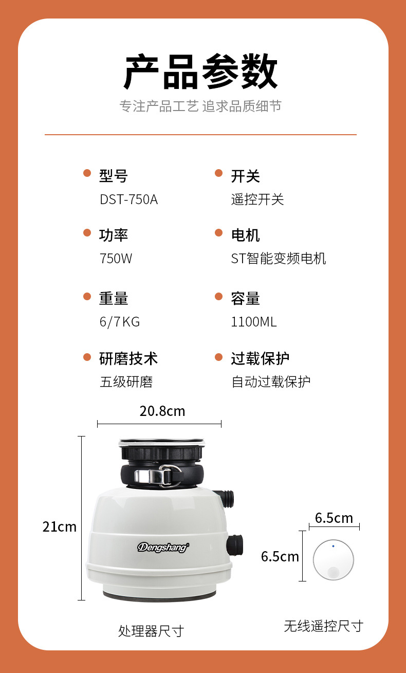 Dengshang 쓰레기 처리기 짧은 높이 22cm 주방 폐기물 처리기 쓰레기 처리기