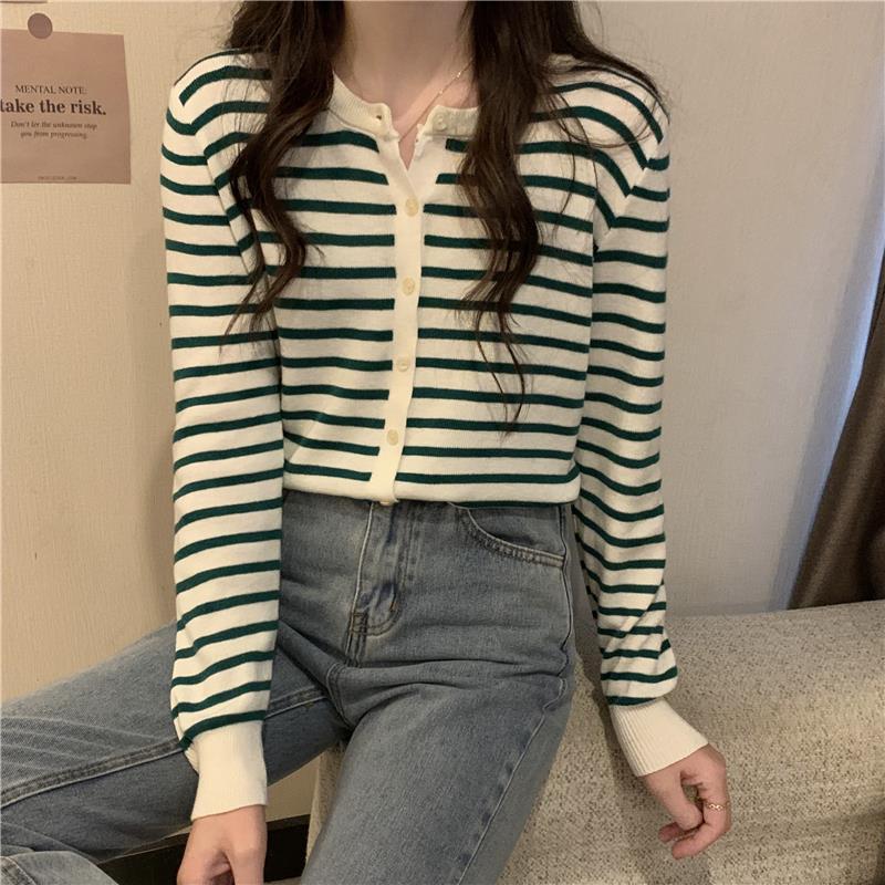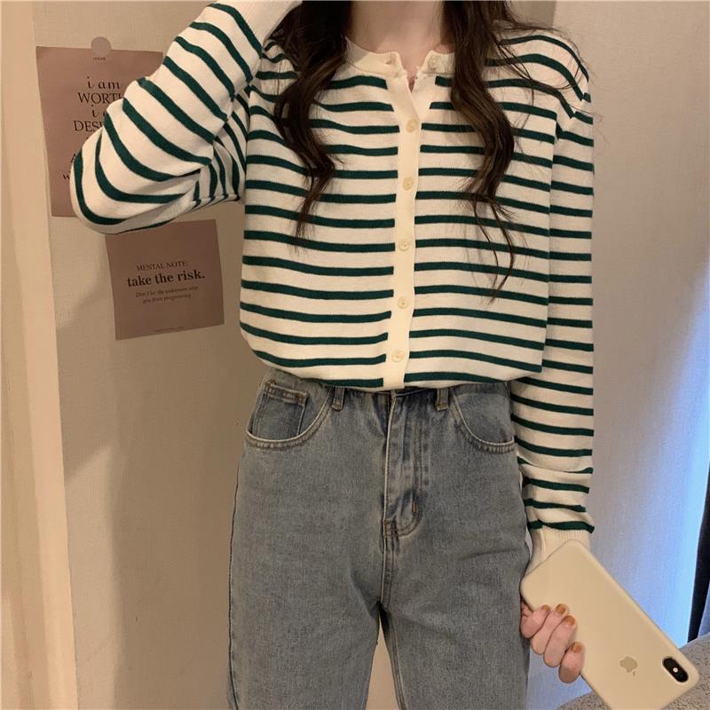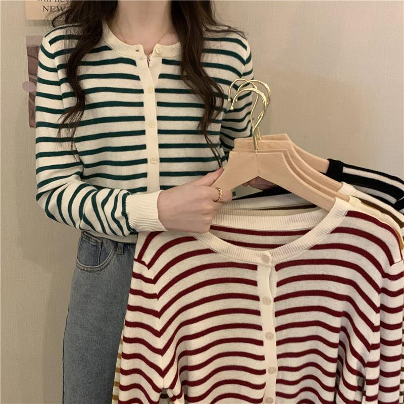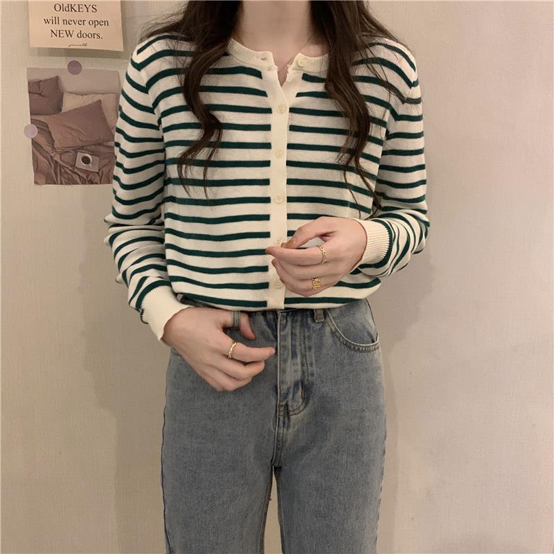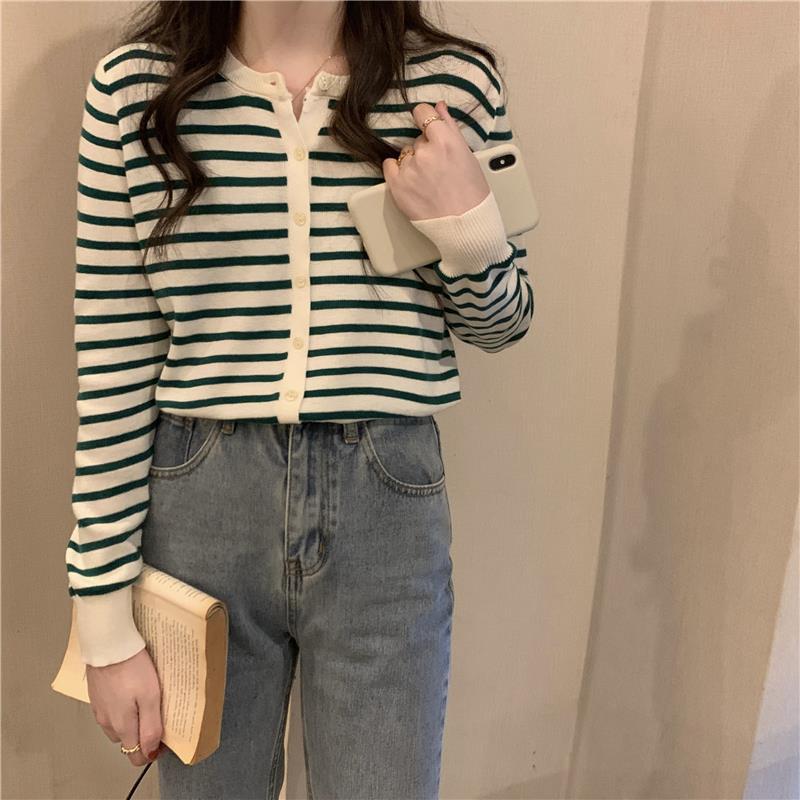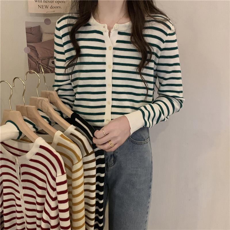 이른 가을 스트라이프 니트 가디건 여성 탑 2023 새로운 긴 소매 재킷 느슨한 봄과 가을 기본 셔츠 스웨터 여성용스토어 가기