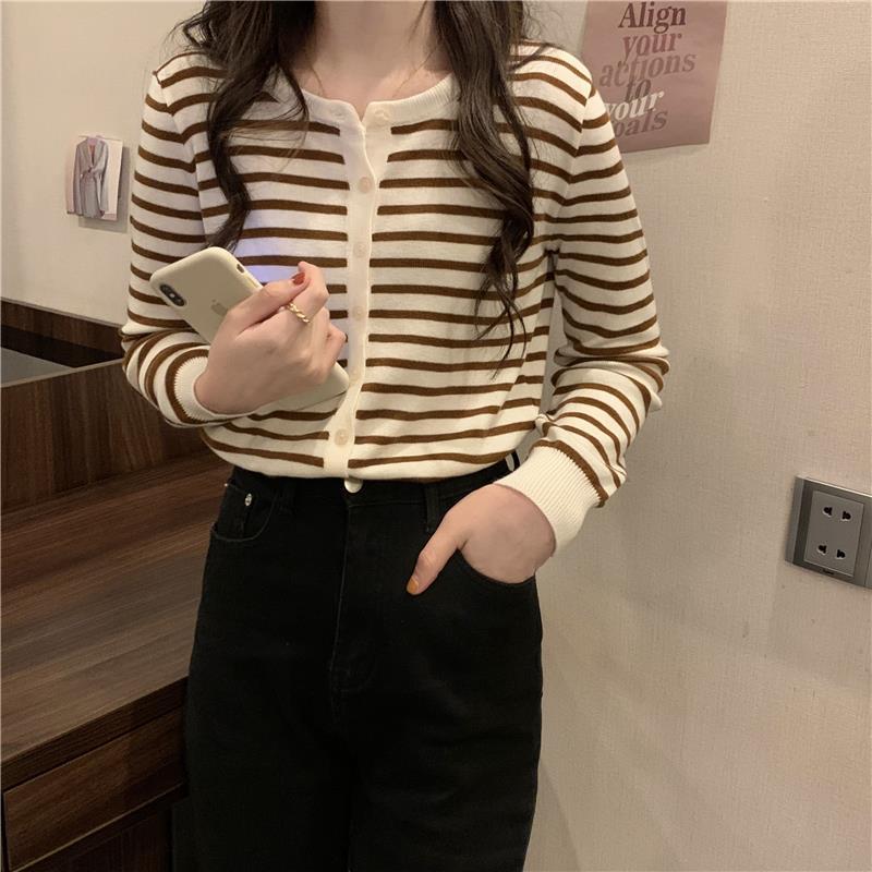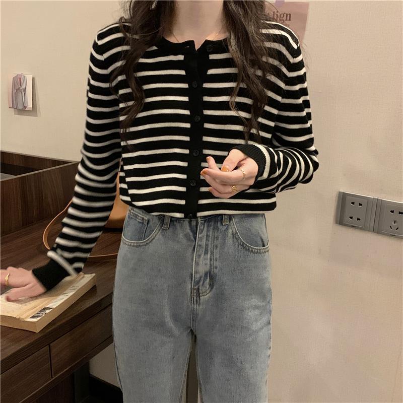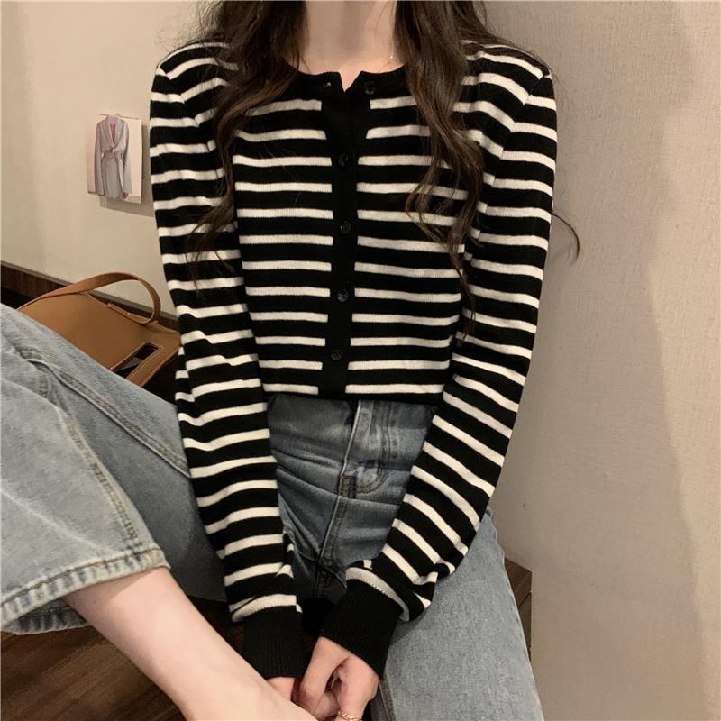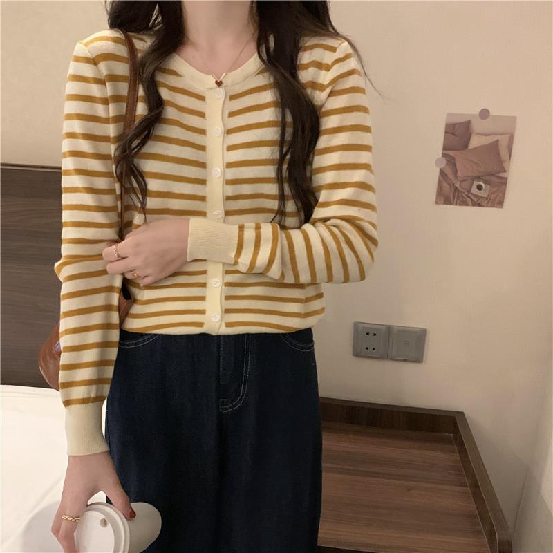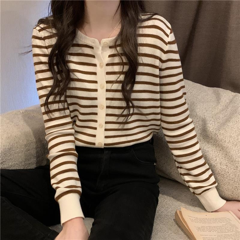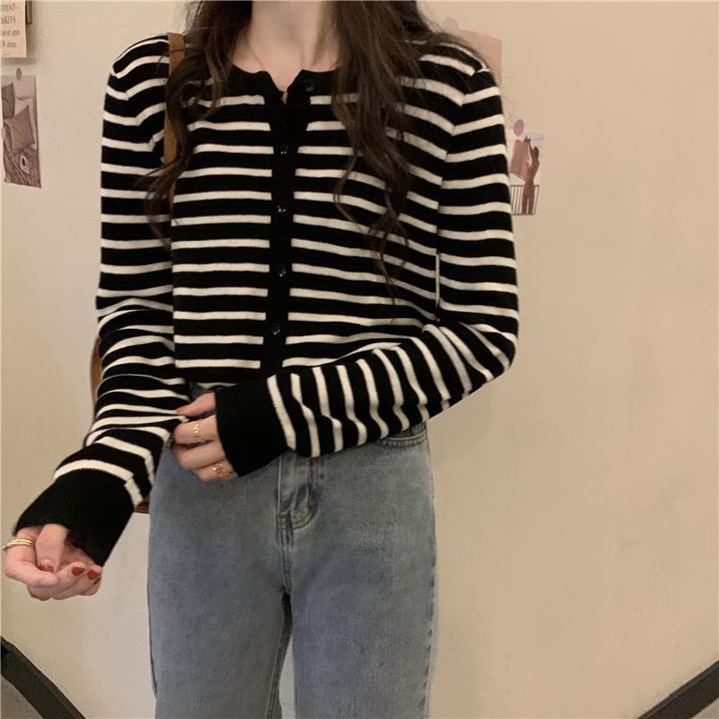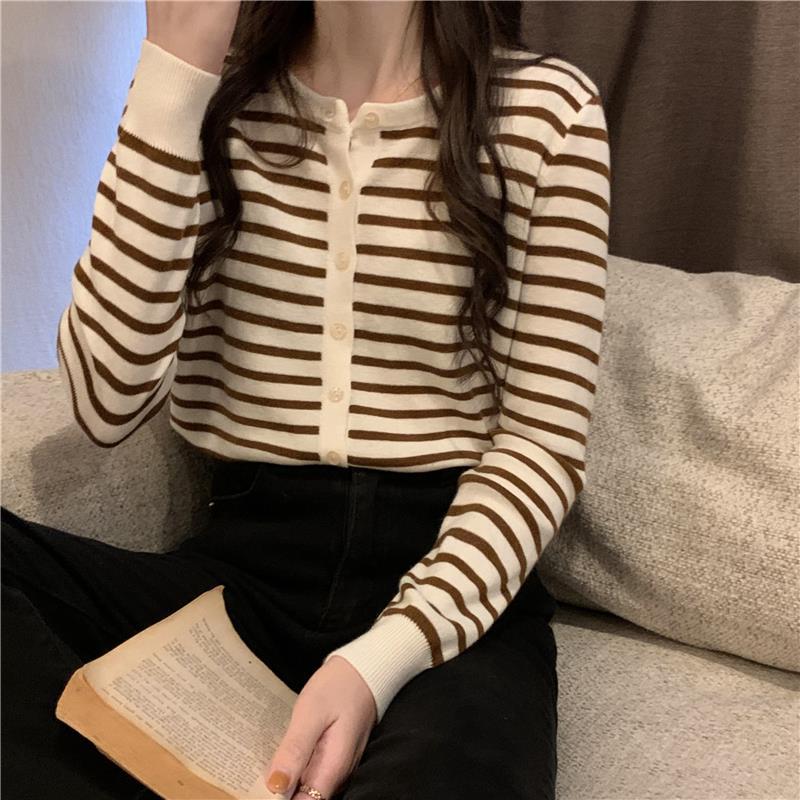 이른 가을 스트라이프 니트 가디건 여성 탑 2023 새로운 긴 소매 재킷 느슨한 봄과 가을 기본 셔츠 스웨터 여성용
