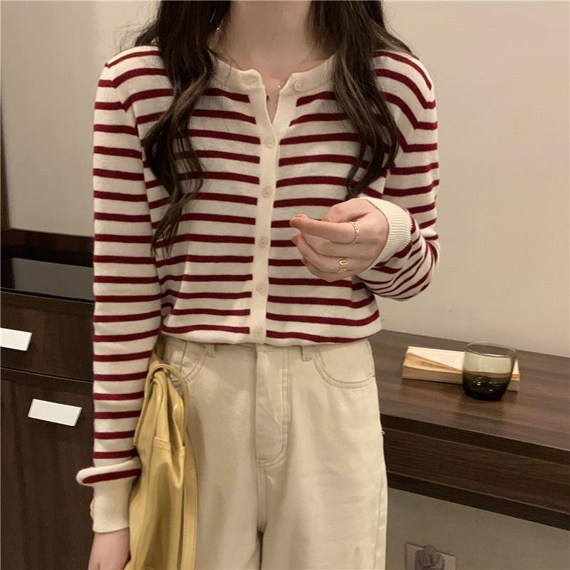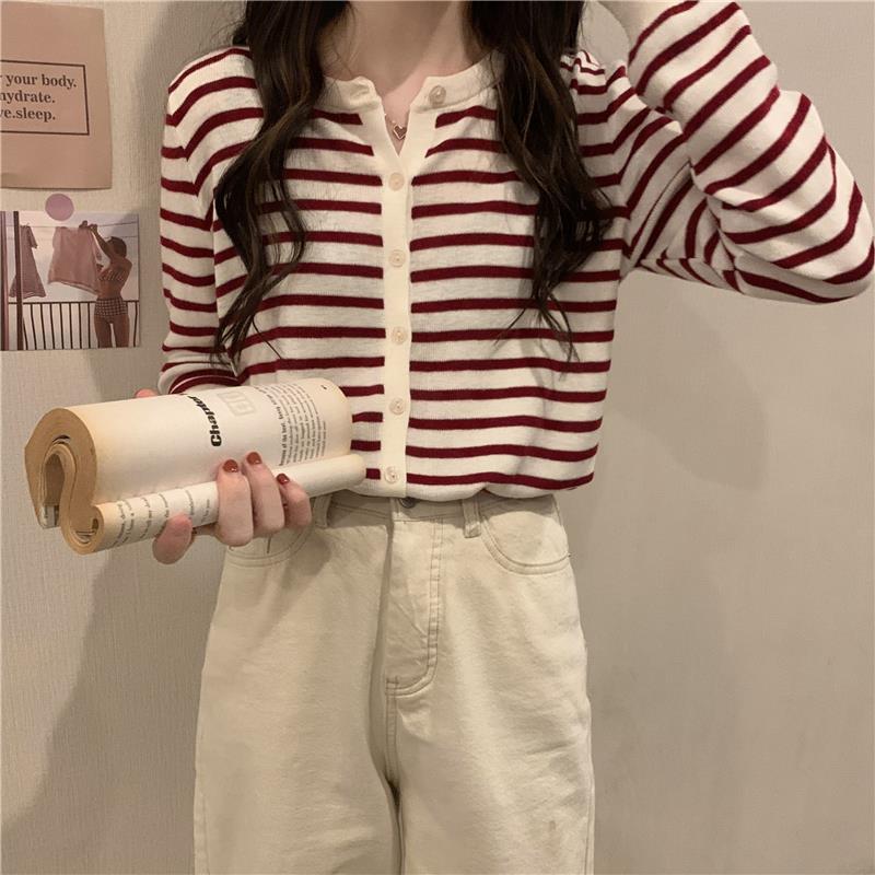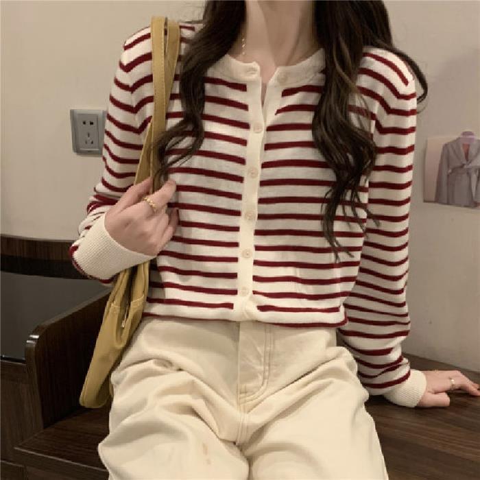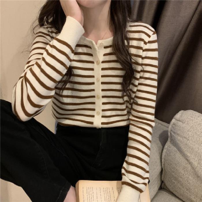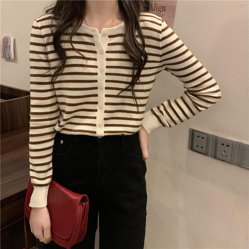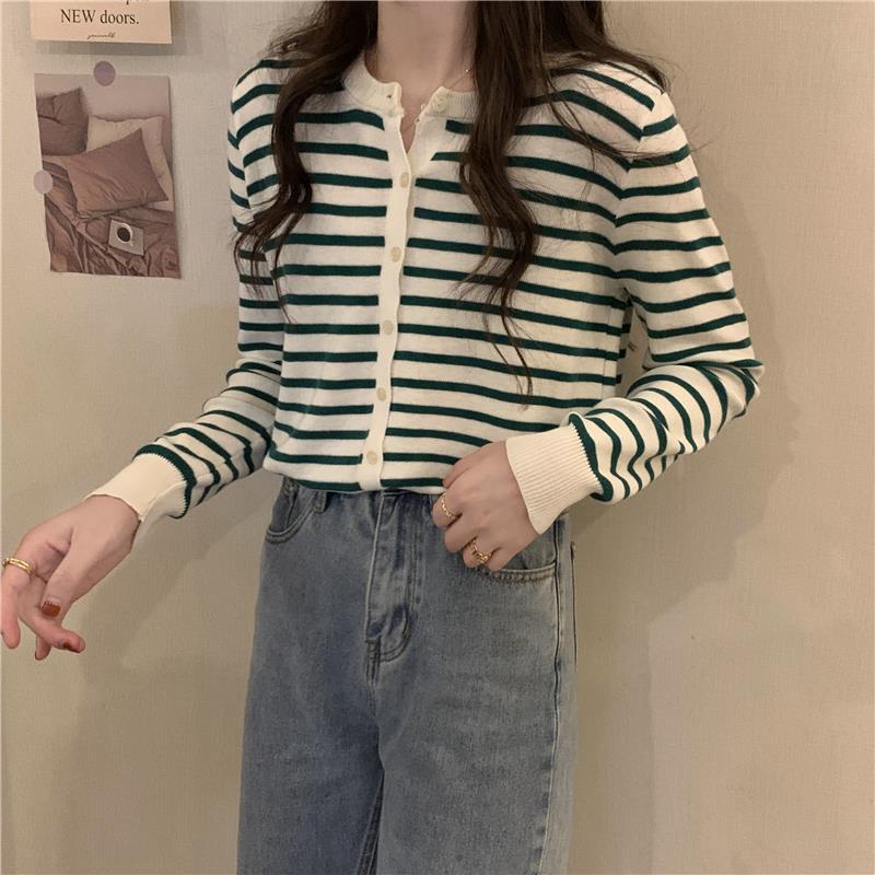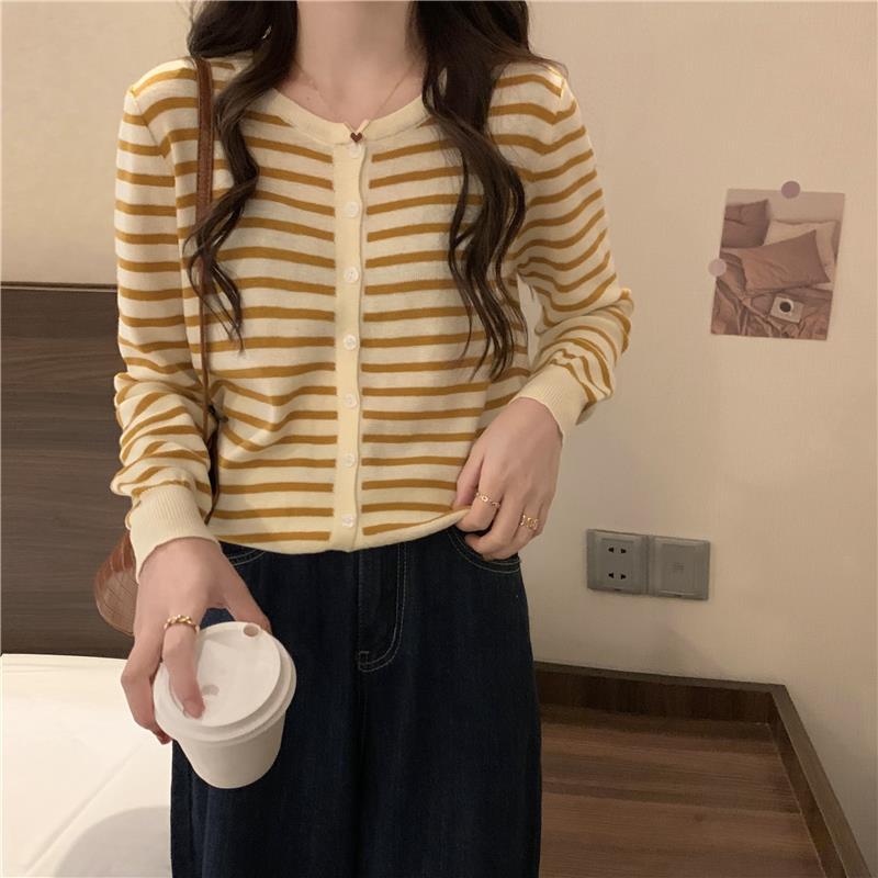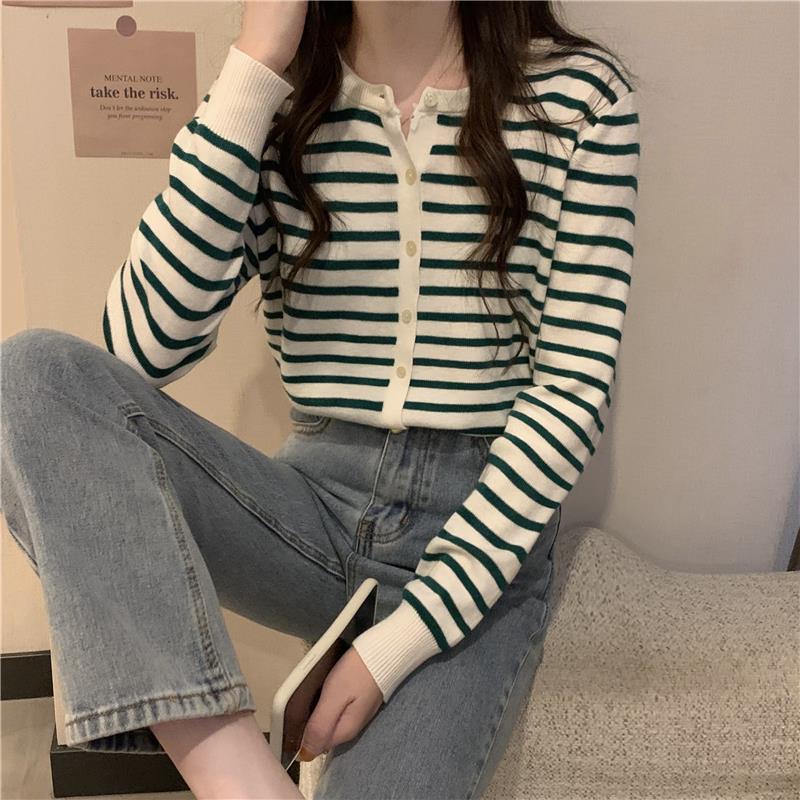 이른 가을 스트라이프 니트 가디건 여성 탑 2023 새로운 긴 소매 재킷 느슨한 봄과 가을 기본 셔츠 스웨터 여성용