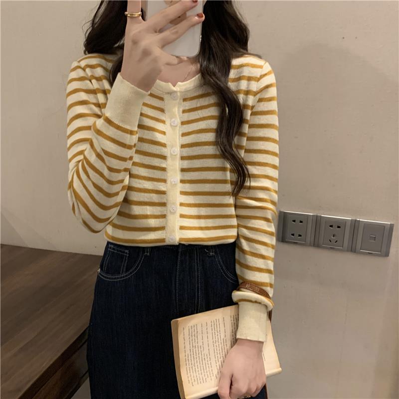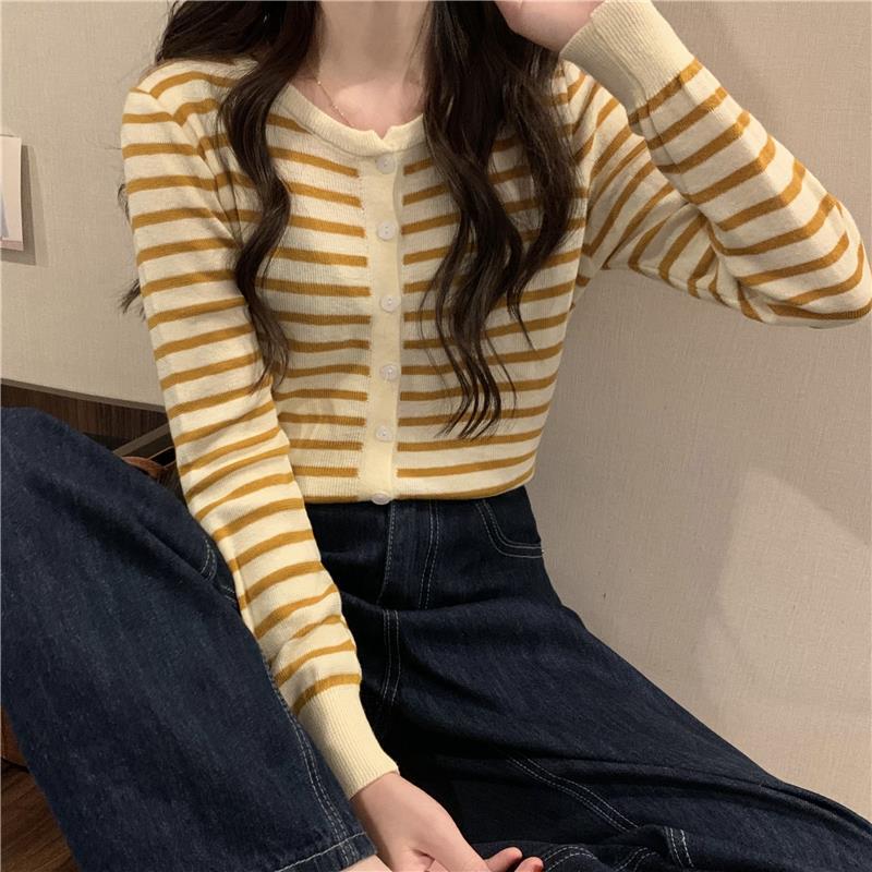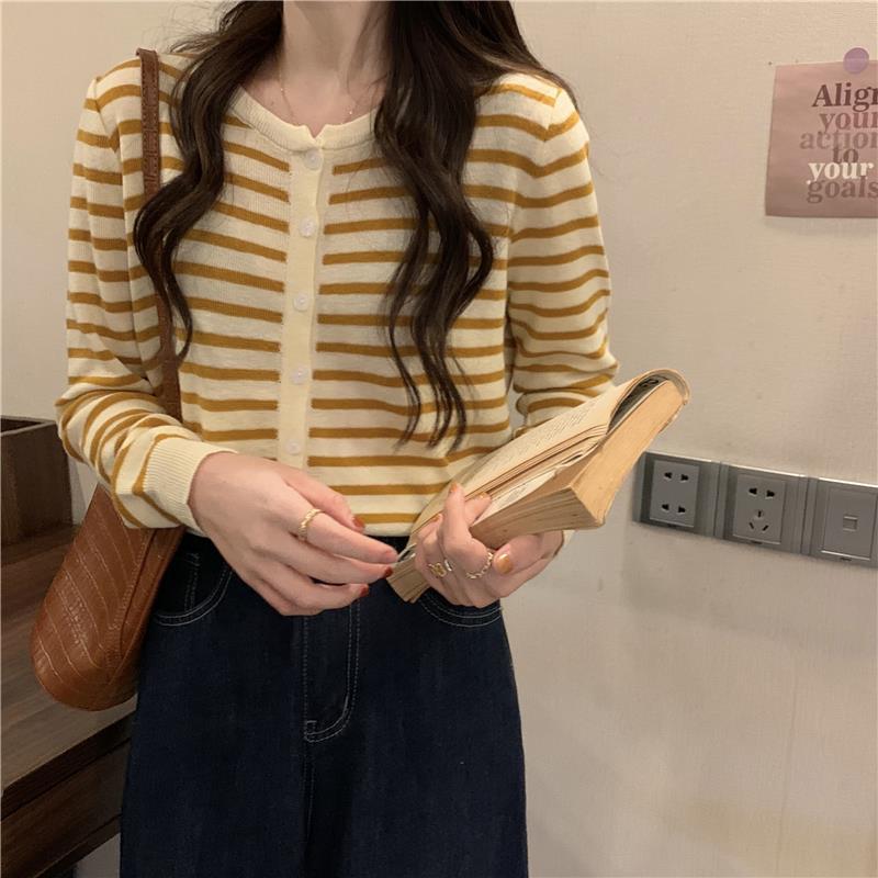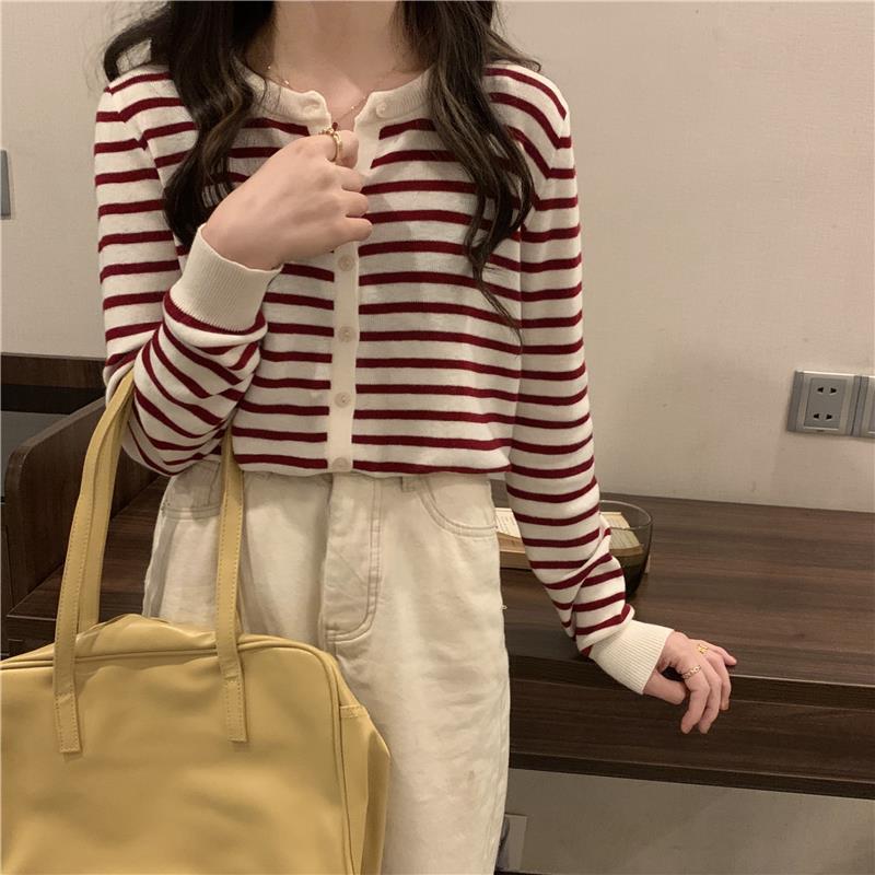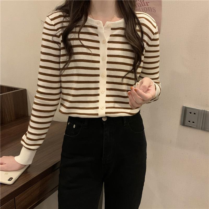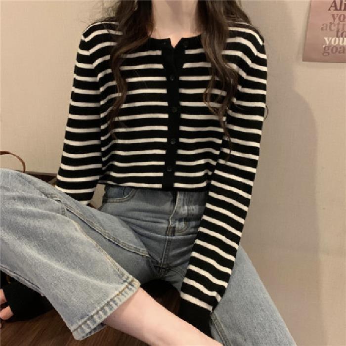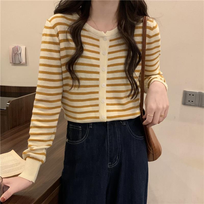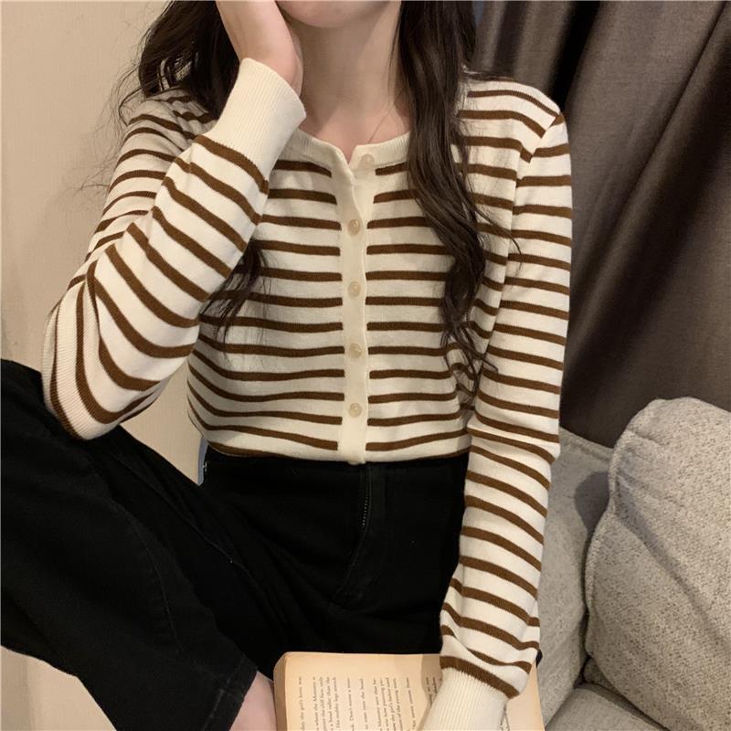 이른 가을 스트라이프 니트 가디건 여성 탑 2023 새로운 긴 소매 재킷 느슨한 봄과 가을 기본 셔츠 스웨터 여성용