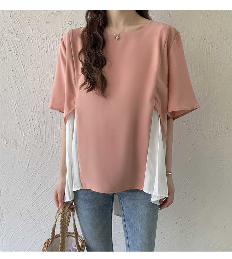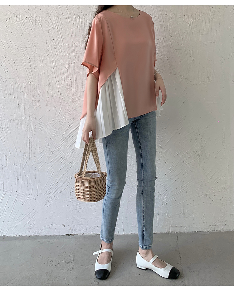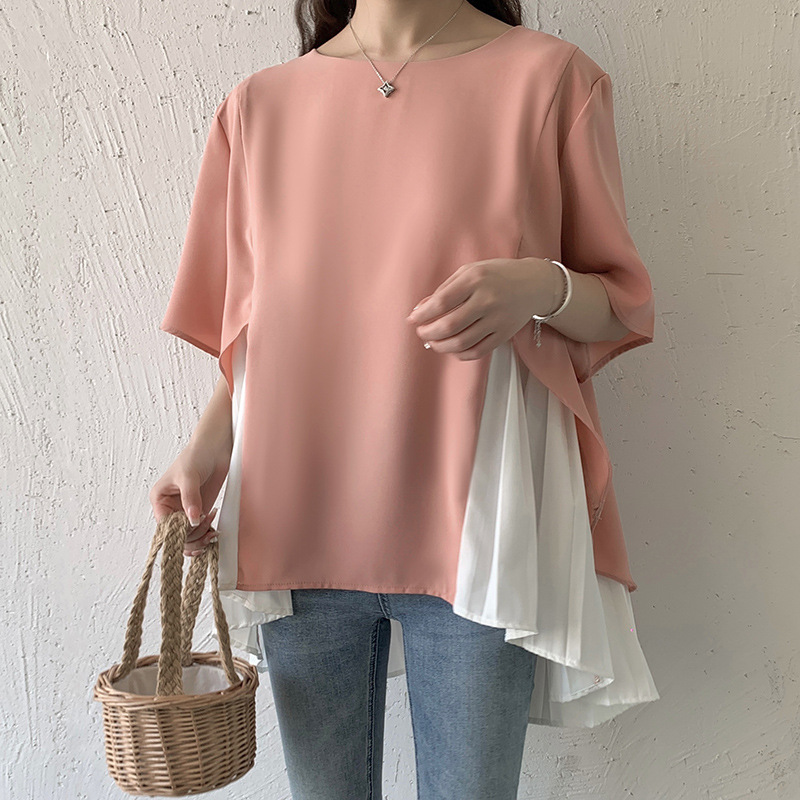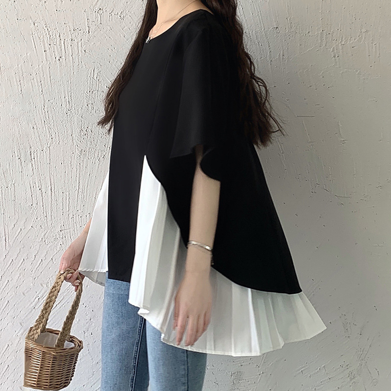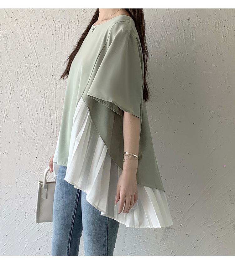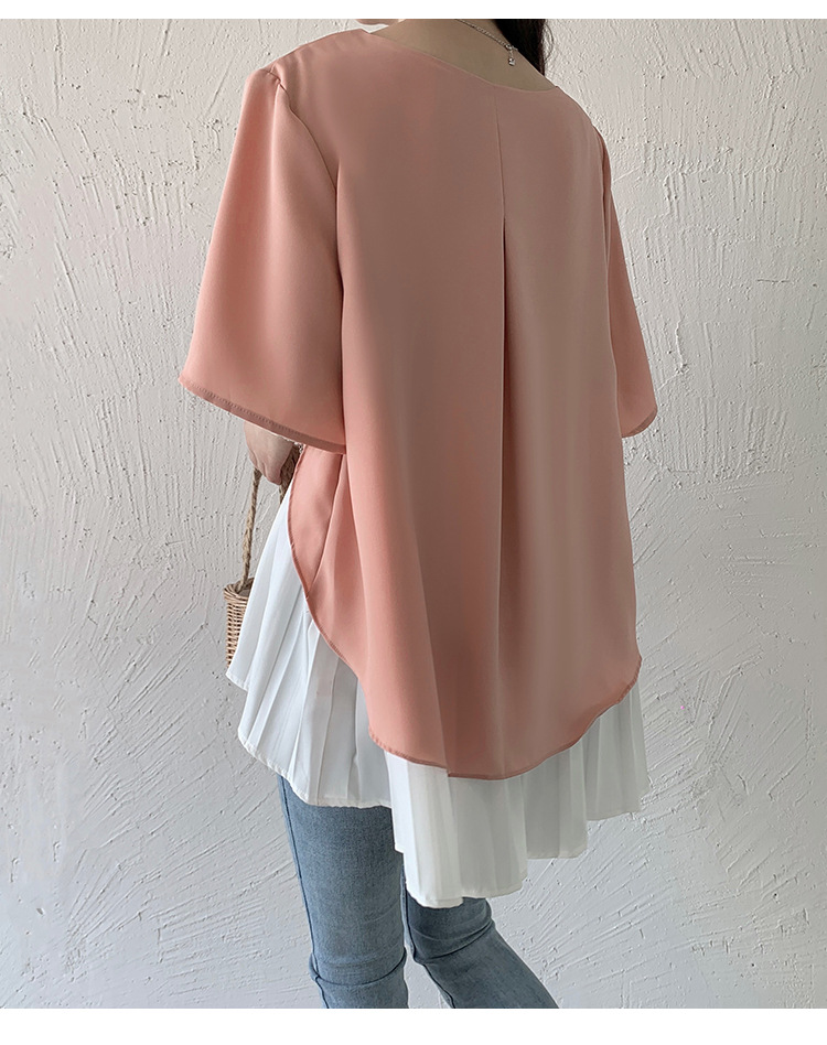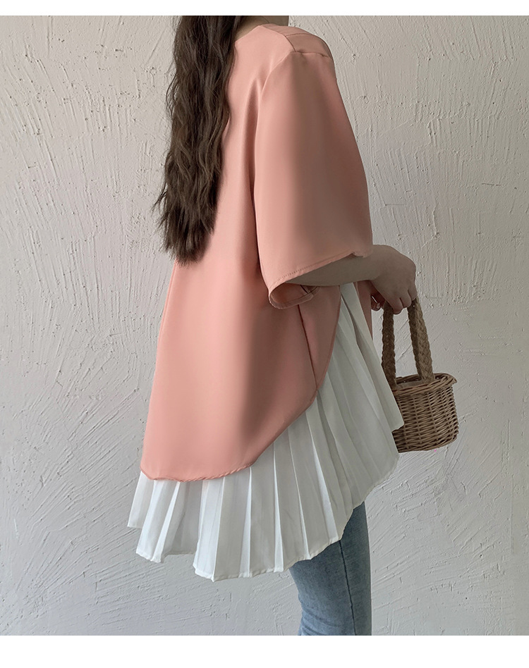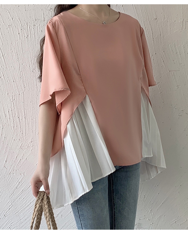 재고 2022 크로스 보더 일본과 한국 스타일 느슨한 달콤한 밑단 스티치 플리츠 반팔 쉬폰 셔츠 여성의 불규칙한 탑