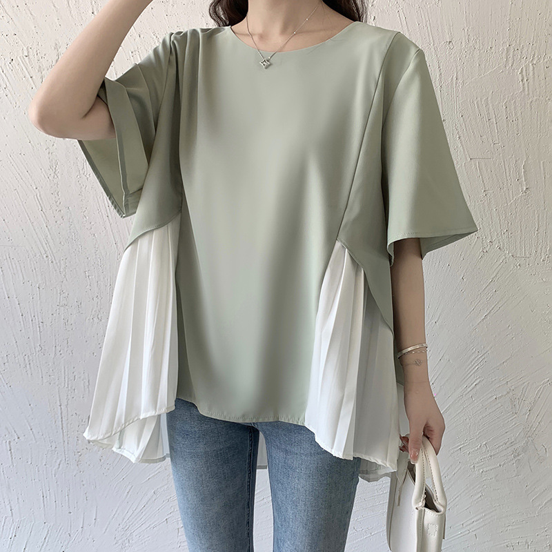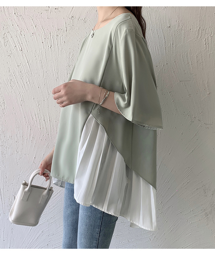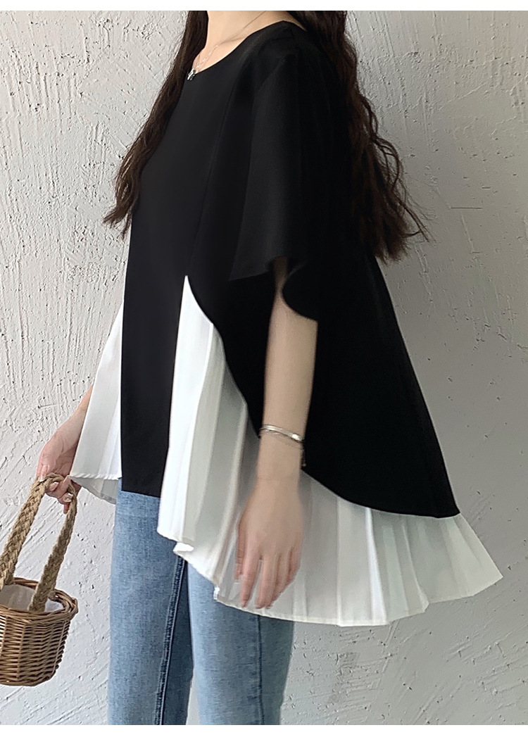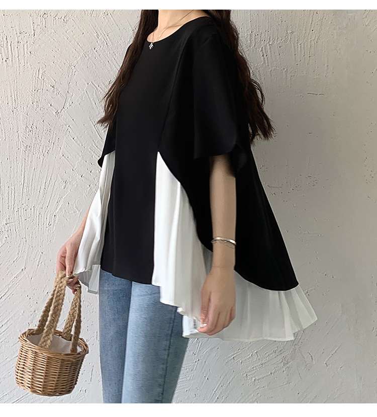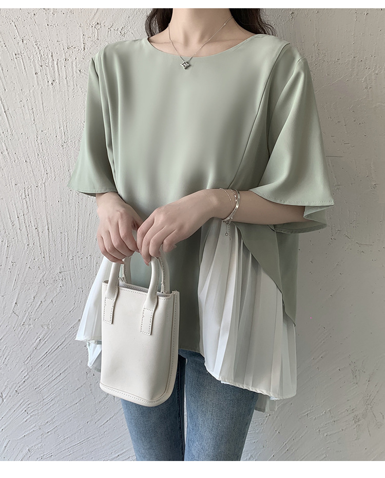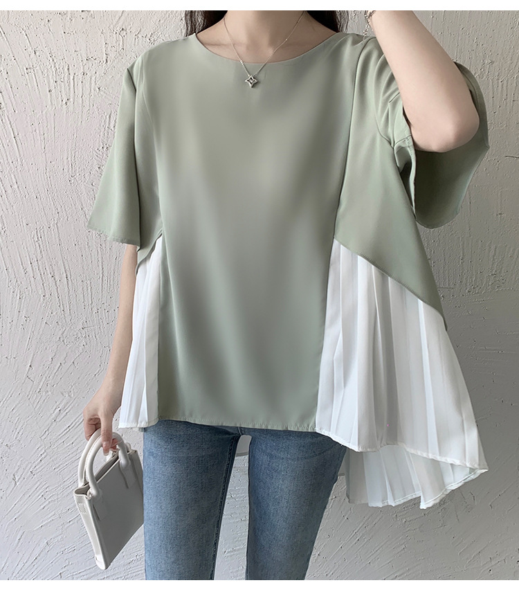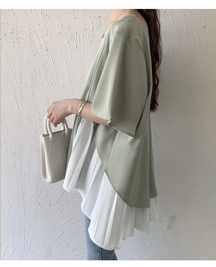 재고 2022 크로스 보더 일본과 한국 스타일 느슨한 달콤한 밑단 스티치 플리츠 반팔 쉬폰 셔츠 여성의 불규칙한 탑