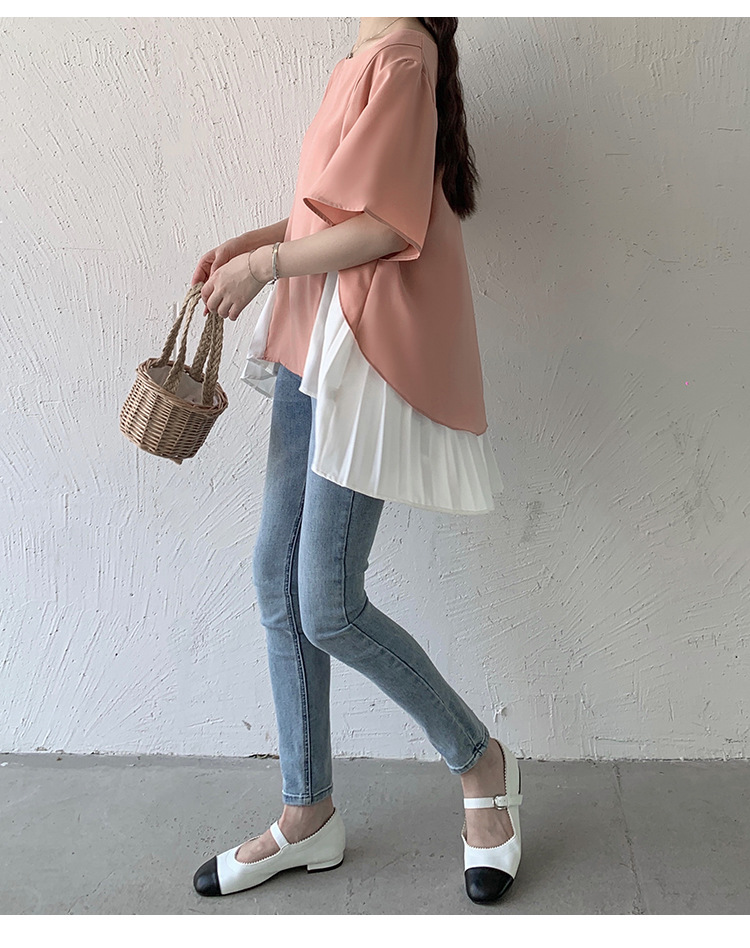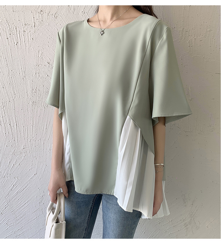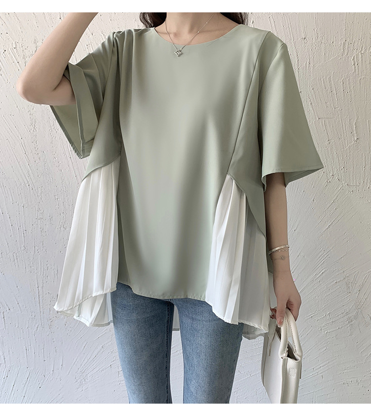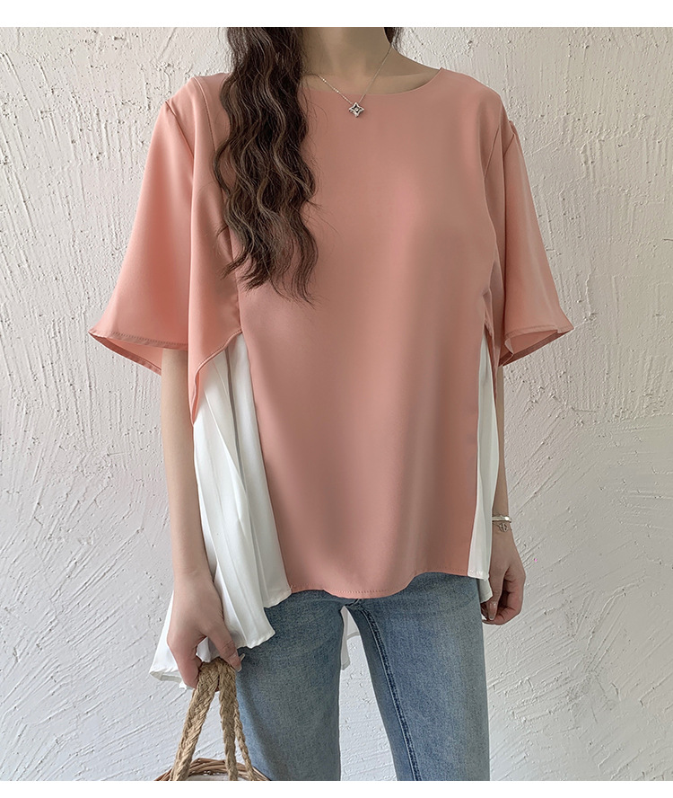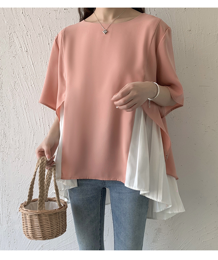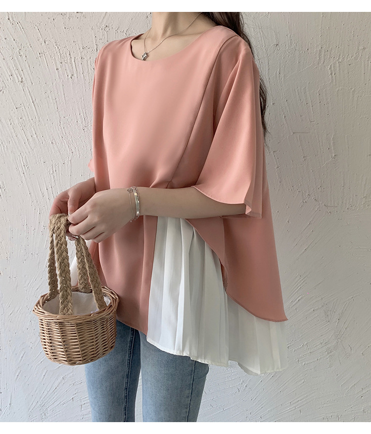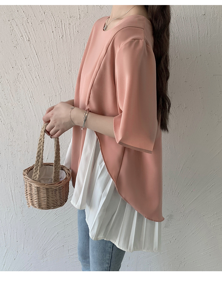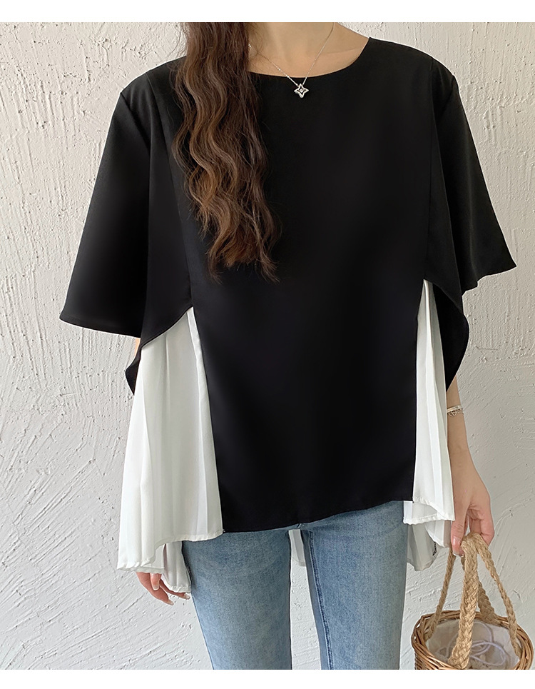 재고 2022 크로스 보더 일본과 한국 스타일 느슨한 달콤한 밑단 스티치 플리츠 반팔 쉬폰 셔츠 여성의 불규칙한 탑