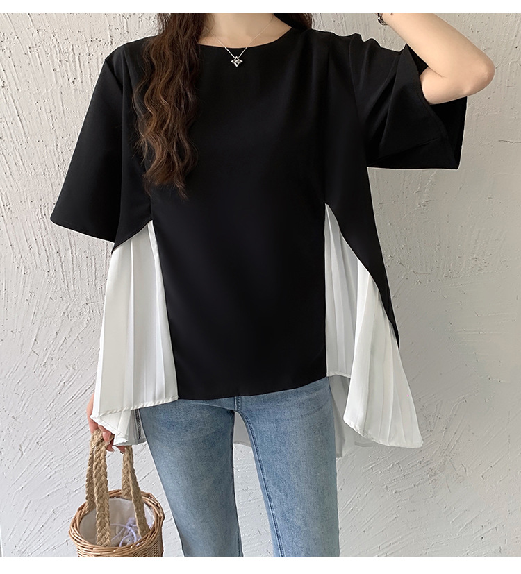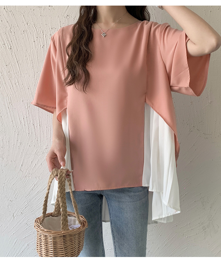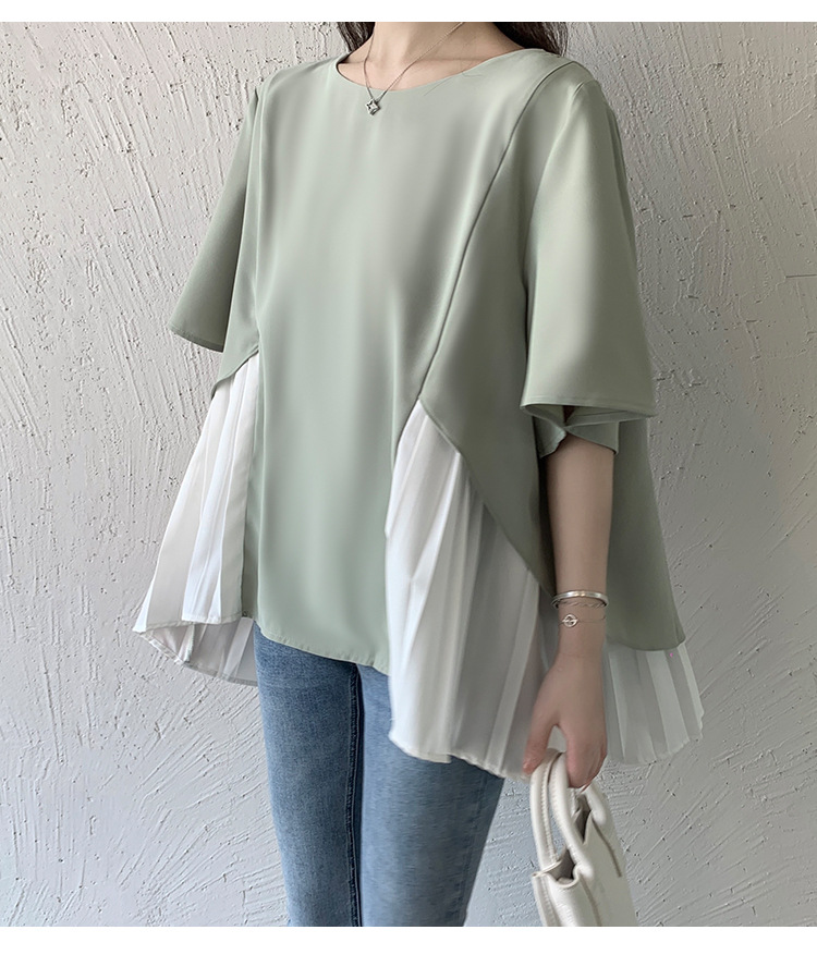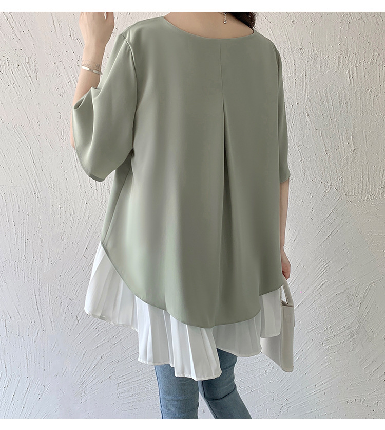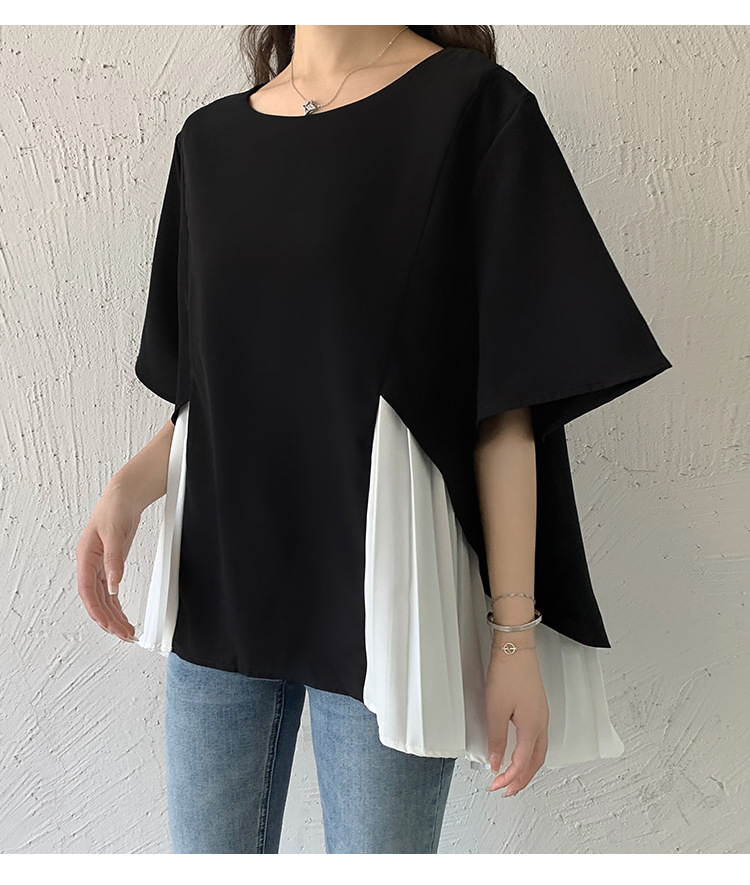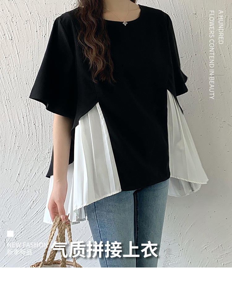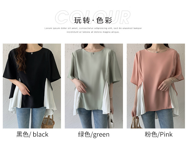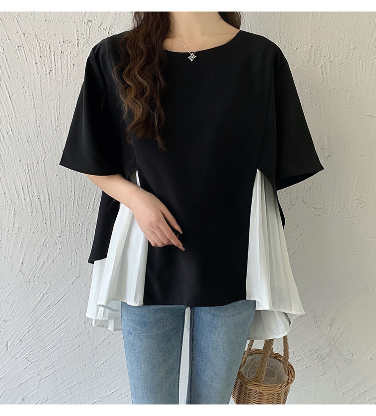 재고 2022 크로스 보더 일본과 한국 스타일 느슨한 달콤한 밑단 스티치 플리츠 반팔 쉬폰 셔츠 여성의 불규칙한 탑