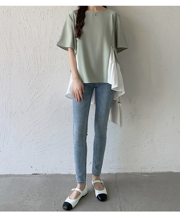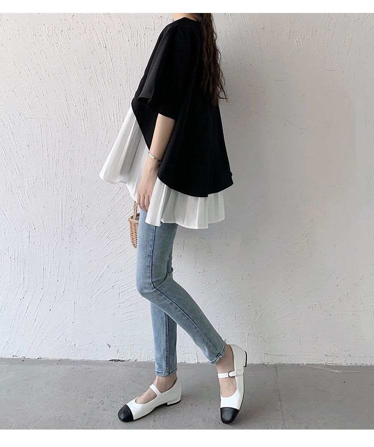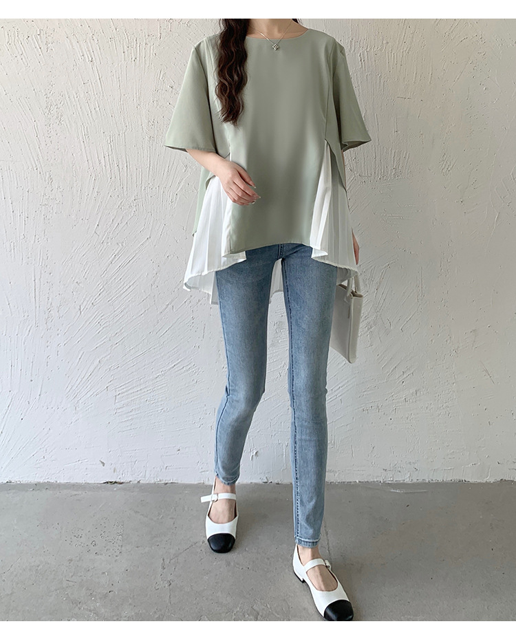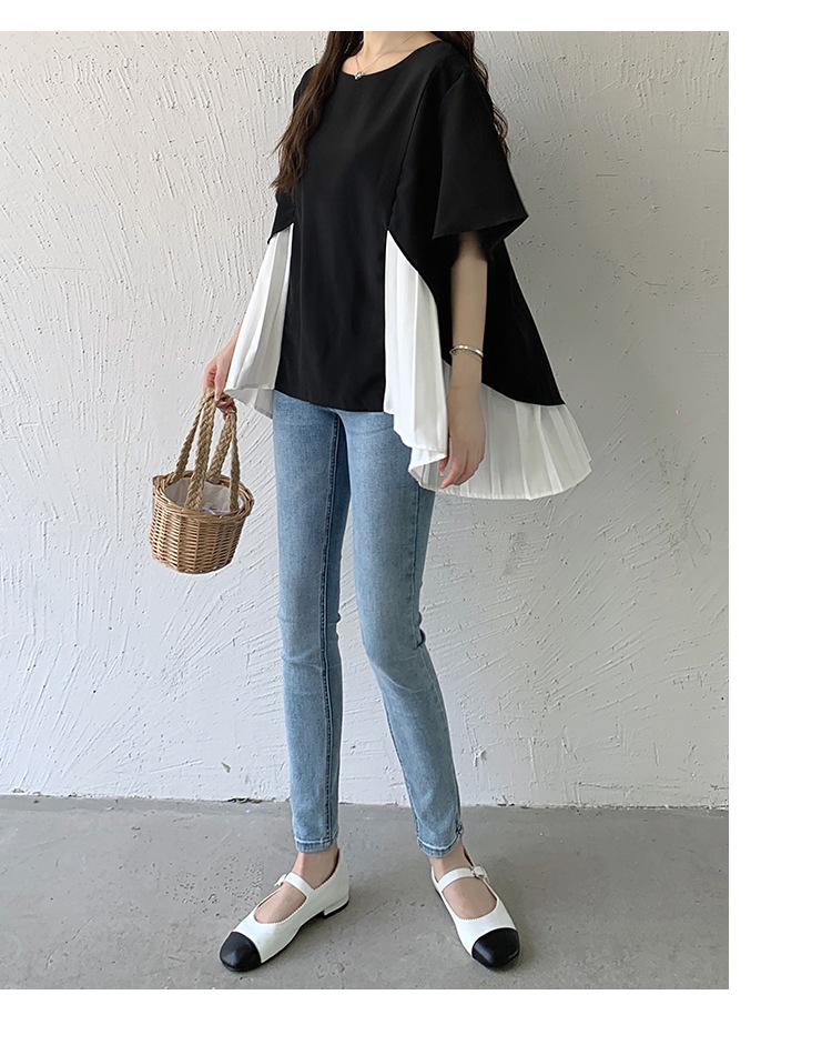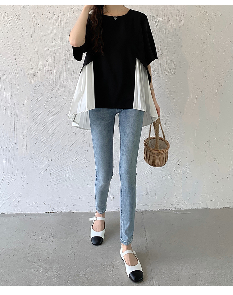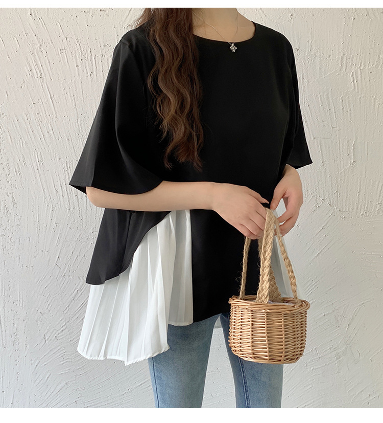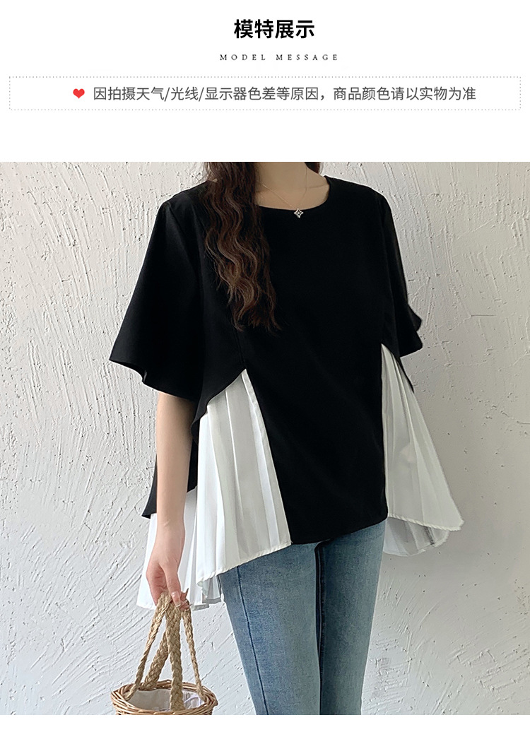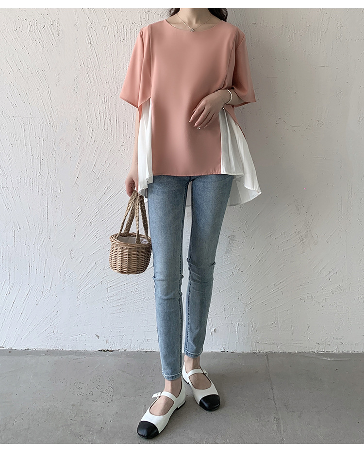 재고 2022 크로스 보더 일본과 한국 스타일 느슨한 달콤한 밑단 스티치 플리츠 반팔 쉬폰 셔츠 여성의 불규칙한 탑