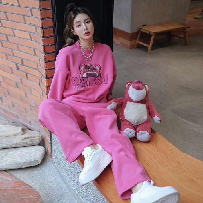 딸기 핑크 패션 스포츠 세트 여성용 가을 겨울 신상 자수 라운드넥 스웨트셔츠 캐주얼 와이드 팬츠 투피스 세트
