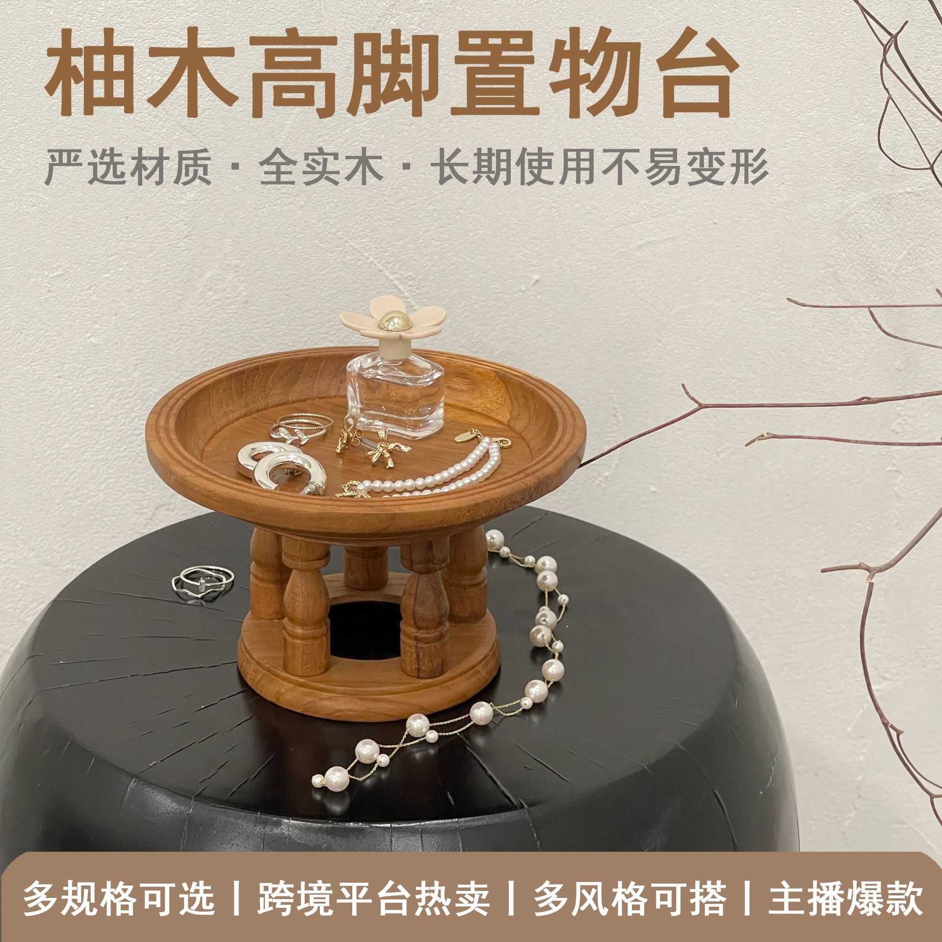 【品名】:柚木圆形高脚置物台