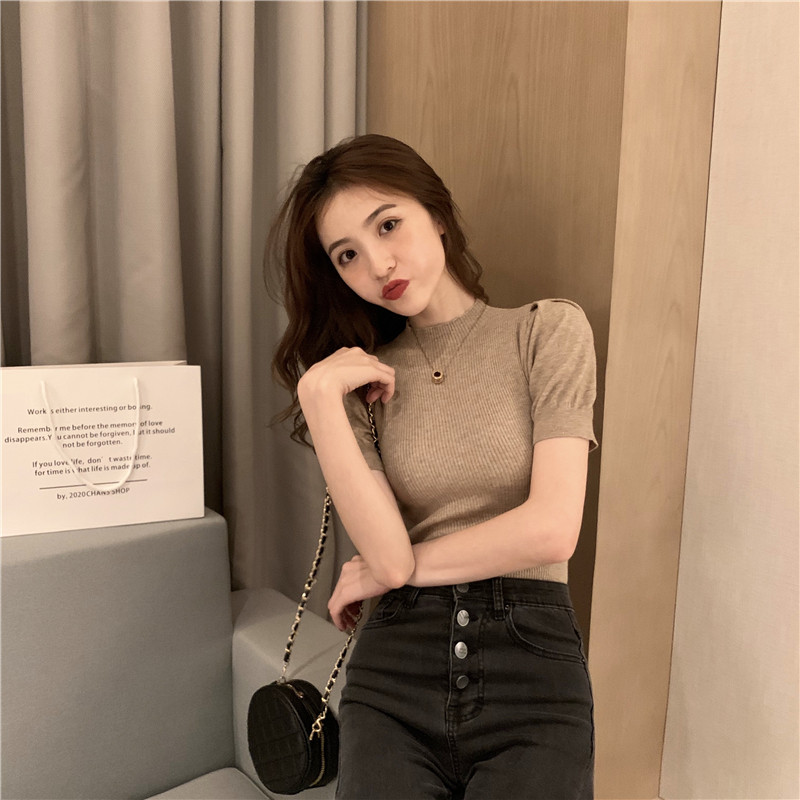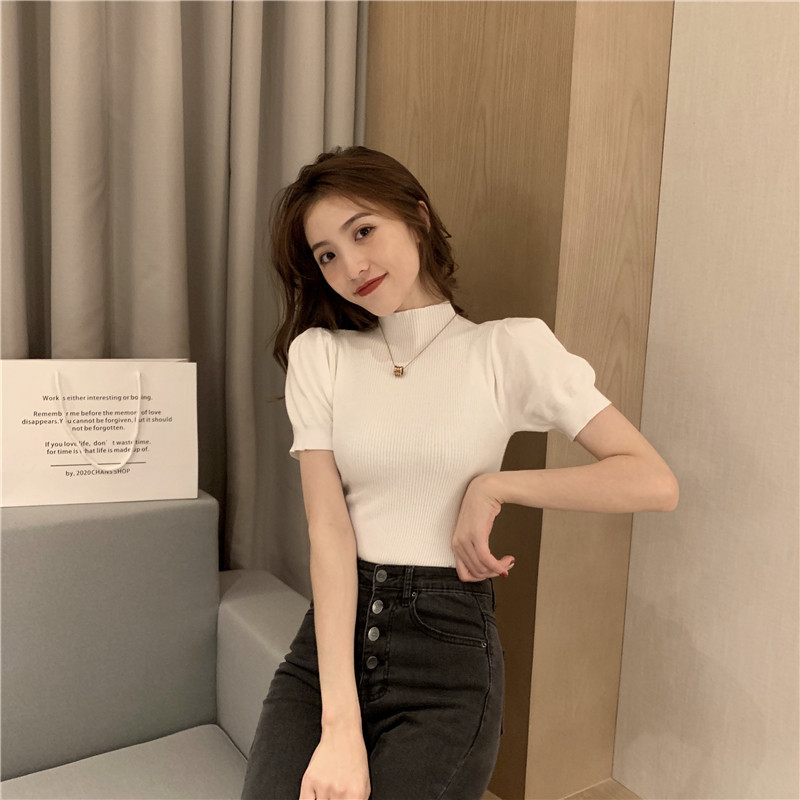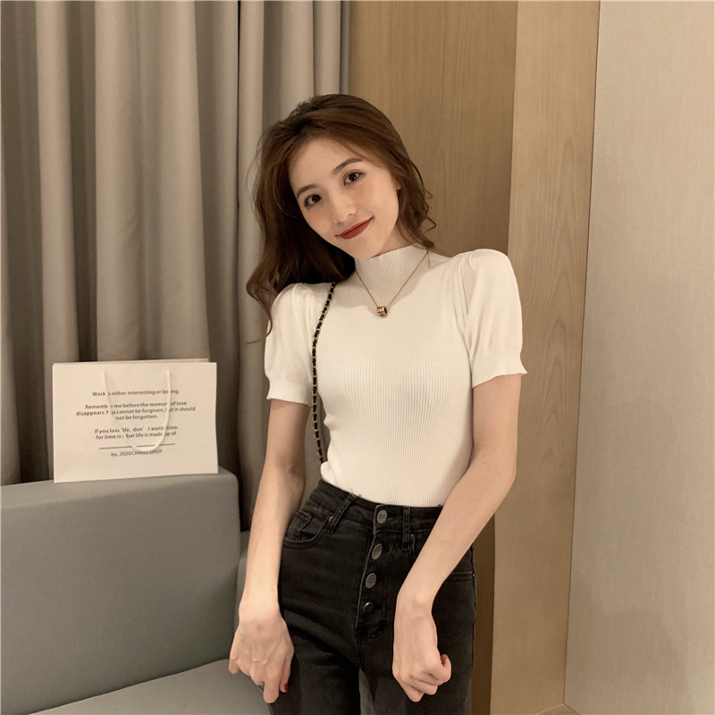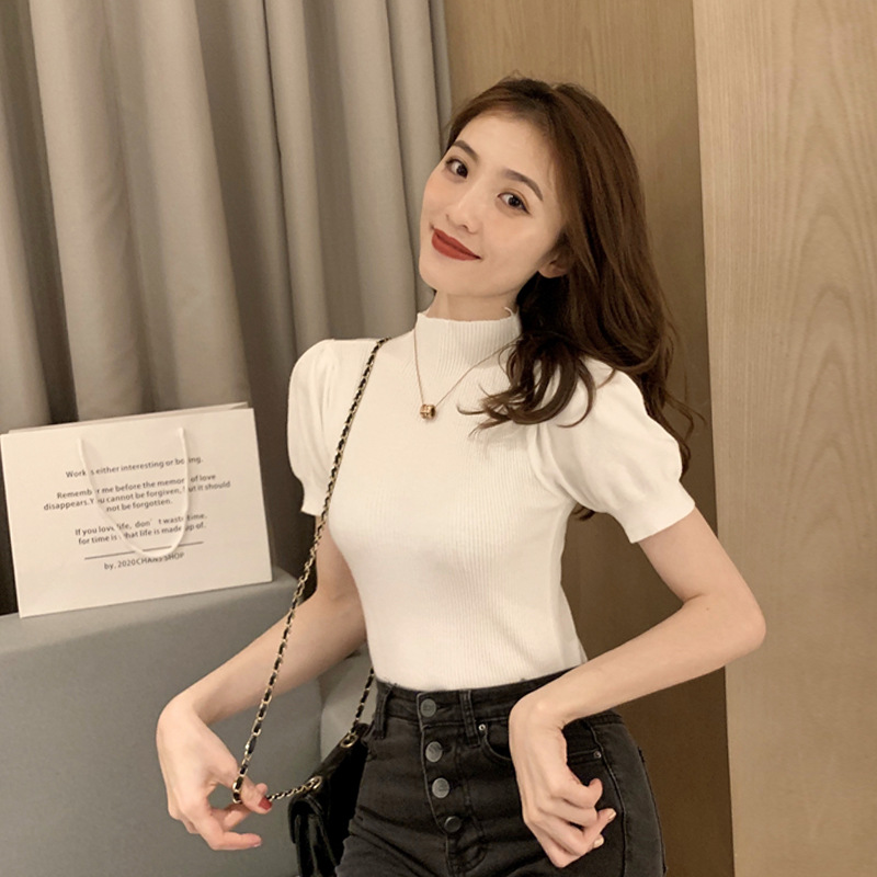 2025 초가을 여성을위한 새로운 스타일 하프 터틀넥 반팔 바닥 셔츠 흰색 슬림 피트 내부 세련된 니트 스웨터 탑
