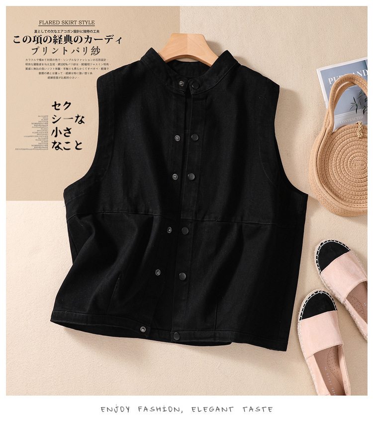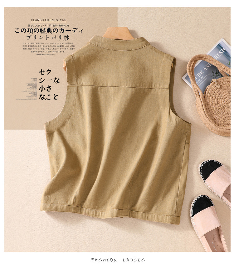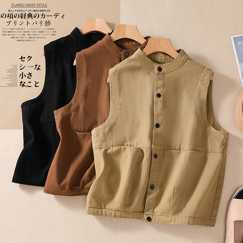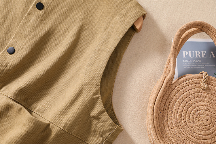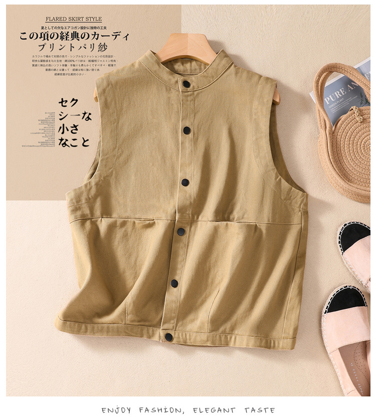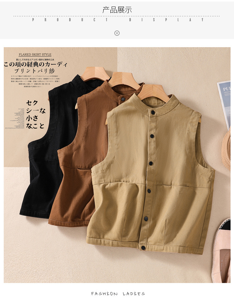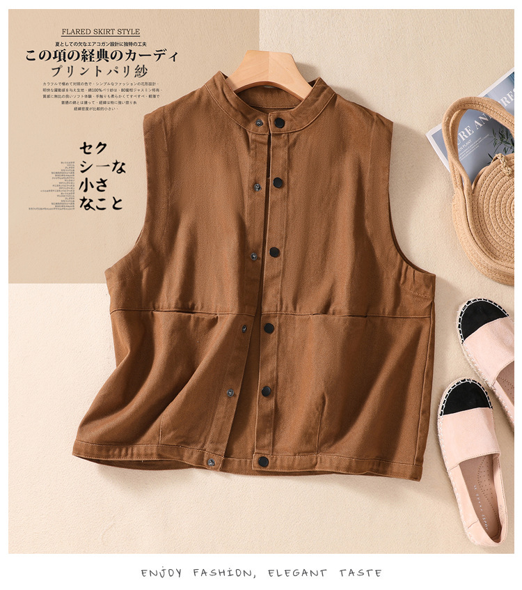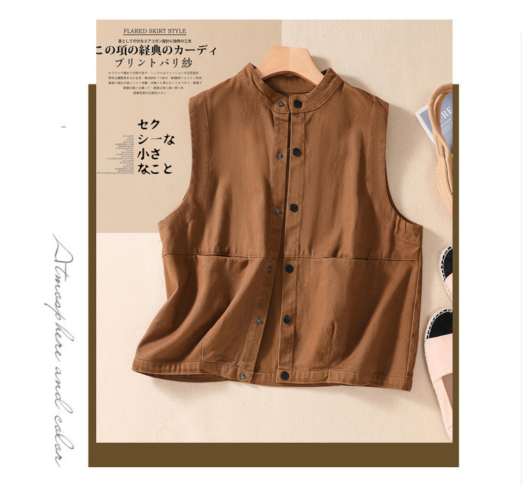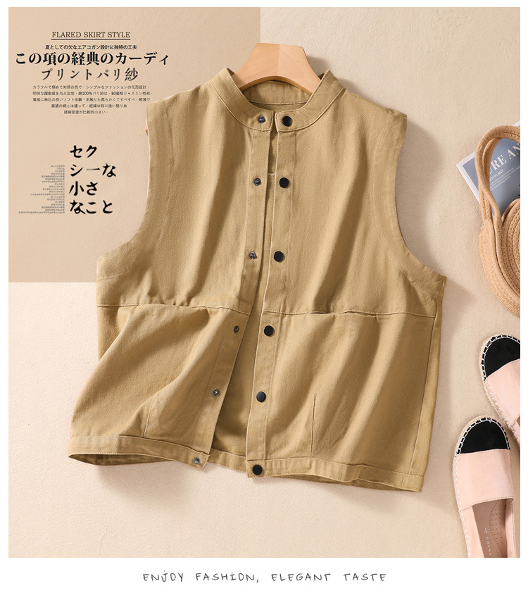 봄과 여름 2024 새로운 빈티지 트윌 코튼 조끼 느슨한 짧은 민소매 카디건 우아한 조끼 재킷