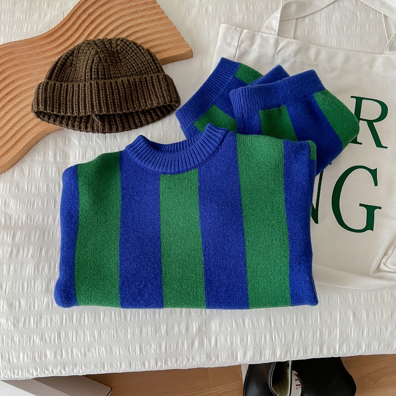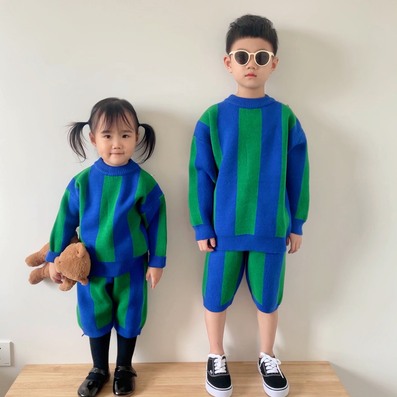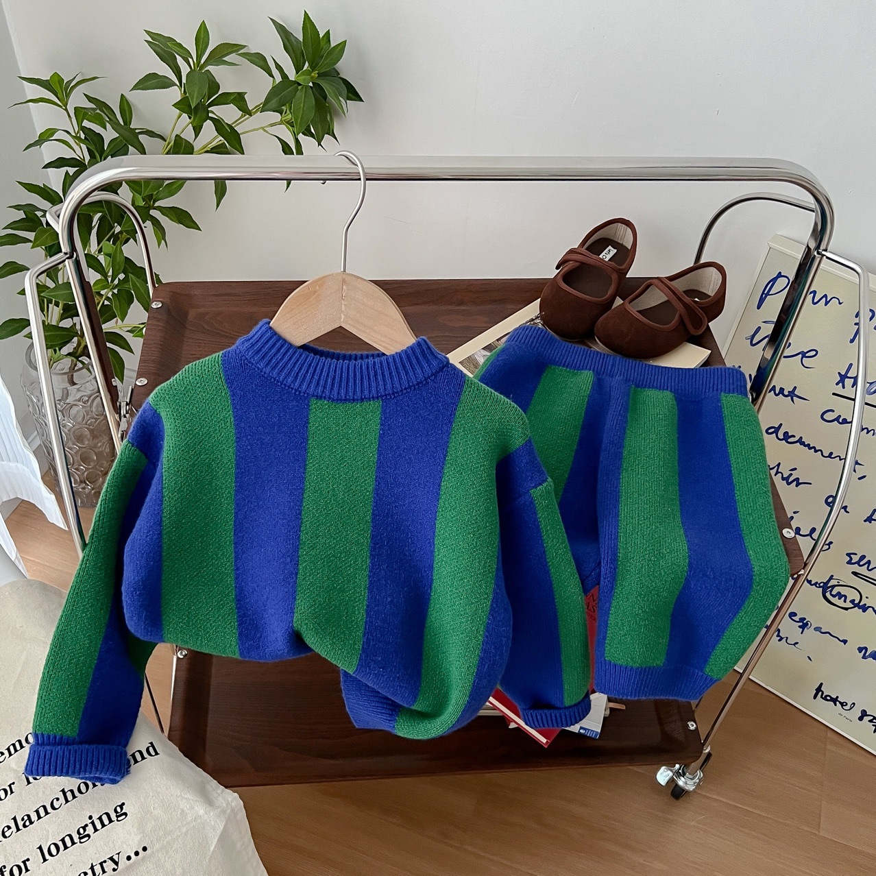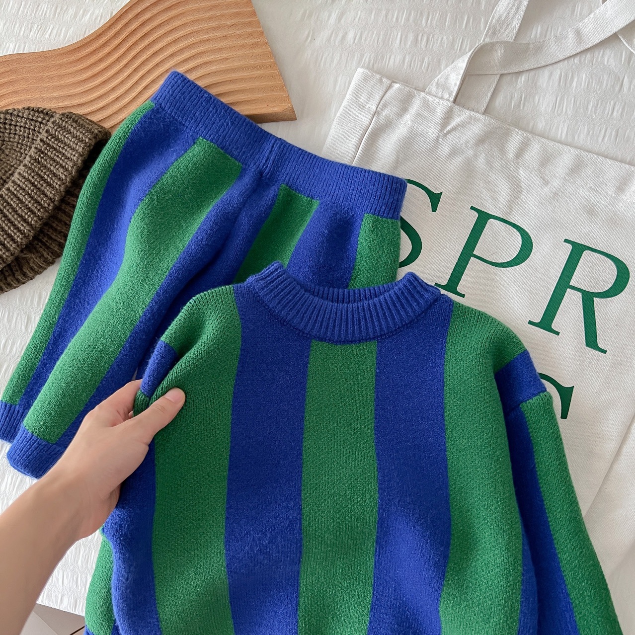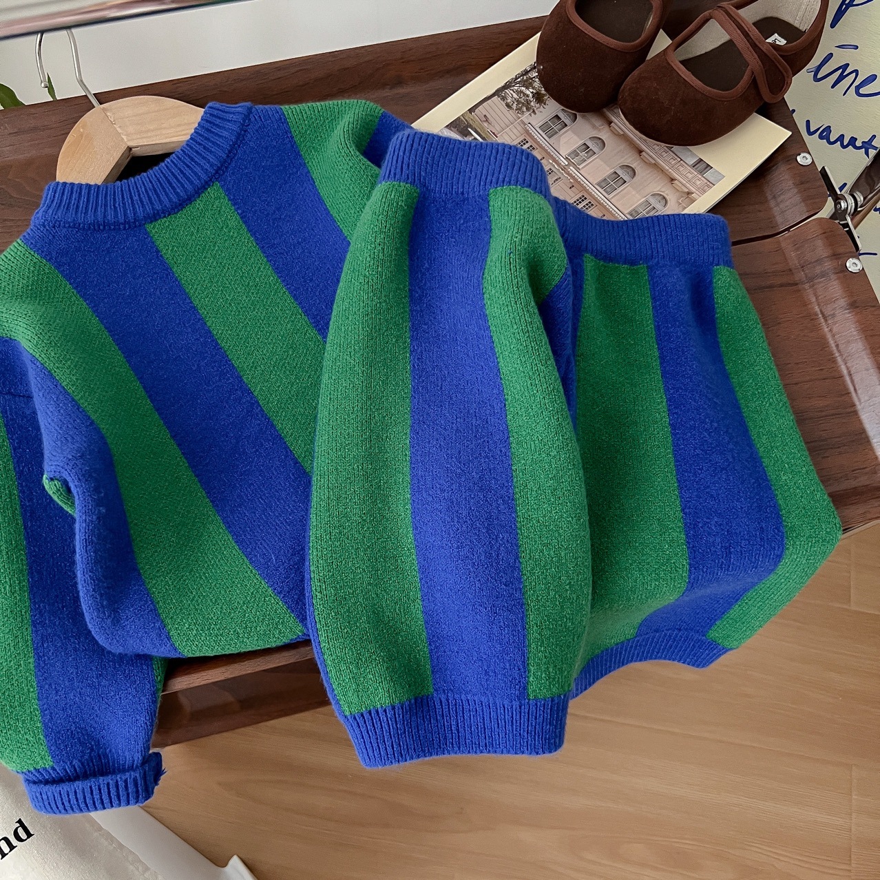 2025 가을 신상 아동복 ins 남녀 아동 스트라이프 스웨터 어린이 배색 니트웨어 아기 상의+반바지스토어 가기