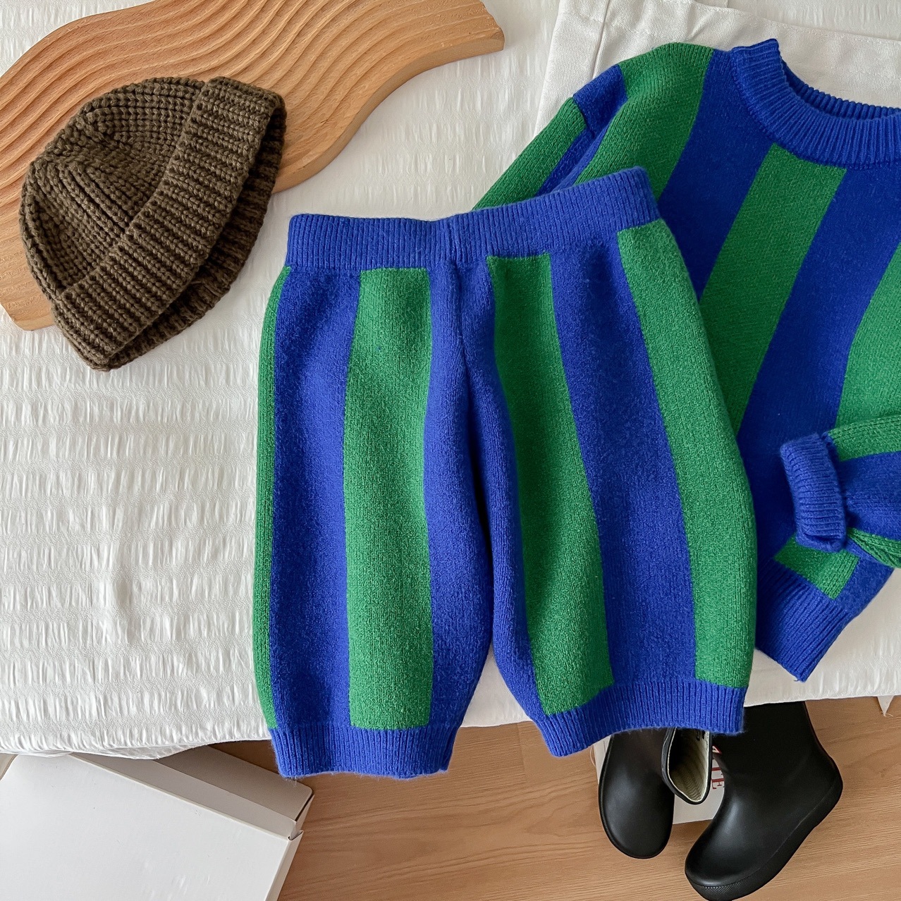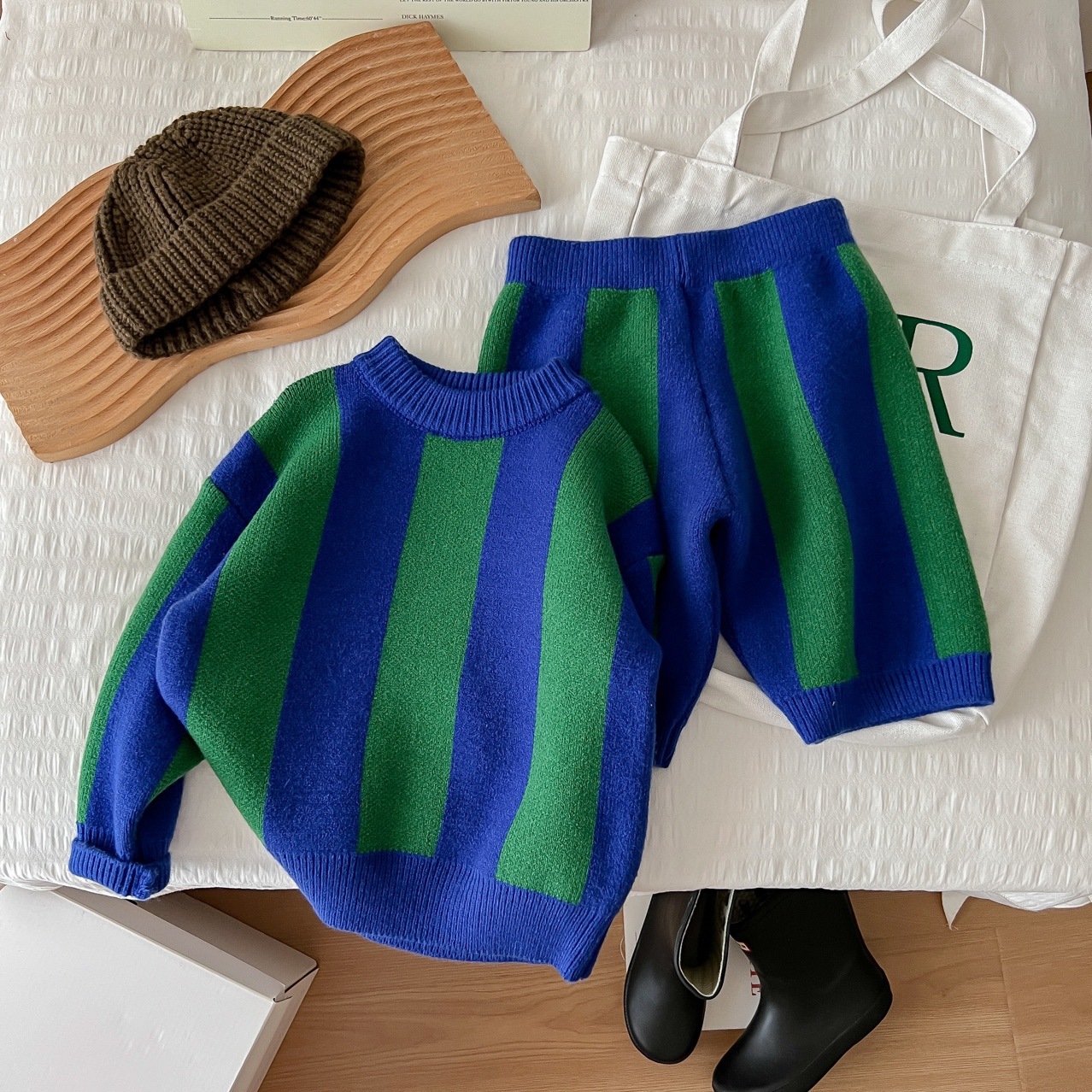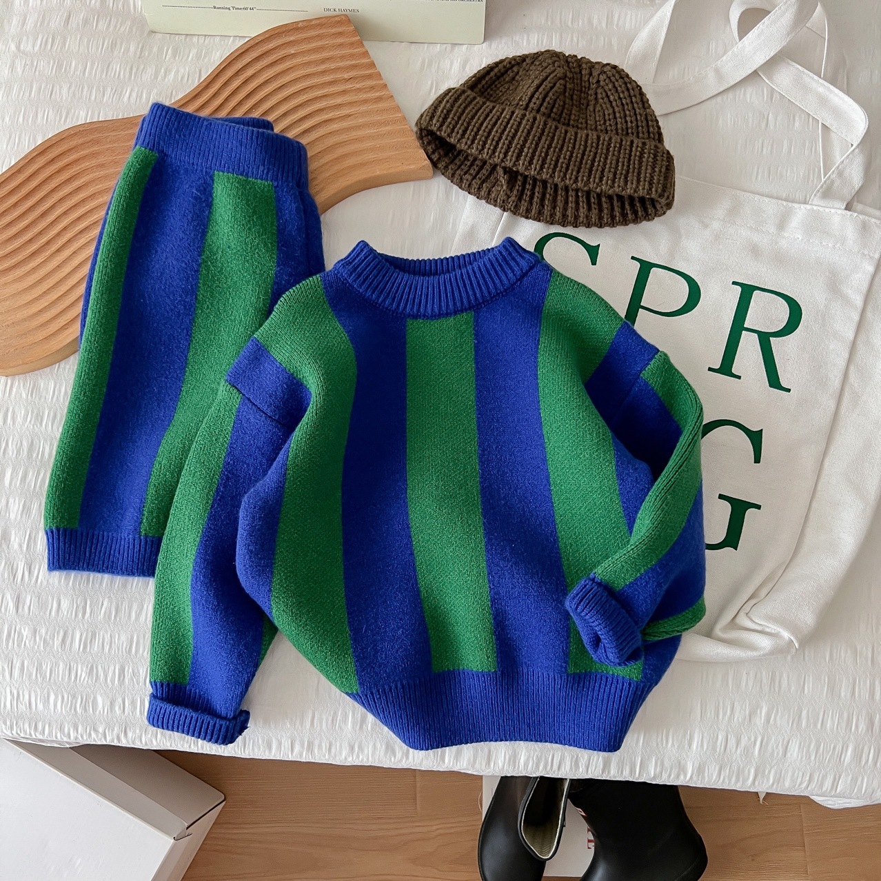 2025 가을 신상 아동복 ins 남녀 아동 스트라이프 스웨터 어린이 배색 니트웨어 아기 상의+반바지