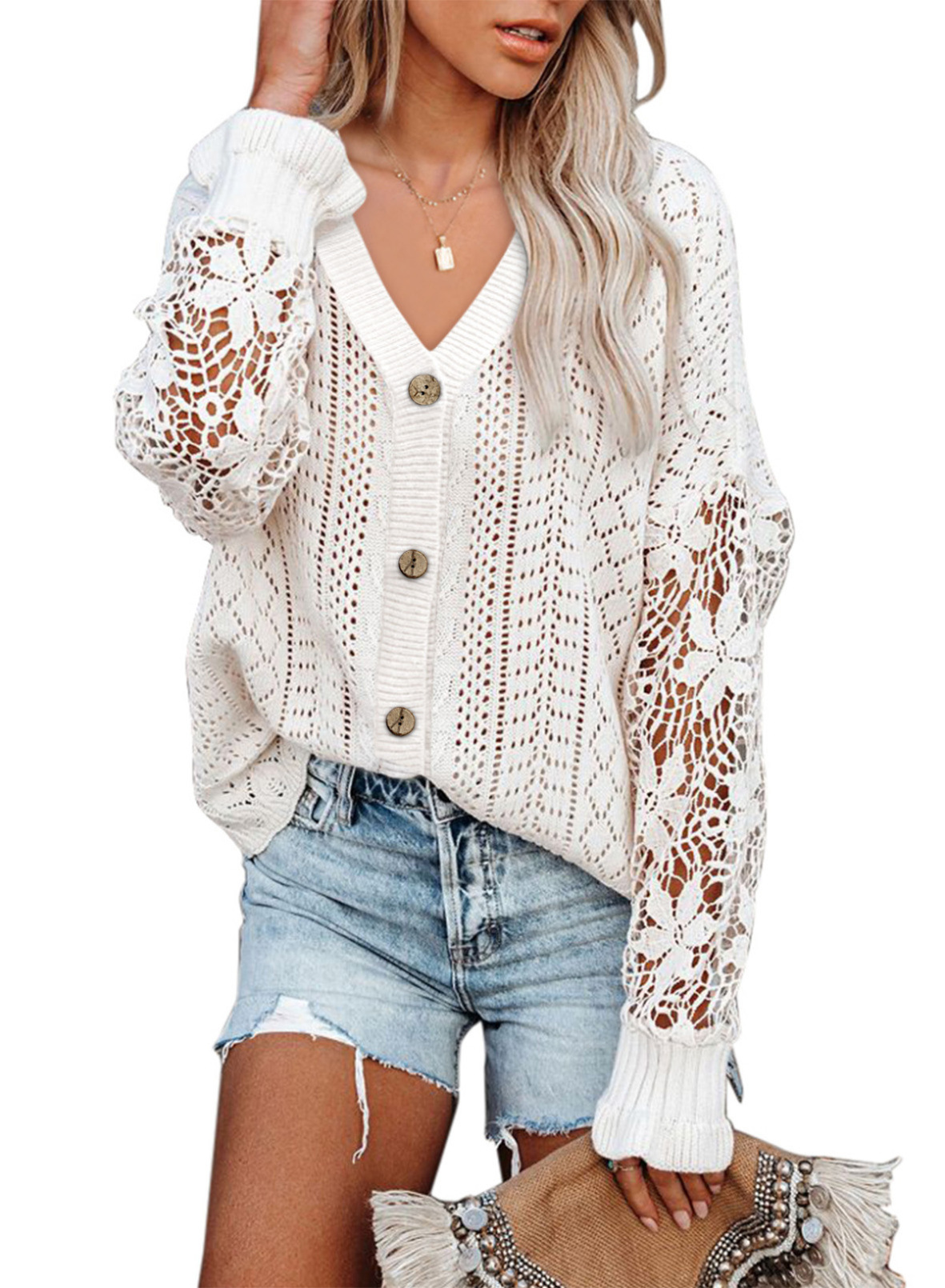 아마존 크로스 보더 캐주얼 솔리드 컬러 모든 매치 가디건 스웨터 유럽과 미국 중공 레이스 긴 소매 V-넥 스웨터 여성용 탑스토어 가기
