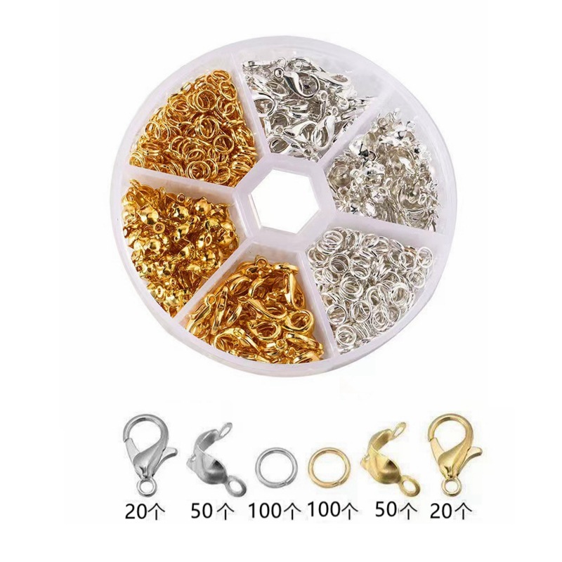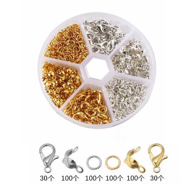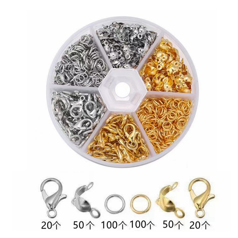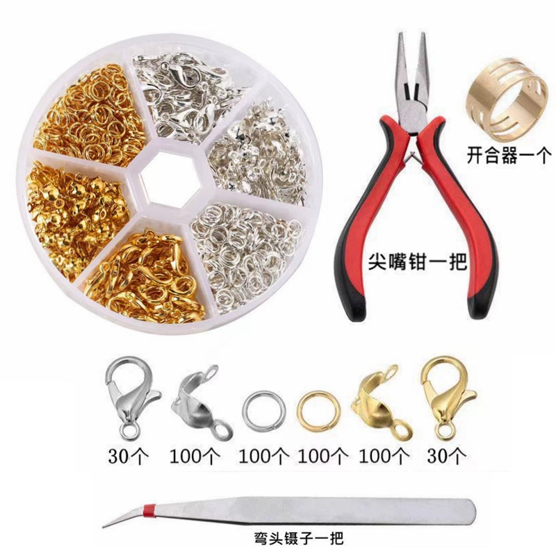(规格):龙虾扣6*12mm(各30个),单圈0.7*5mm(各100           个),包扣7*4mm(各100个),尖嘴钳一把,            开合器一个,弯头镊子一把。