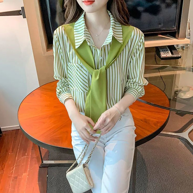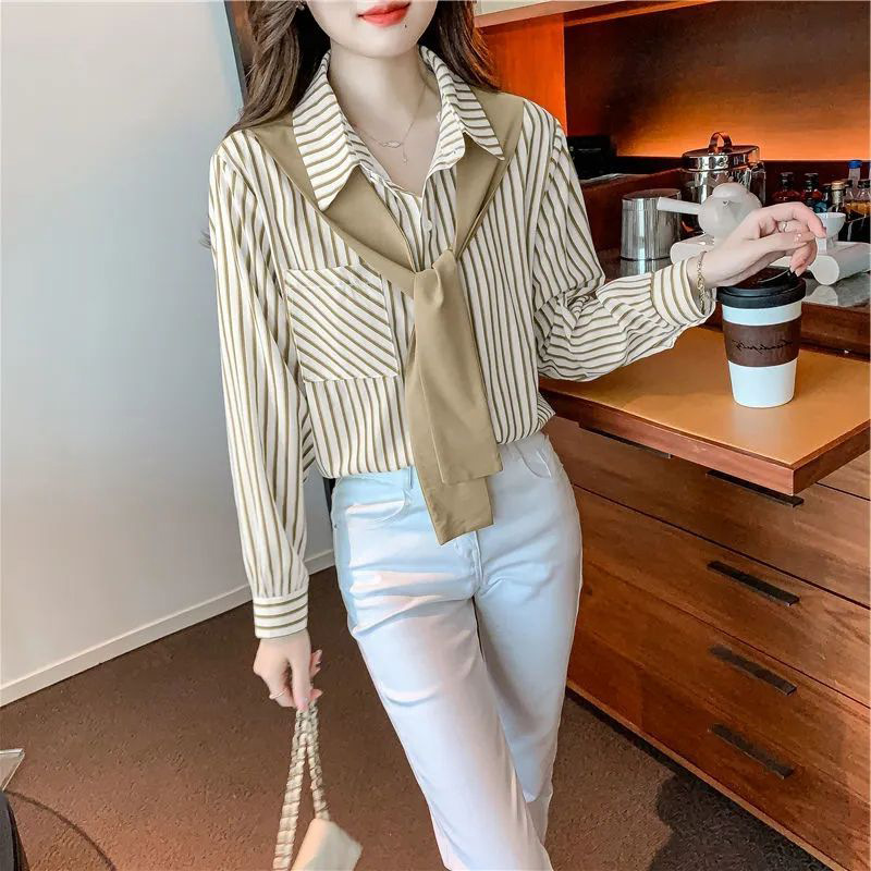 봄 아카데미 스타일 스티칭 숄 가짜 투피스 스트라이프 포켓 셔츠 느슨한 세련된 셔츠 슬림핏 캐주얼 라이트 럭셔리
