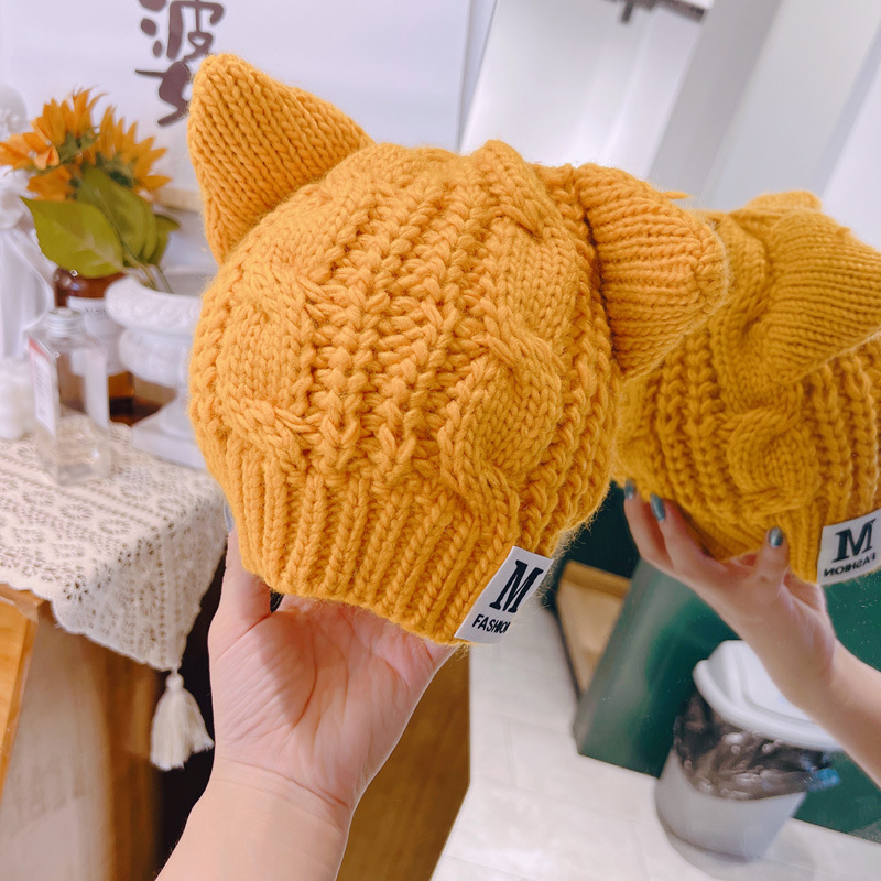 귀여운 슈퍼 귀여운 만화 고양이 귀 양모 모자 M-마크 가을과 겨울 따뜻한 귀 보호 수제 니트 모자 어린이 모자 모든 경기스토어 가기