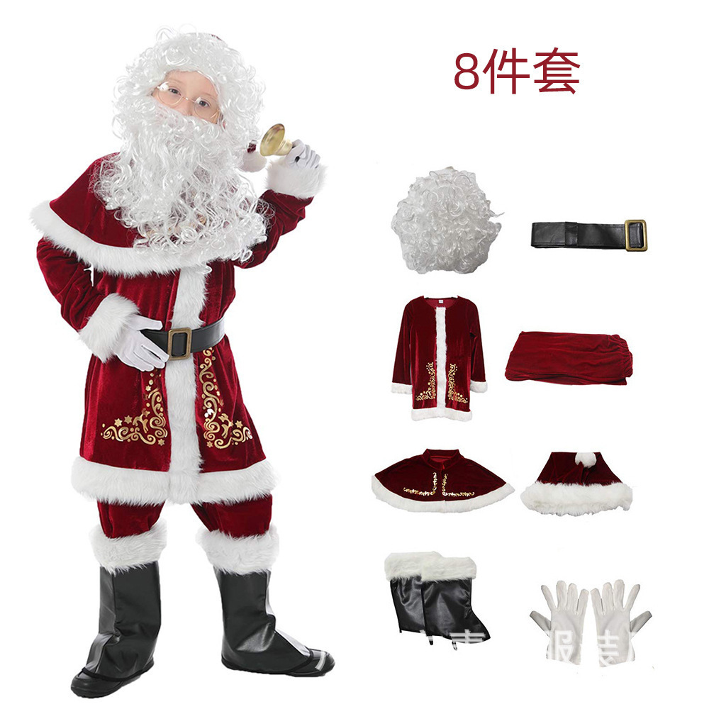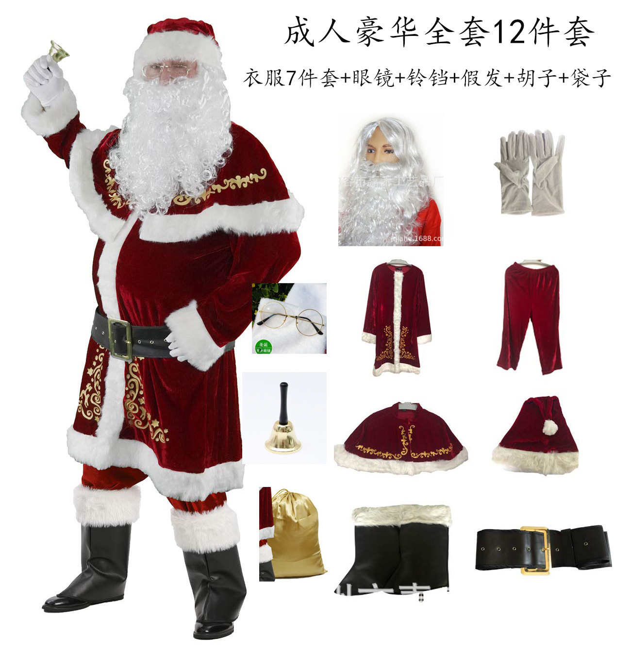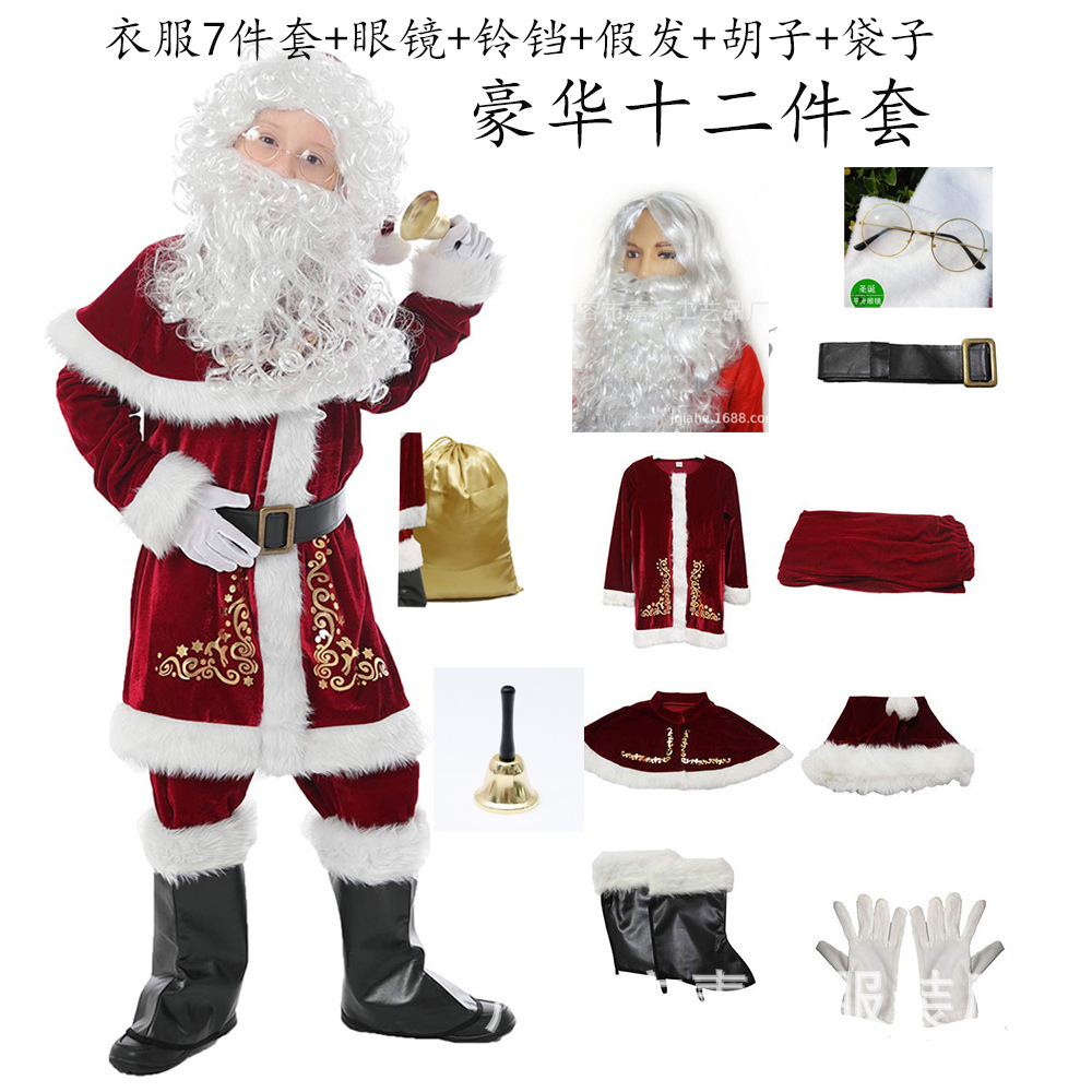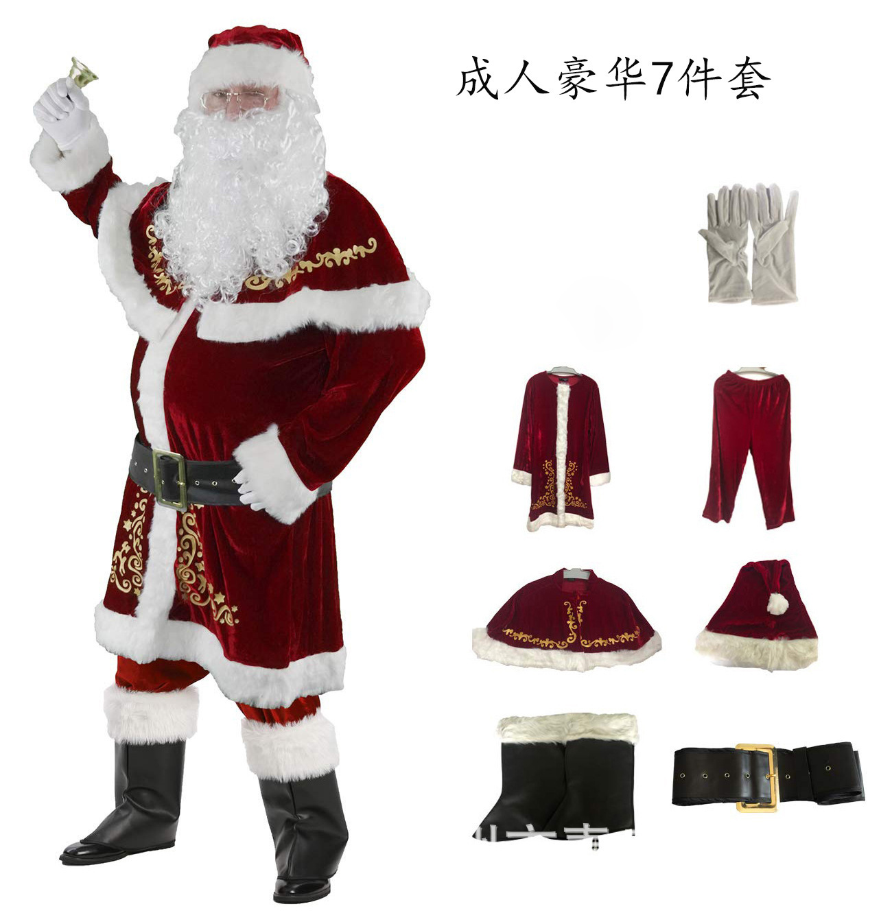 产品包含:圣诞帽,披肩,上衣,裤子,腰带,手套一双,鞋套一对
