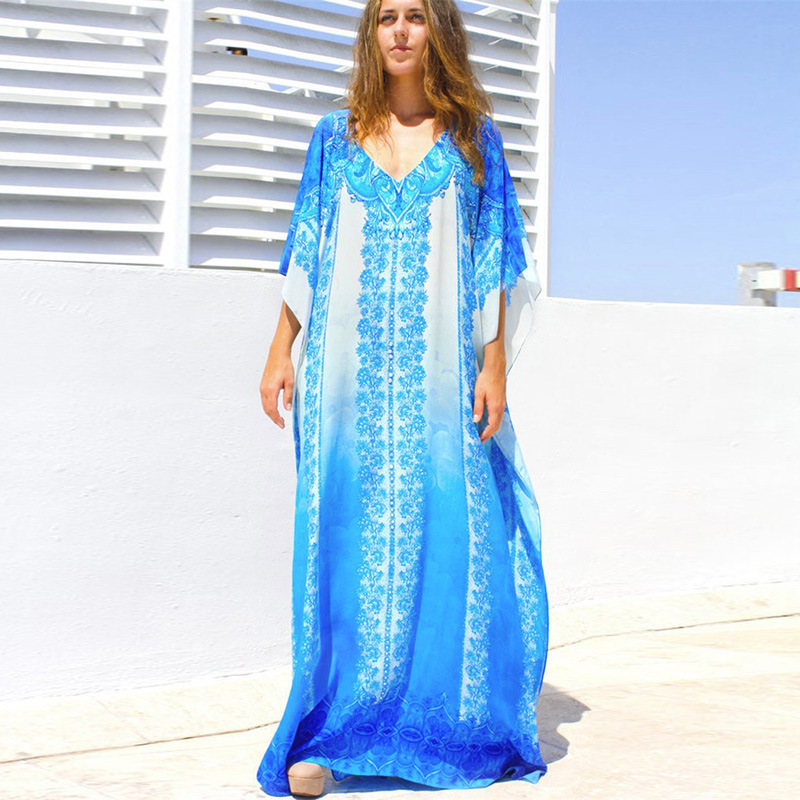 유럽과 미국 크로스 국경 면 위치 인쇄 비치 스커트 휴가 태양 보호 원피스 비키니 수영복 여자의 바깥 블라우스스토어 가기