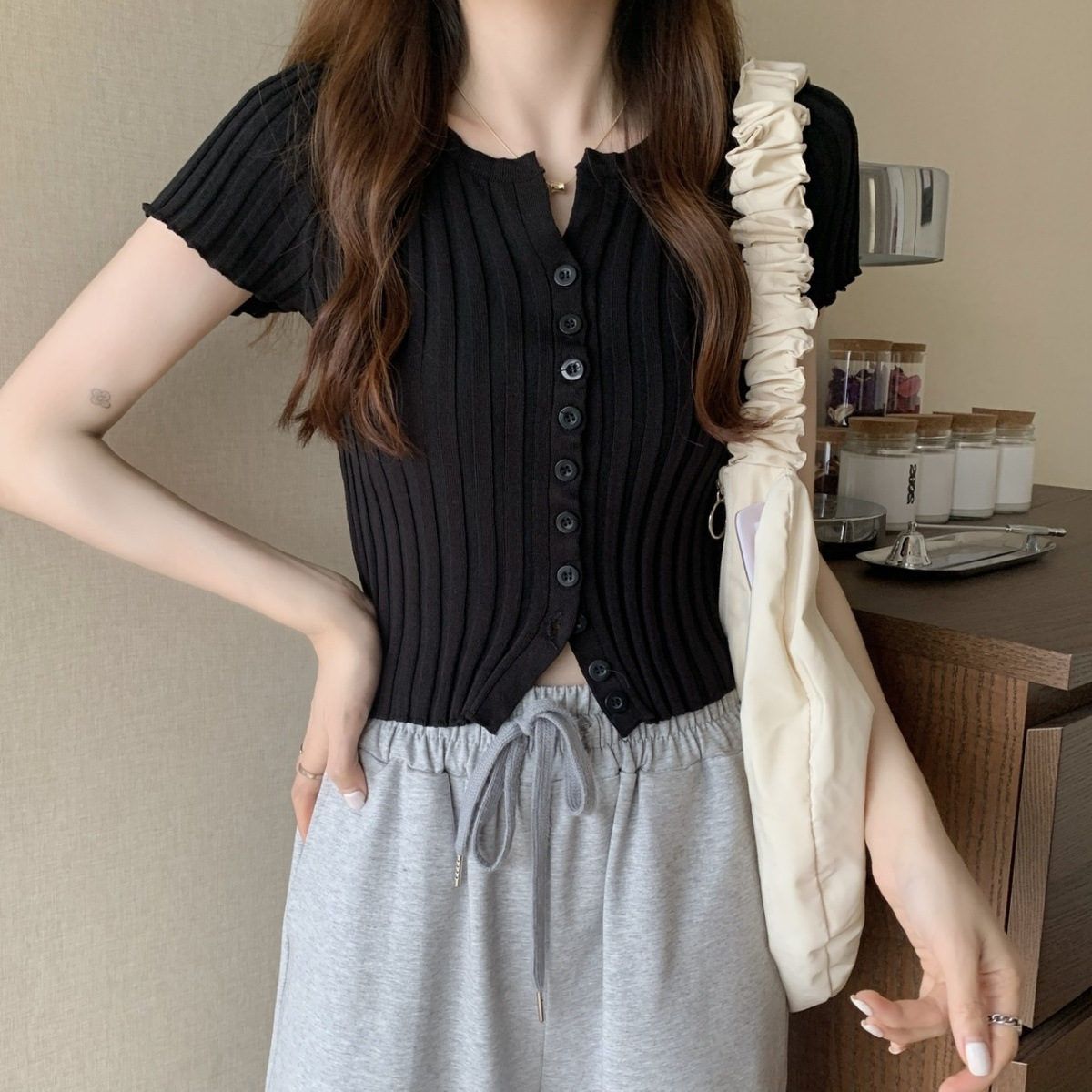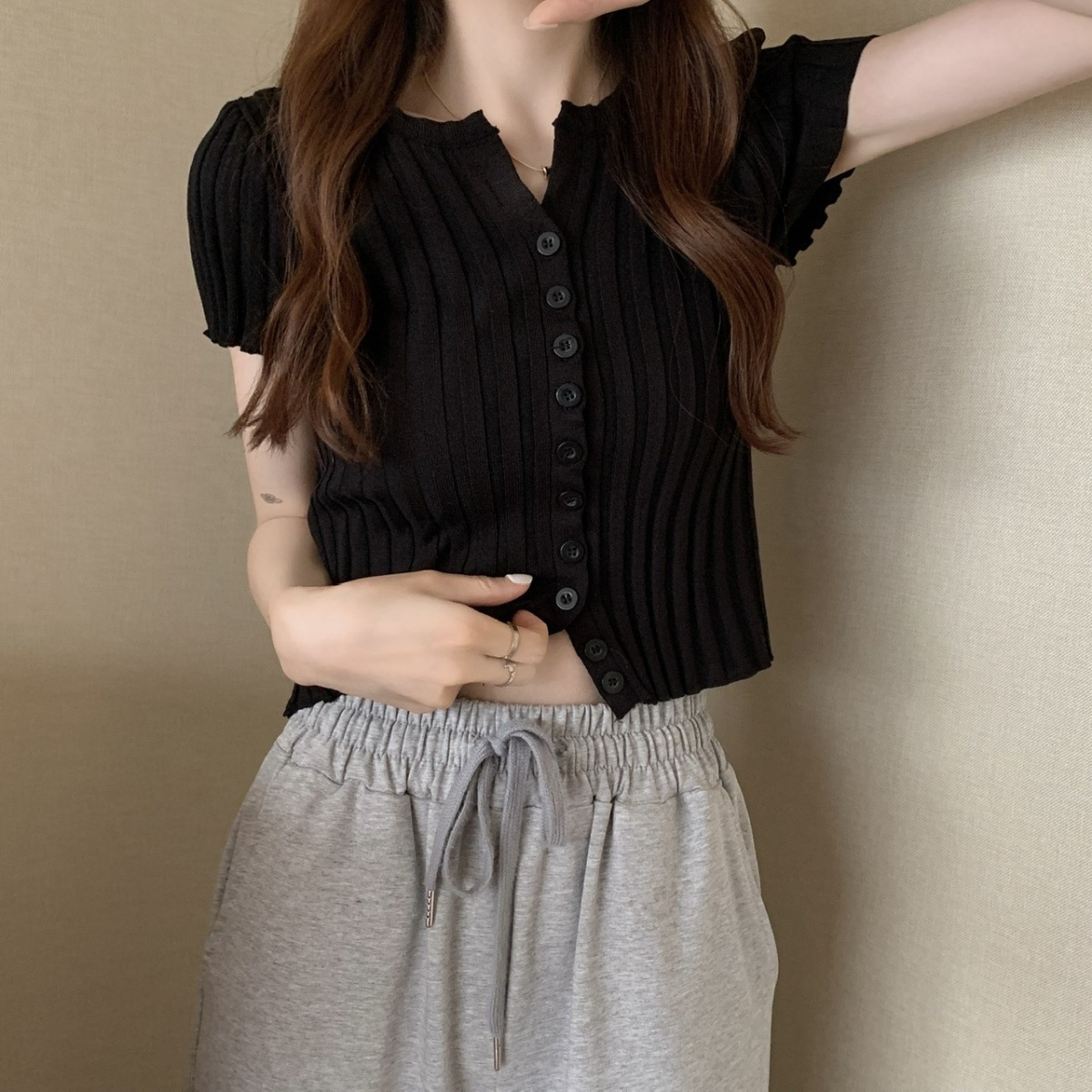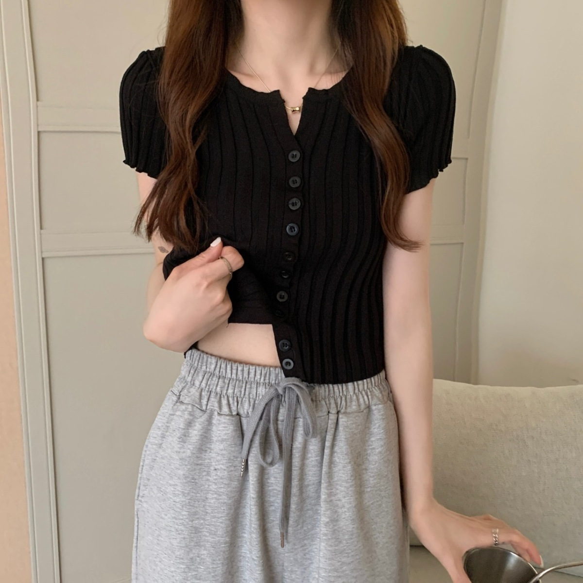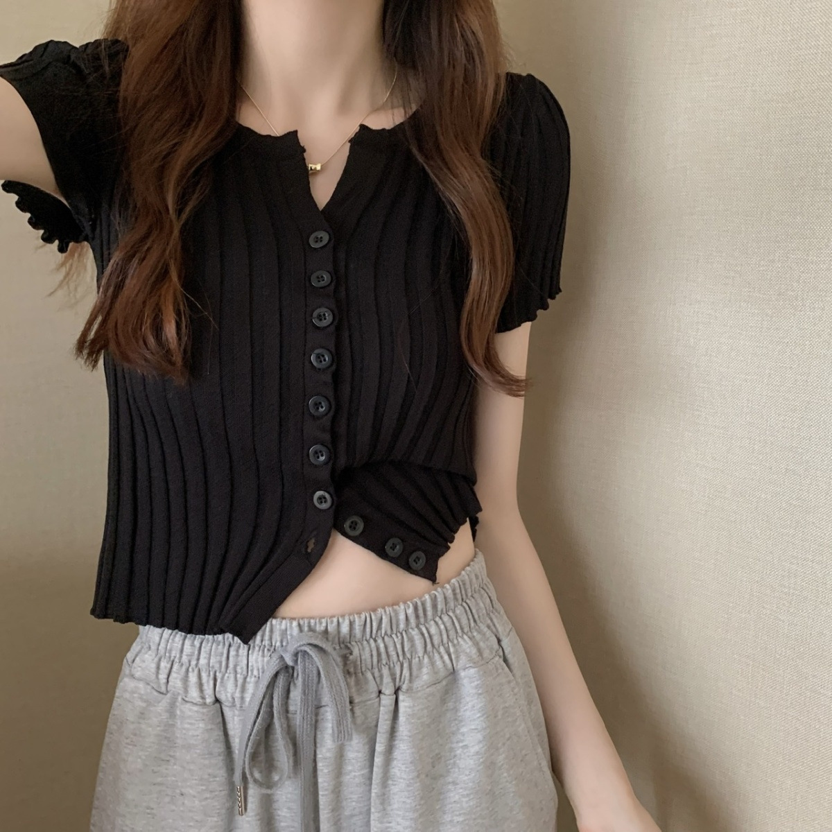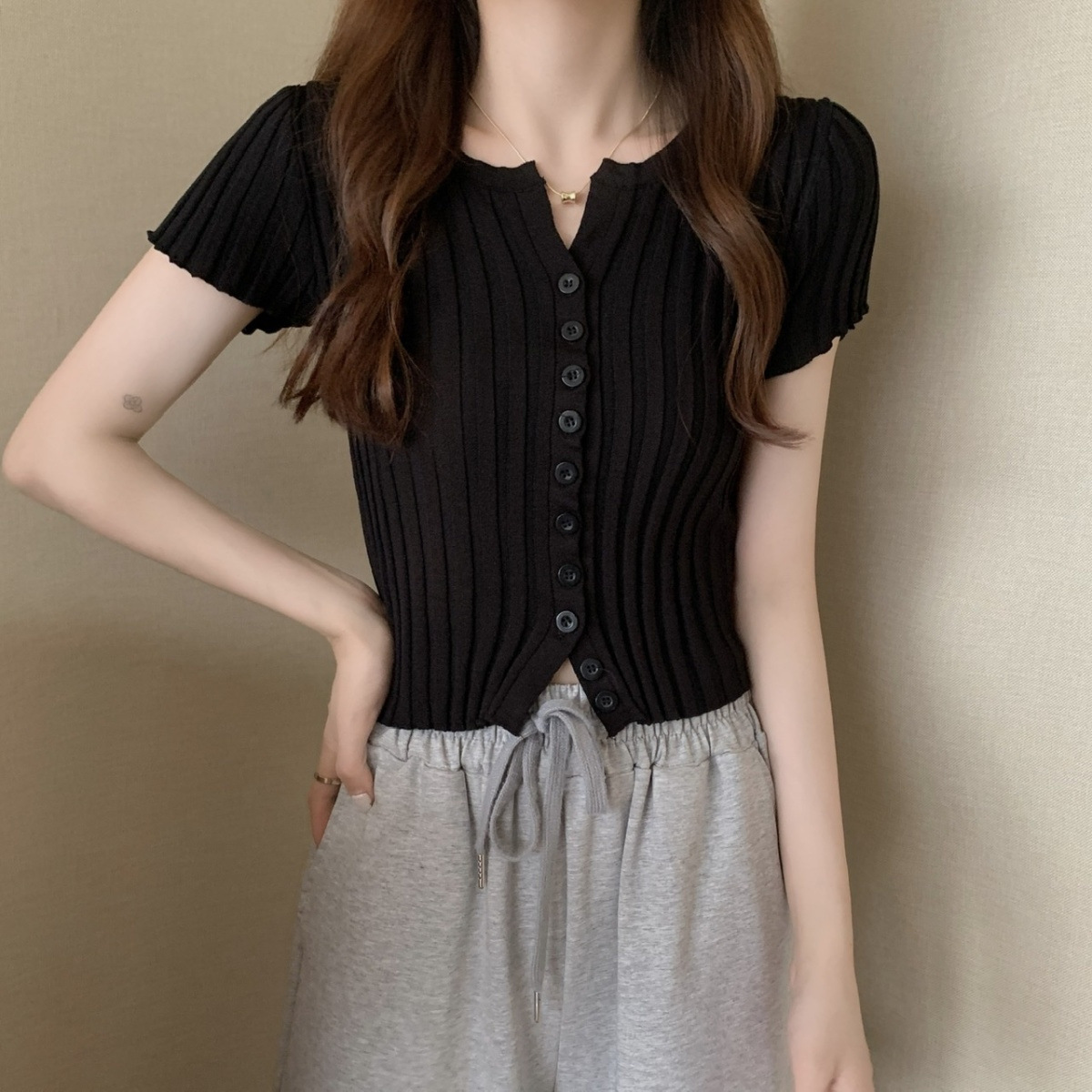 블랙 크롭 하이웨이스트 니트 반팔 티셔츠 여성용 핫걸 타이트핏 숏탑 여름 얇은 스타일 2026 신상스토어 가기