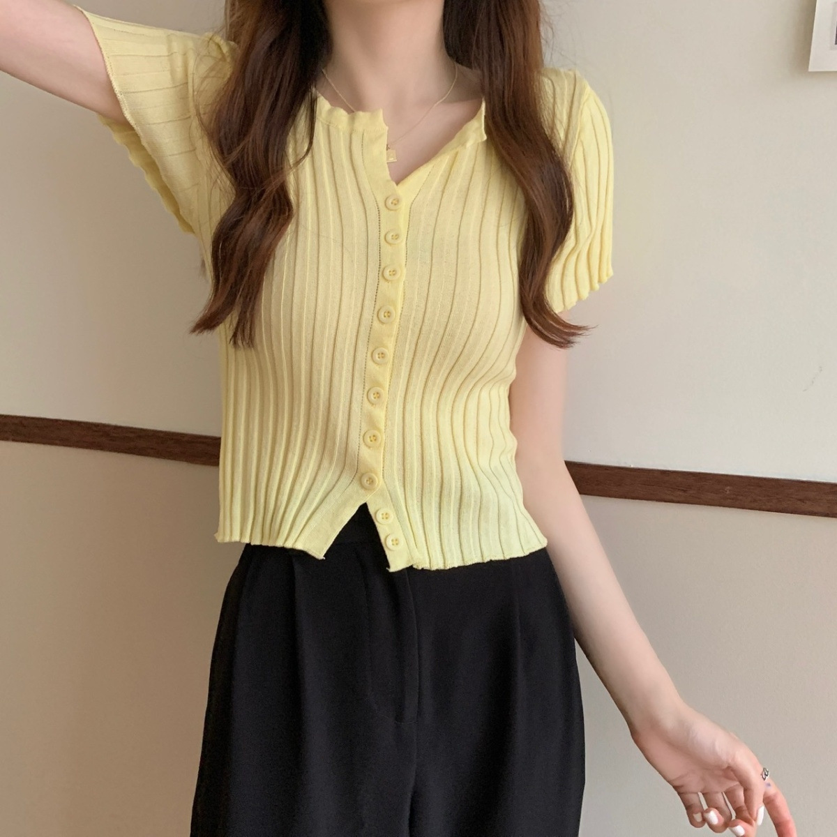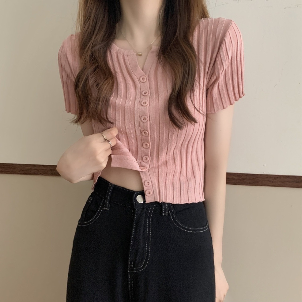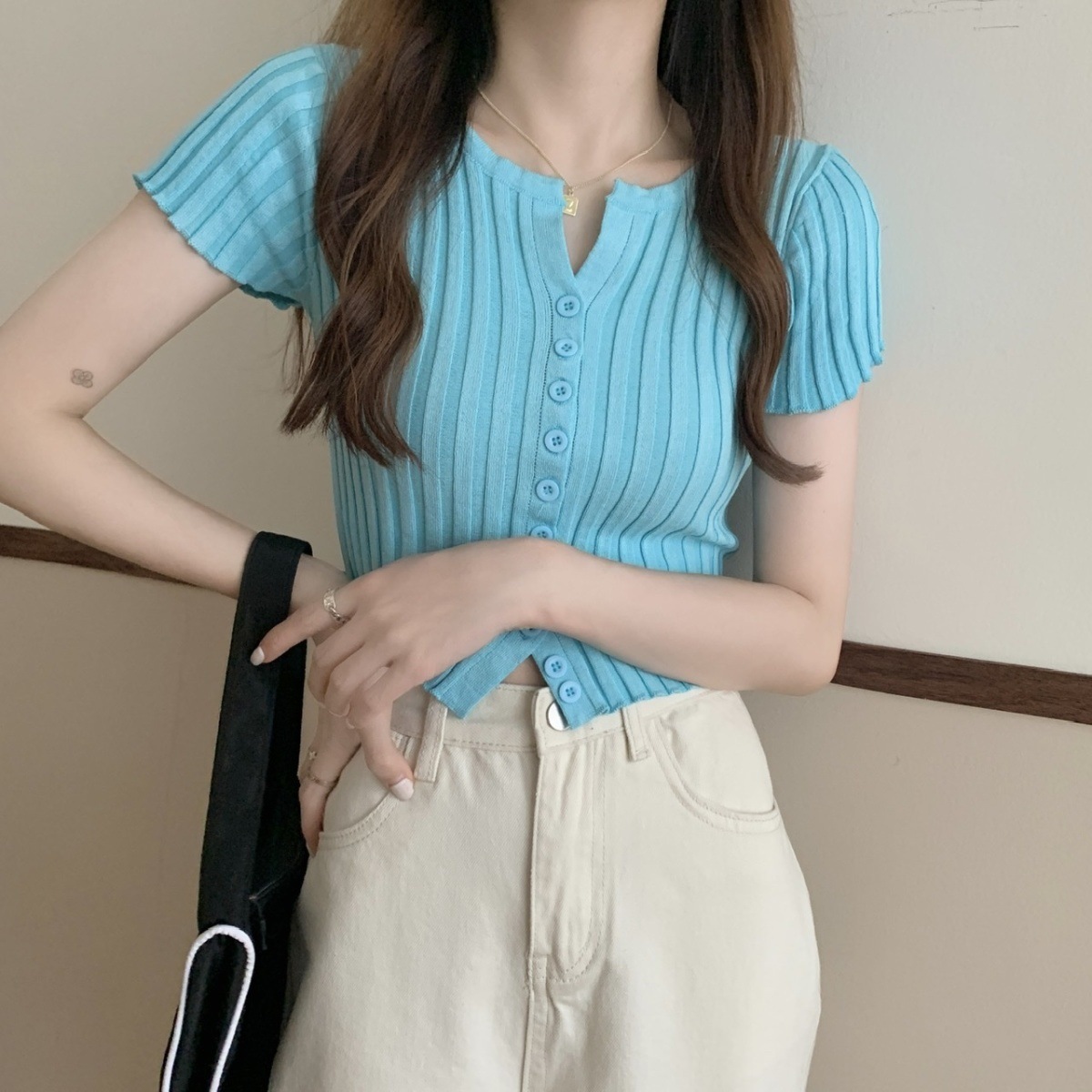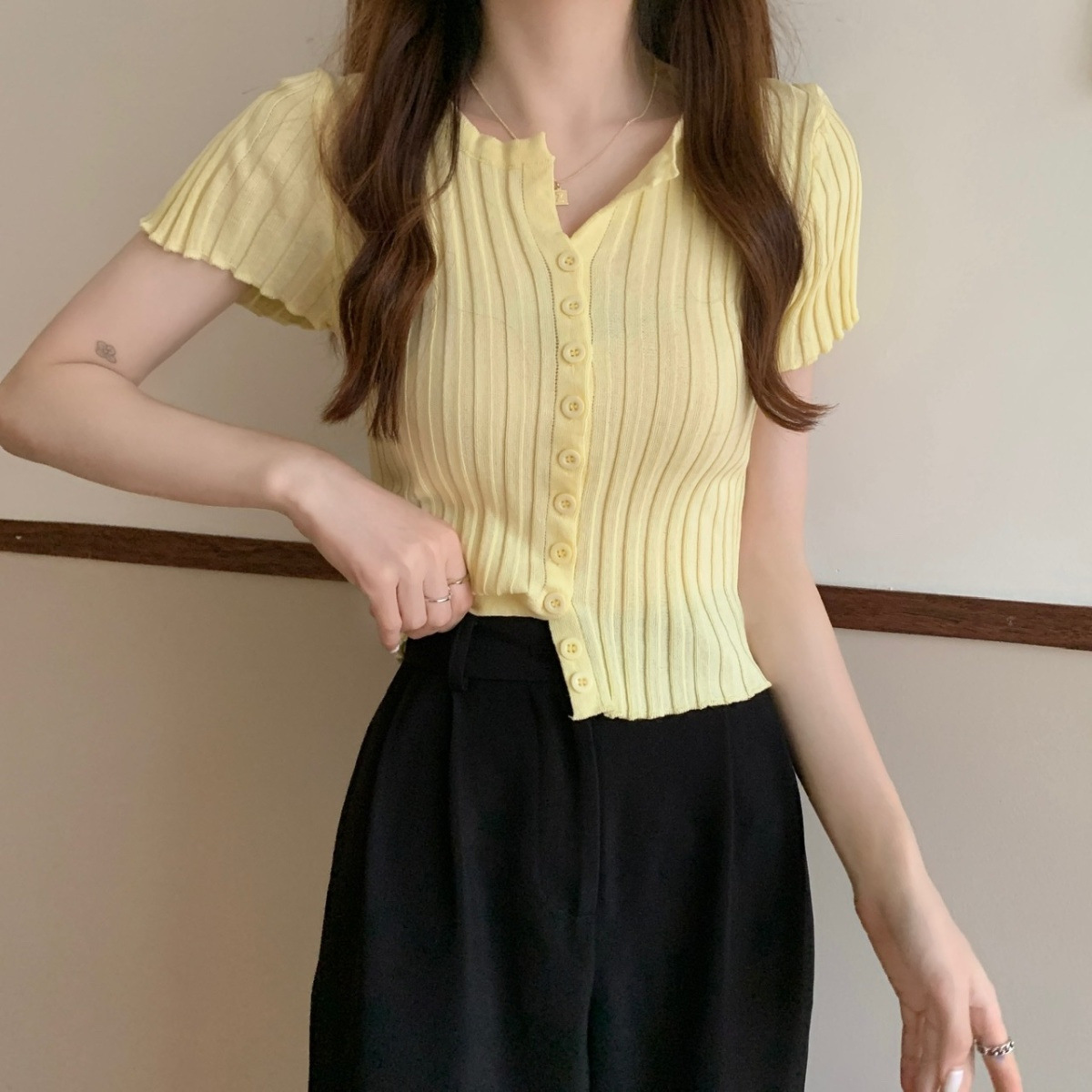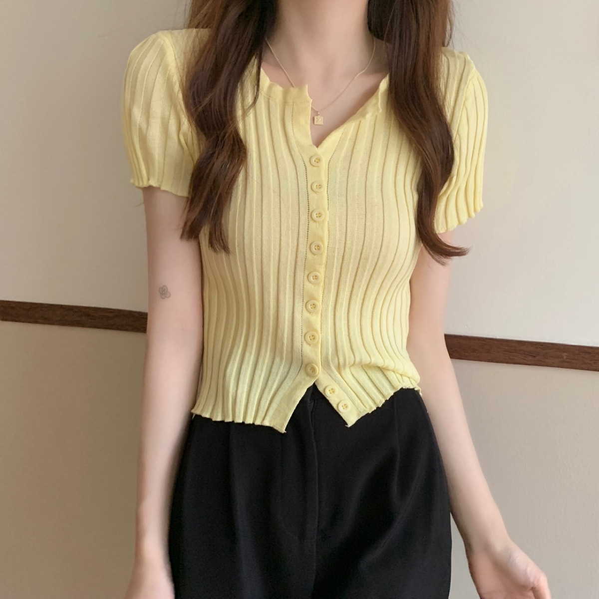 블랙 크롭 하이웨이스트 니트 반팔 티셔츠 여성용 핫걸 타이트핏 숏탑 여름 얇은 스타일 2026 신상스토어 가기