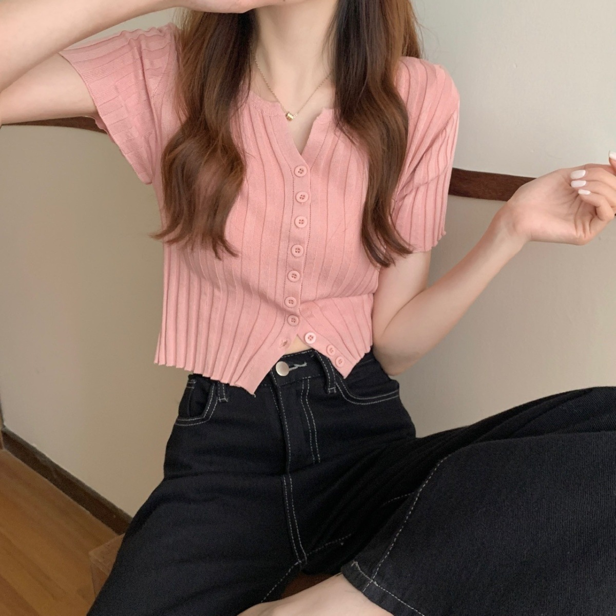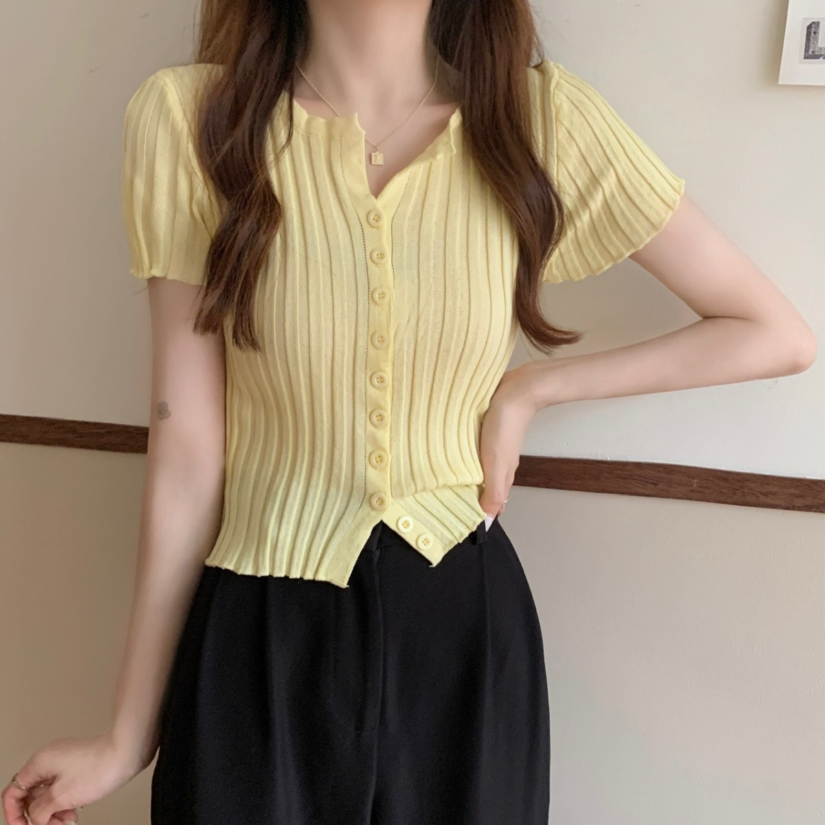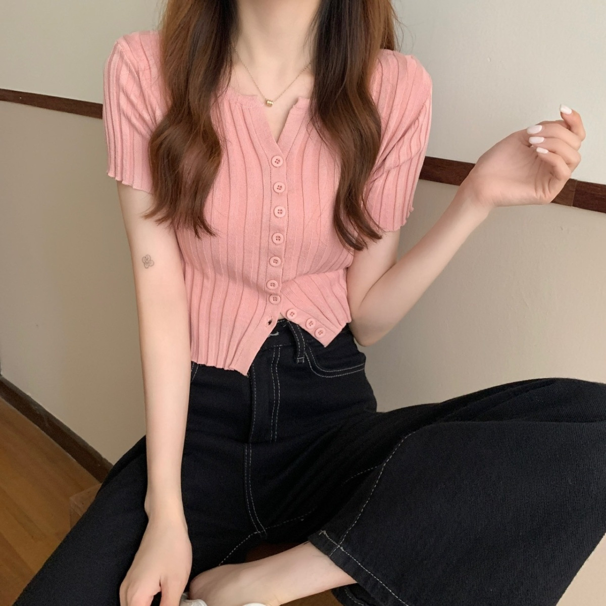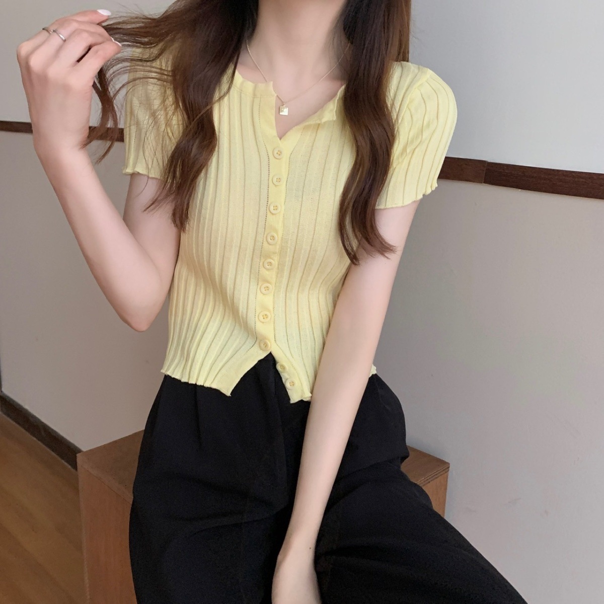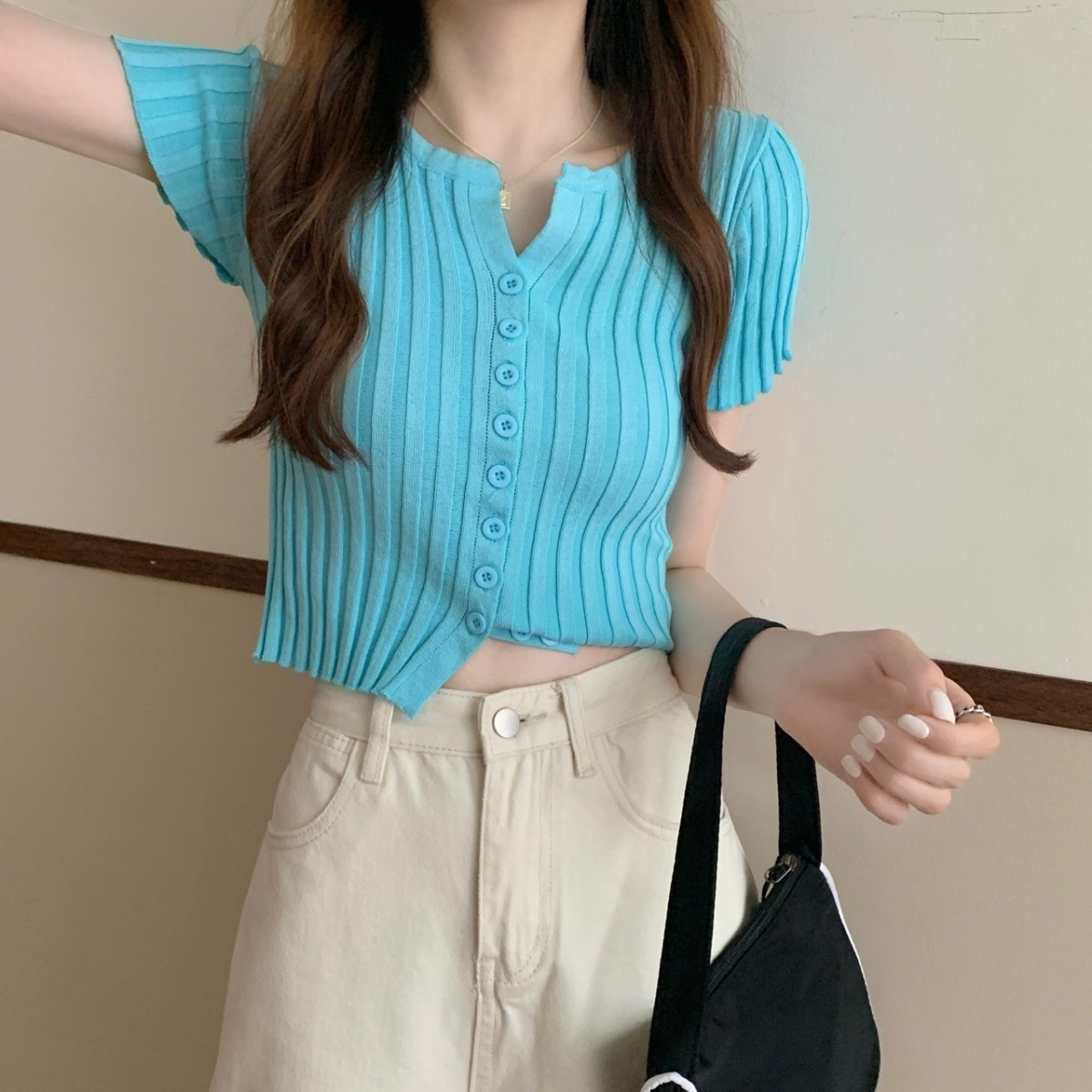 블랙 크롭 하이웨이스트 니트 반팔 티셔츠 여성용 핫걸 타이트핏 숏탑 여름 얇은 스타일 2026 신상스토어 가기