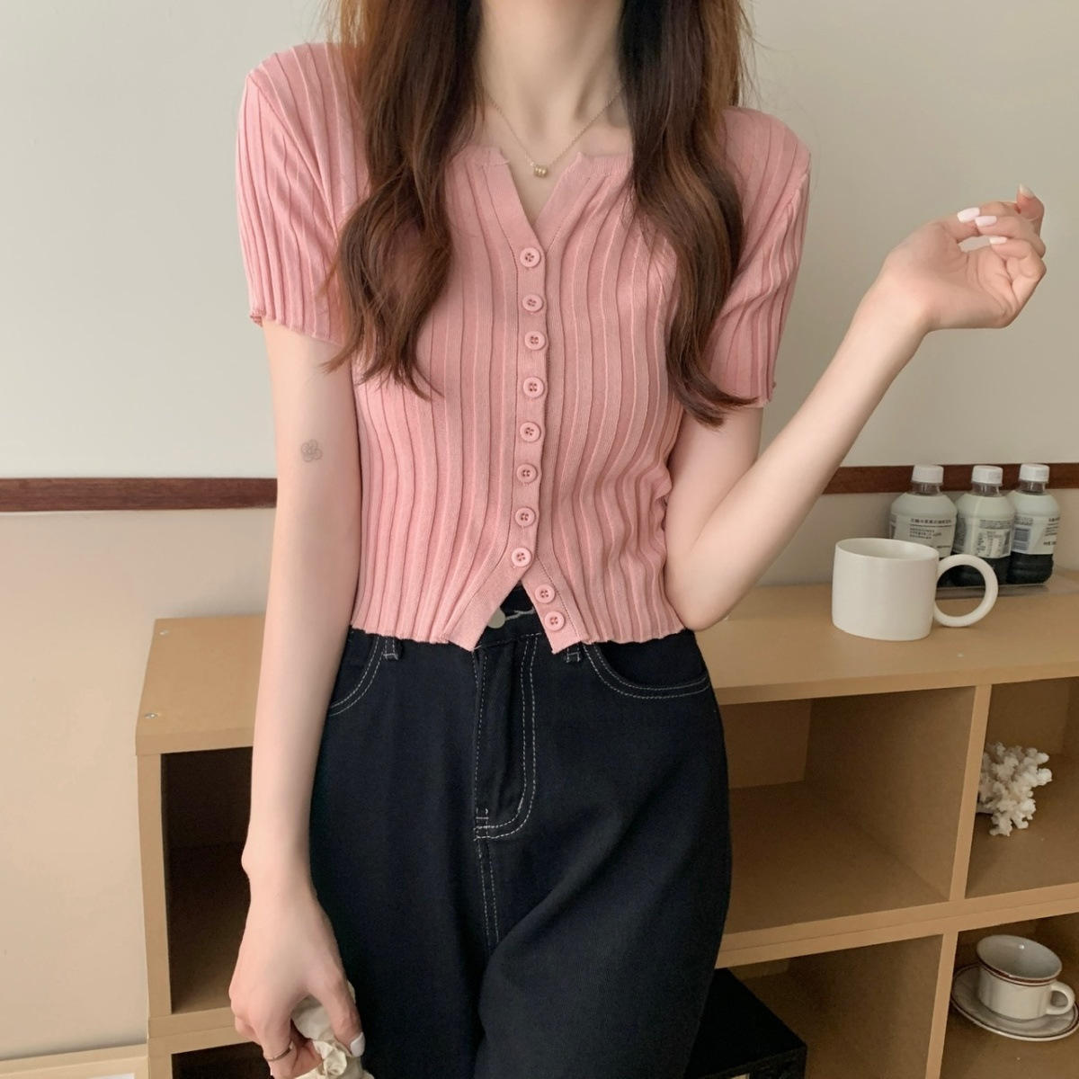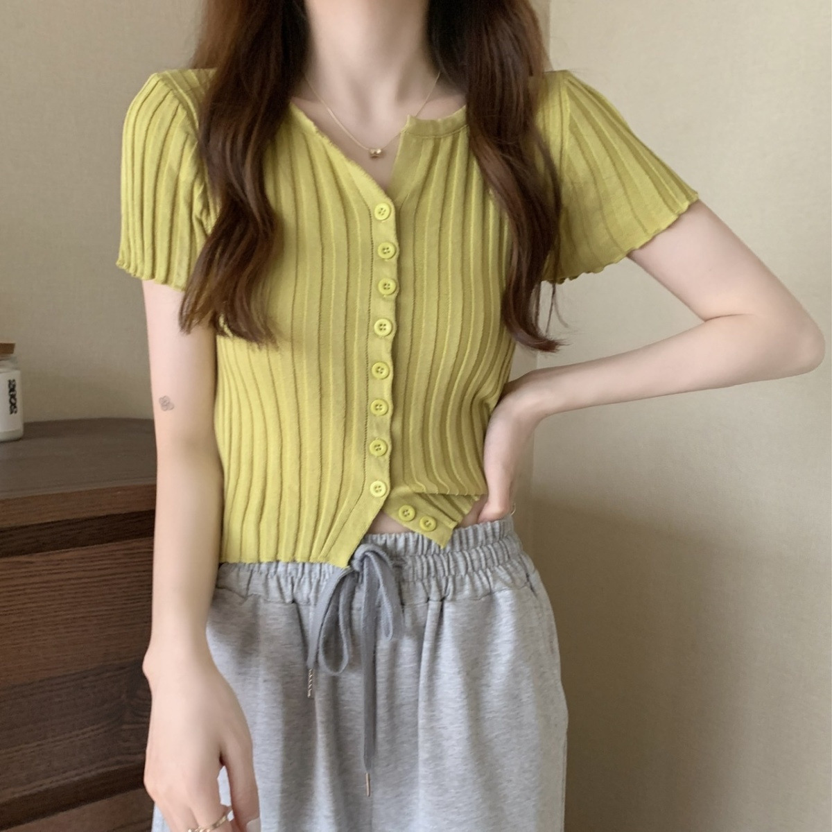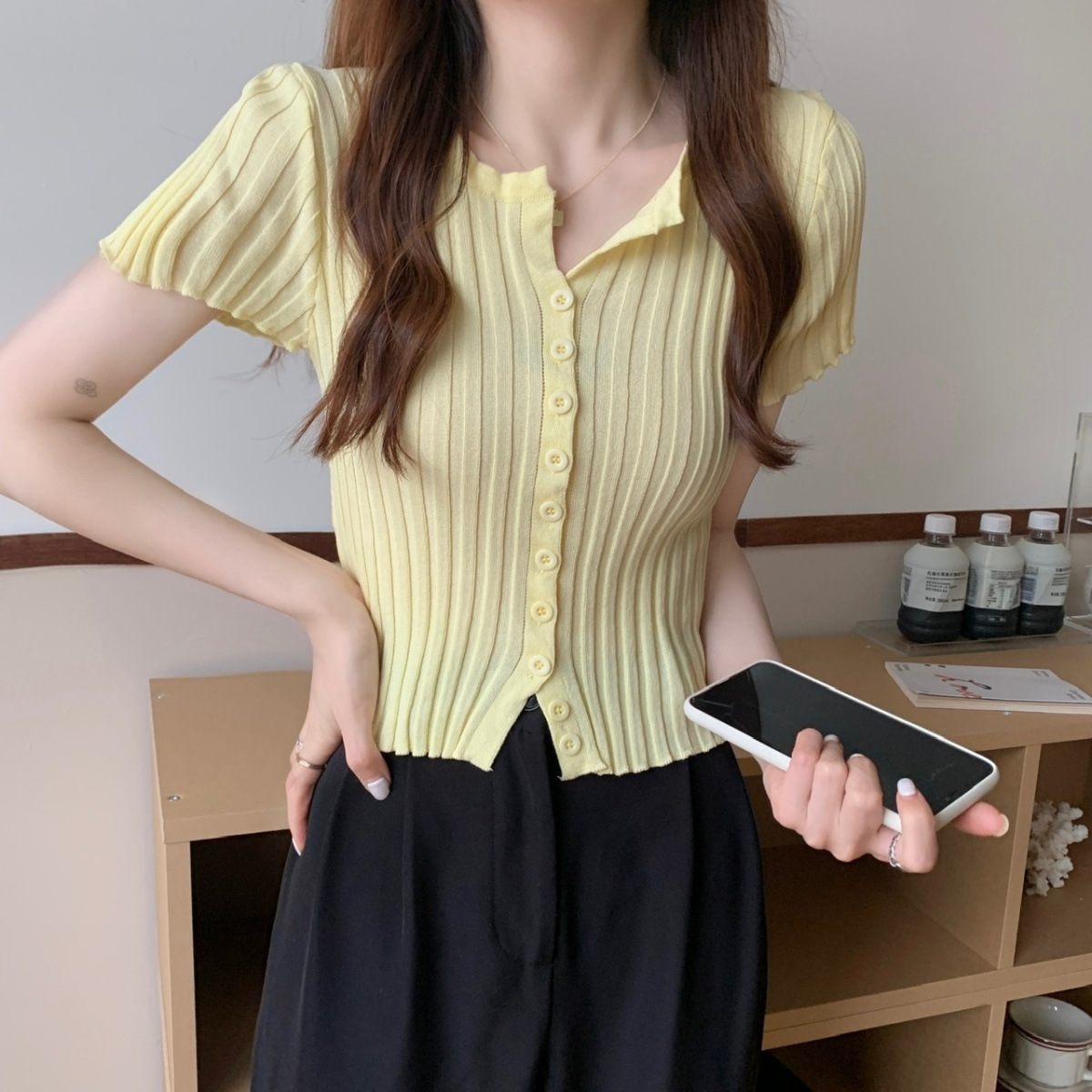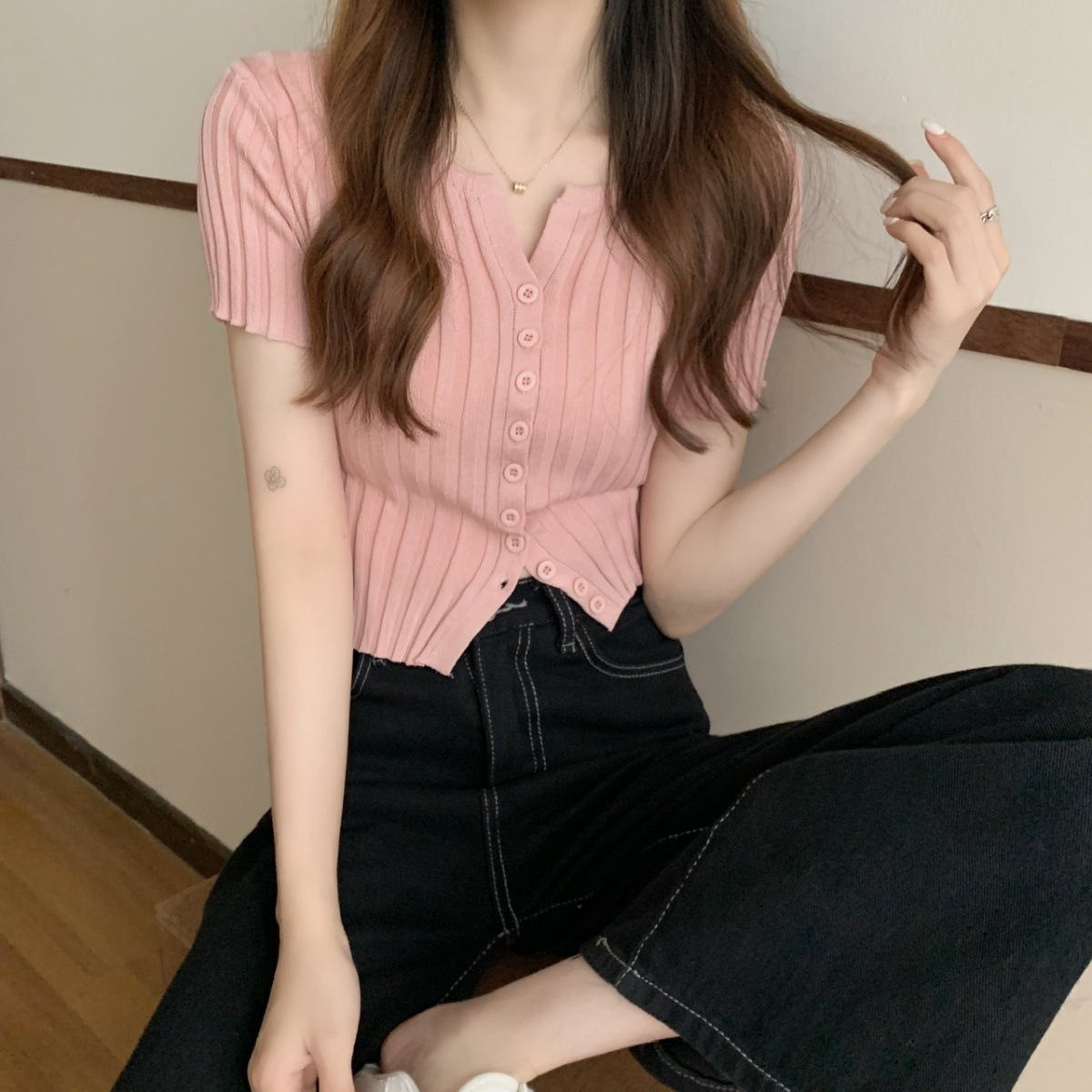 블랙 크롭 하이웨이스트 니트 반팔 티셔츠 여성용 핫걸 타이트핏 숏탑 여름 얇은 스타일 2026 신상스토어 가기
